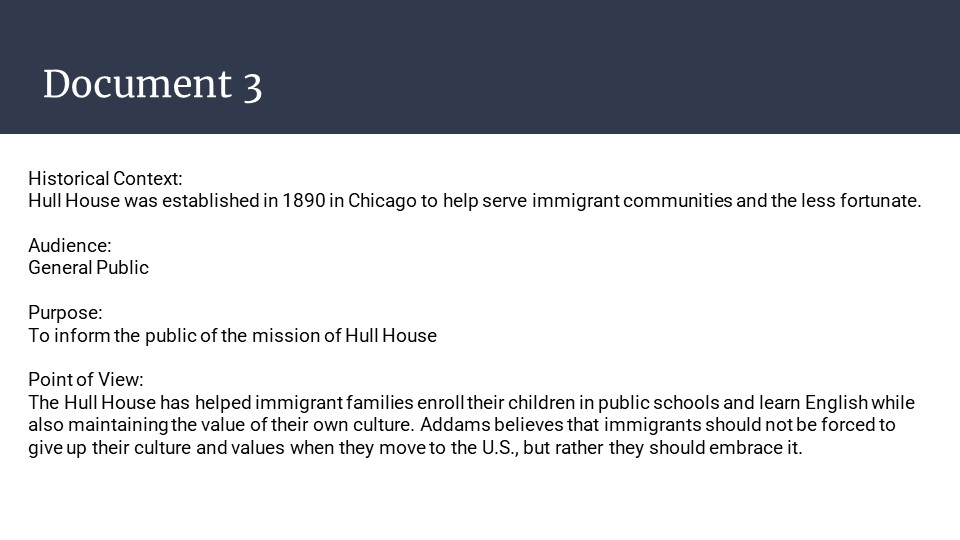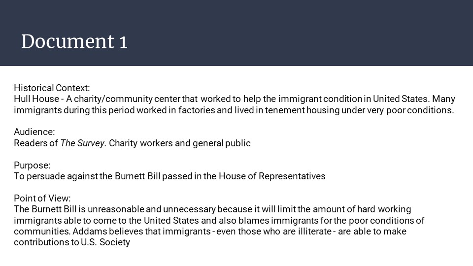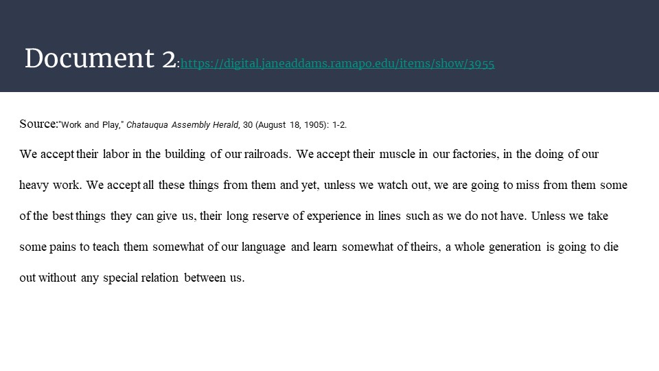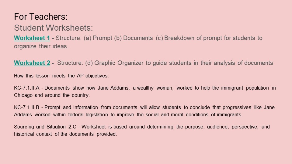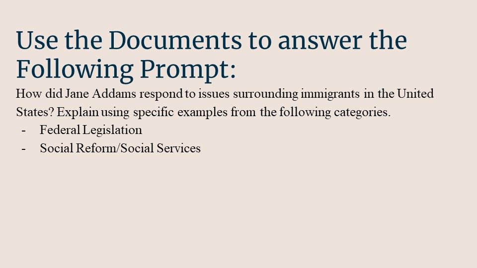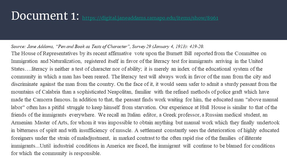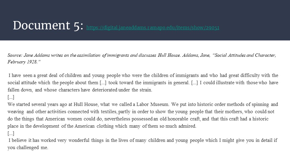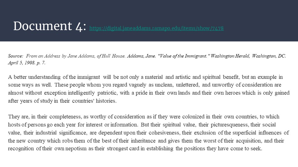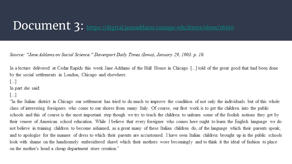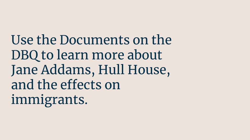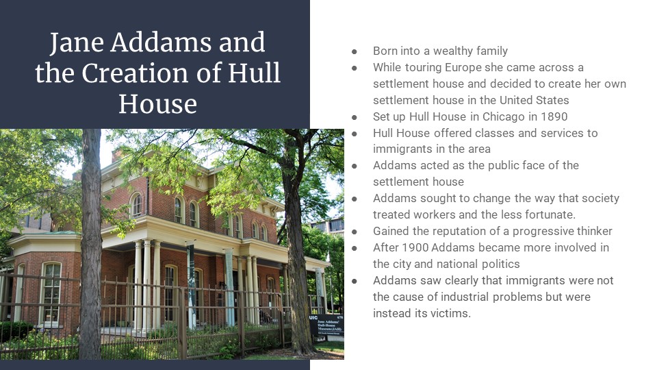 Follow this link to access Jane Addams and Immigration as a downloadable and editable Google Slide deck. Please download the slides and edit as you like. To download a PDF of the slide deck, click here.