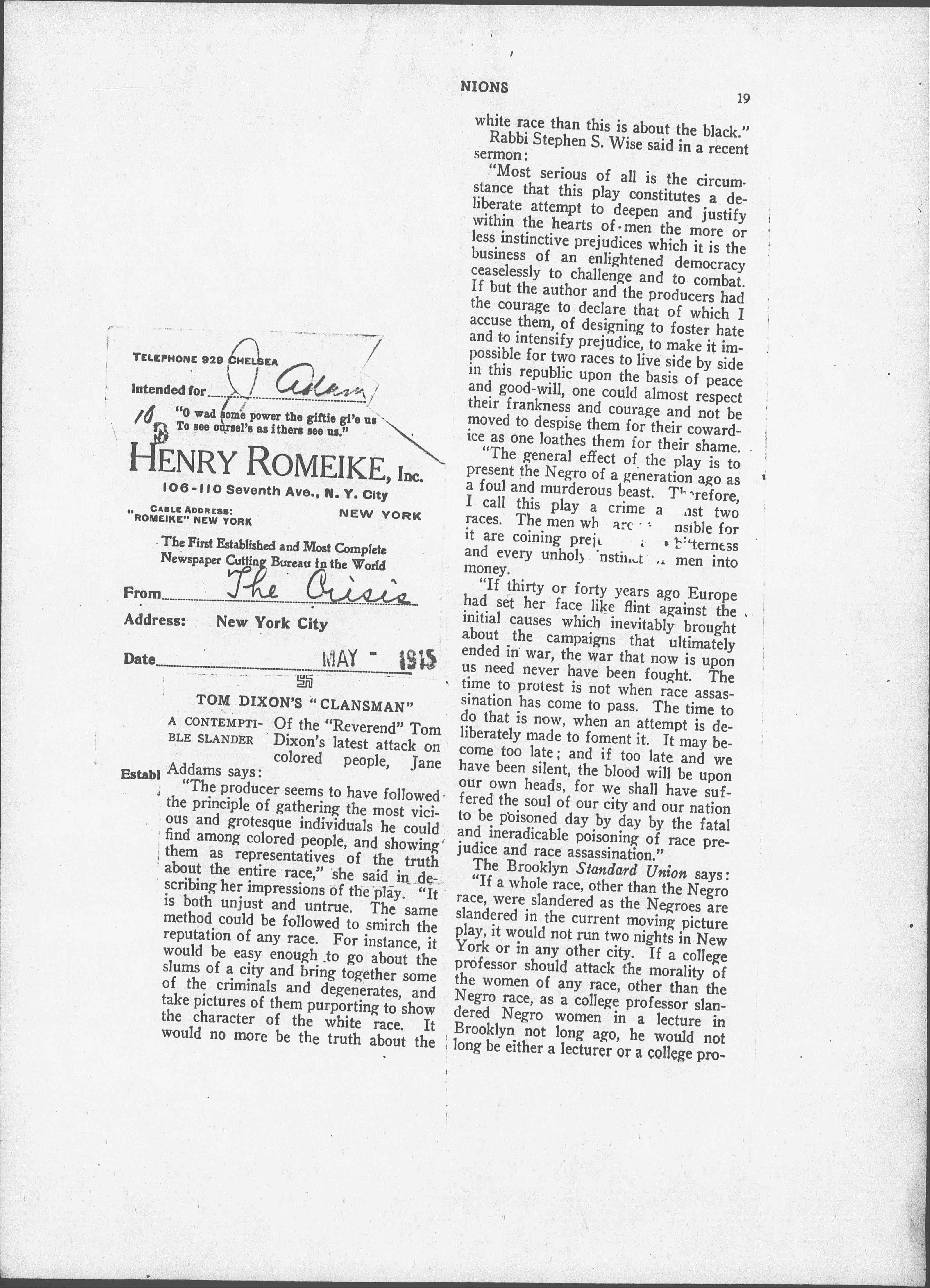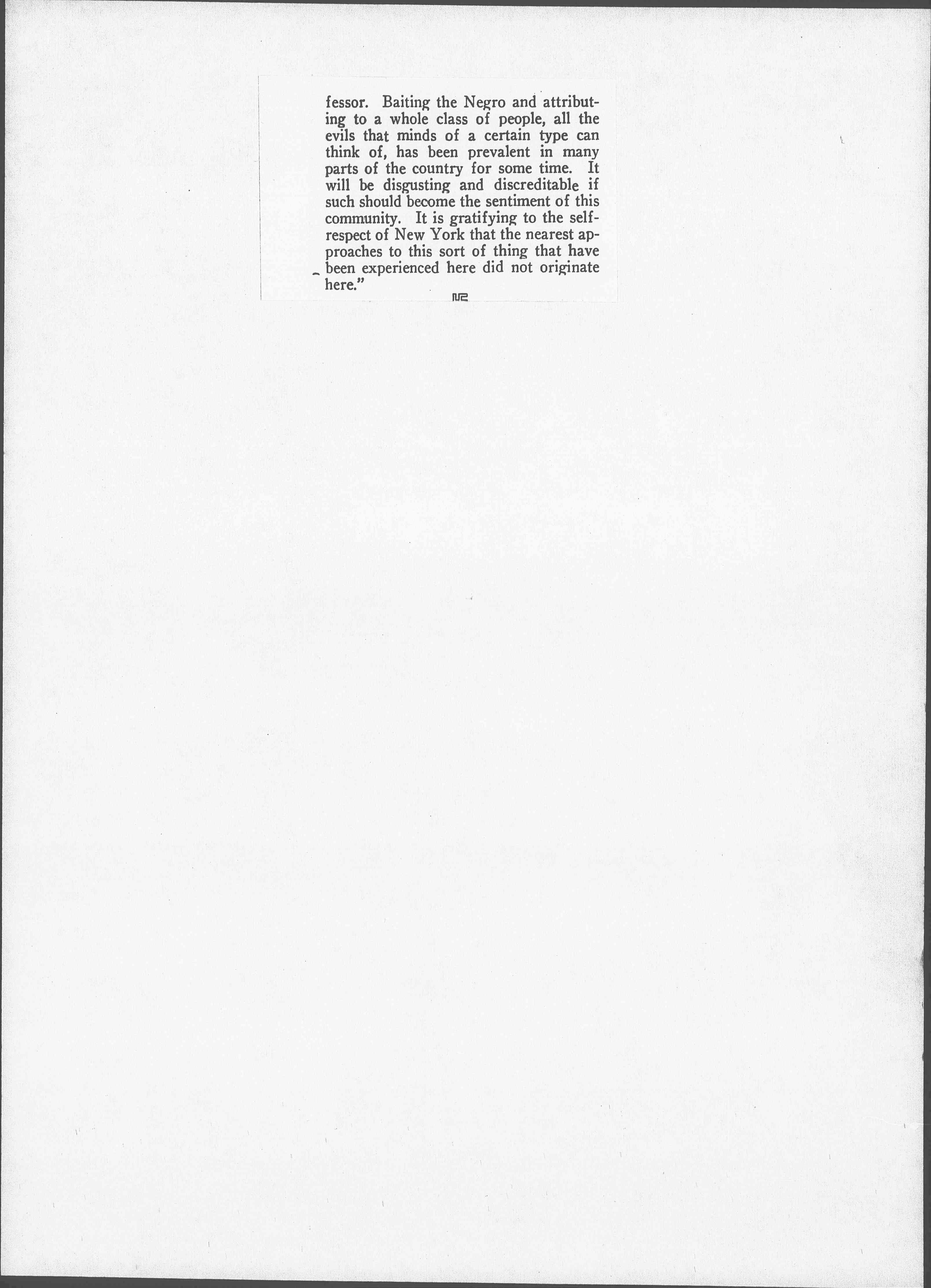 "If a whole race, other than the Negro race, were slandered as the Negroes are slandered in the current moving picture play, it would not run two nights in New York or in any other city. If a college professor should attack the morality of the women of any race, other than the Negro race, as a college professor slandered Negro women in a lecture in Brooklyn not long ago, he would not long be either a lecturer or a college professor. Baiting the Negro and attributing to a whole class of people, all the evils that minds of a certain type can think of, has been prevalent in many parts of the country for some time. It will be disgusting and discreditable if such should become the sentiment of this community. It is gratifying to the self-respect of New York that the nearest approaches to this sort of thing that have been experienced here did not originate here."