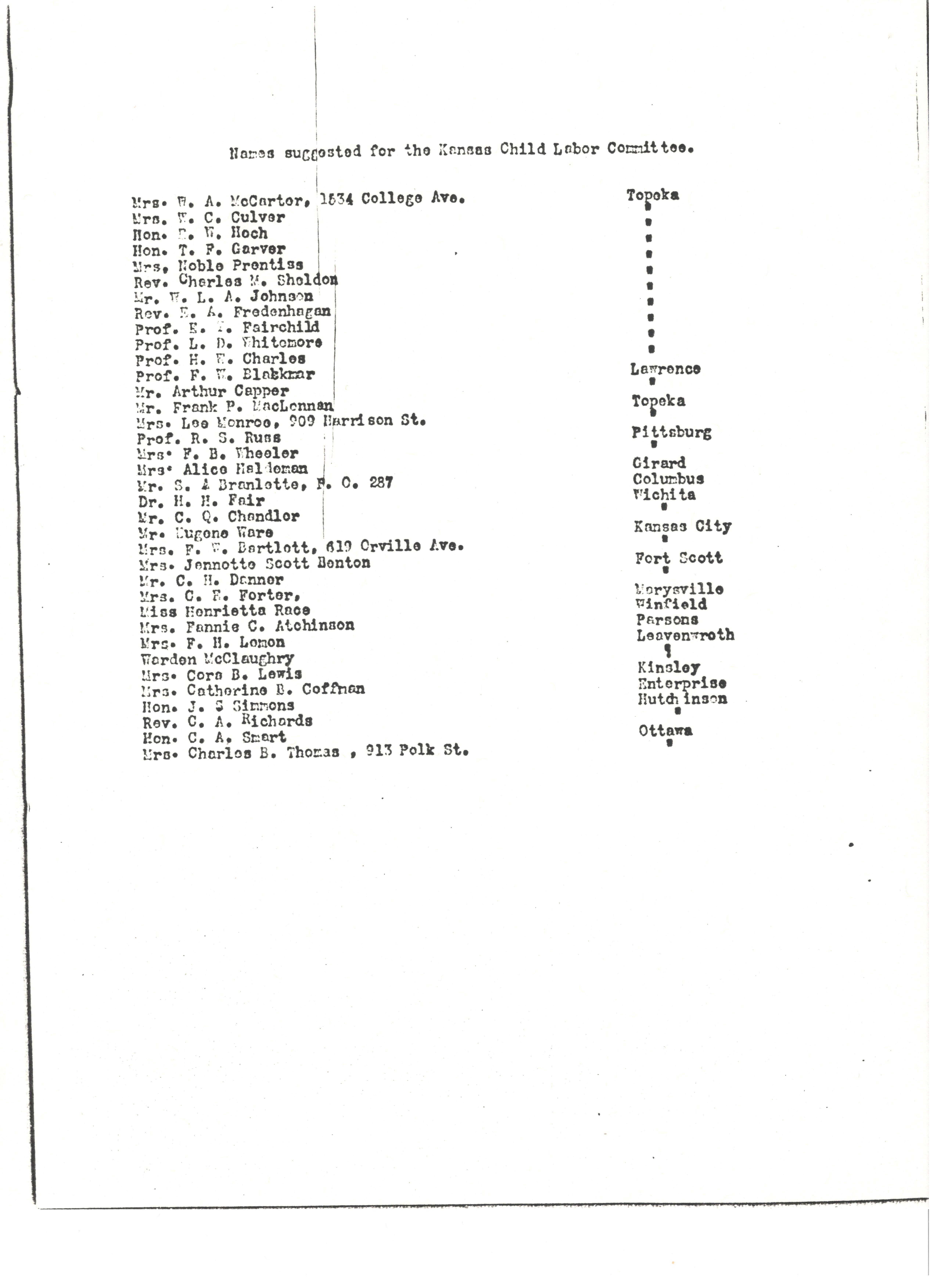 The benefit of such advance it plainly can be seen would be of more than state wide value, and would place Kansas in the attitude of doing her share in the general movement to secure a higher standard of laws on this subject in the states immediately adjoining her, and, indeed, throughout the entire country. For these reasons, those of your citizens most actively interested in this work, believe that Kansas Child Labor Committee composed of representative men and woman foremost in the various interests of the state sehould be formed at once.