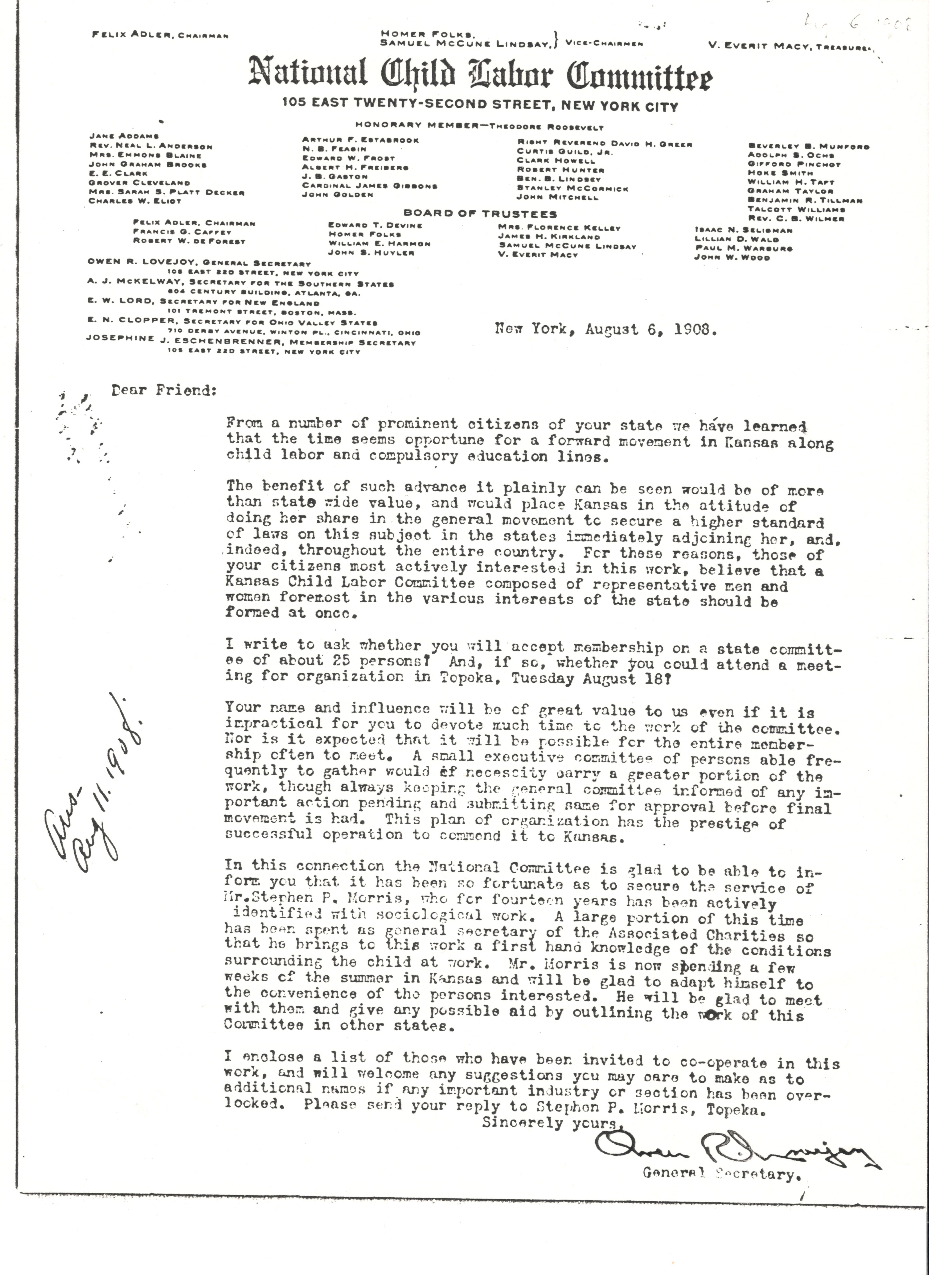 In this connection the National Committee is glad to be able to inform you that it has been so fortunate as to secure the service of Mr. Stephen P. Morris, who for fourteen years has been actively identified with sociological work. A large portion of this time has been spent as general secretary of the Associated Charities so that he brings to this work a first hand knowledge of the conditions surrounding the child at work. Mr. Morris is now spending a few weeks of the summer in Kansas and will be glad to adapt himself to the convenience of the persons interested. He will be glad to meet with them and give any possible aid by outlining the work of this Committee in other states.
