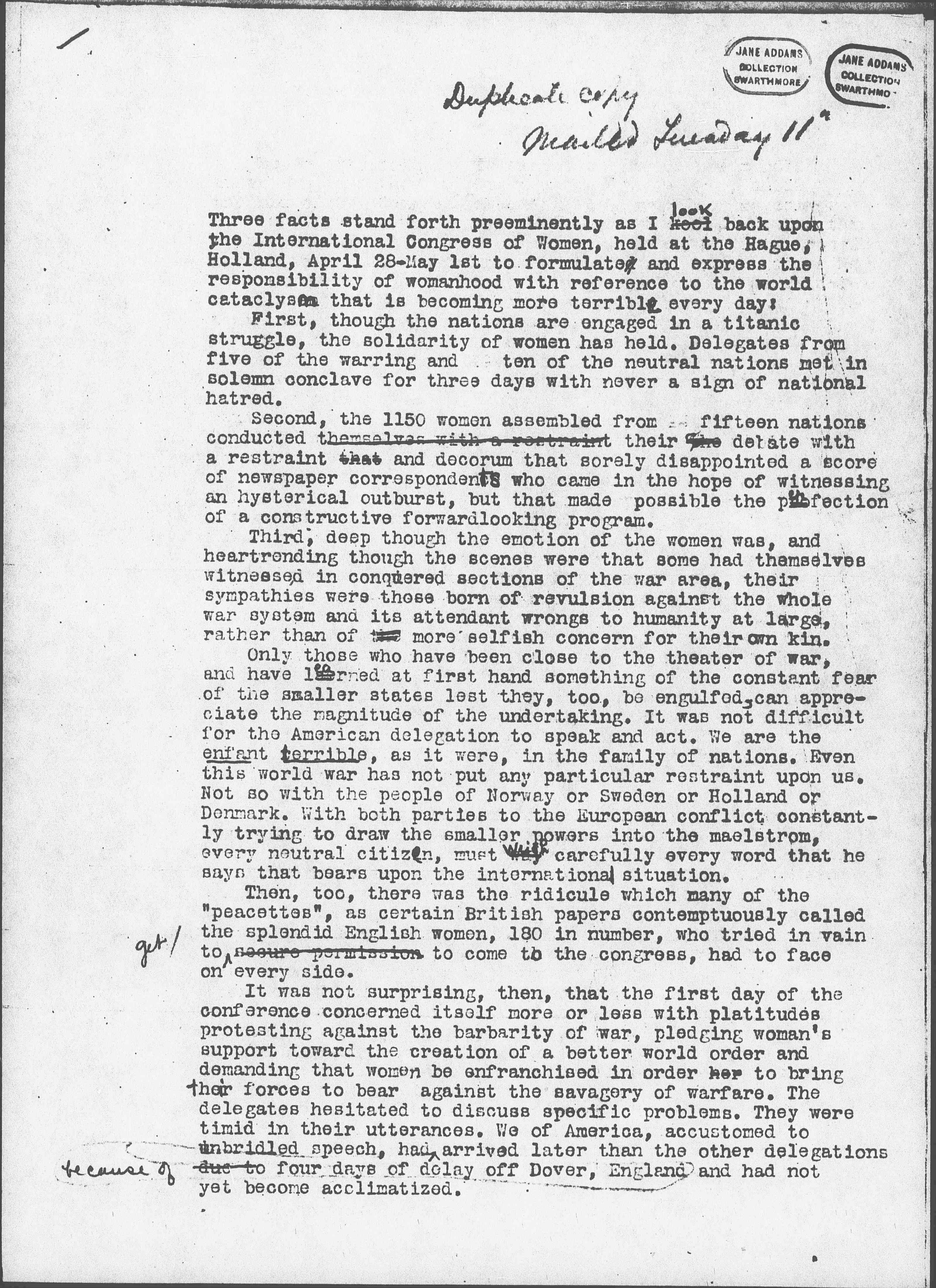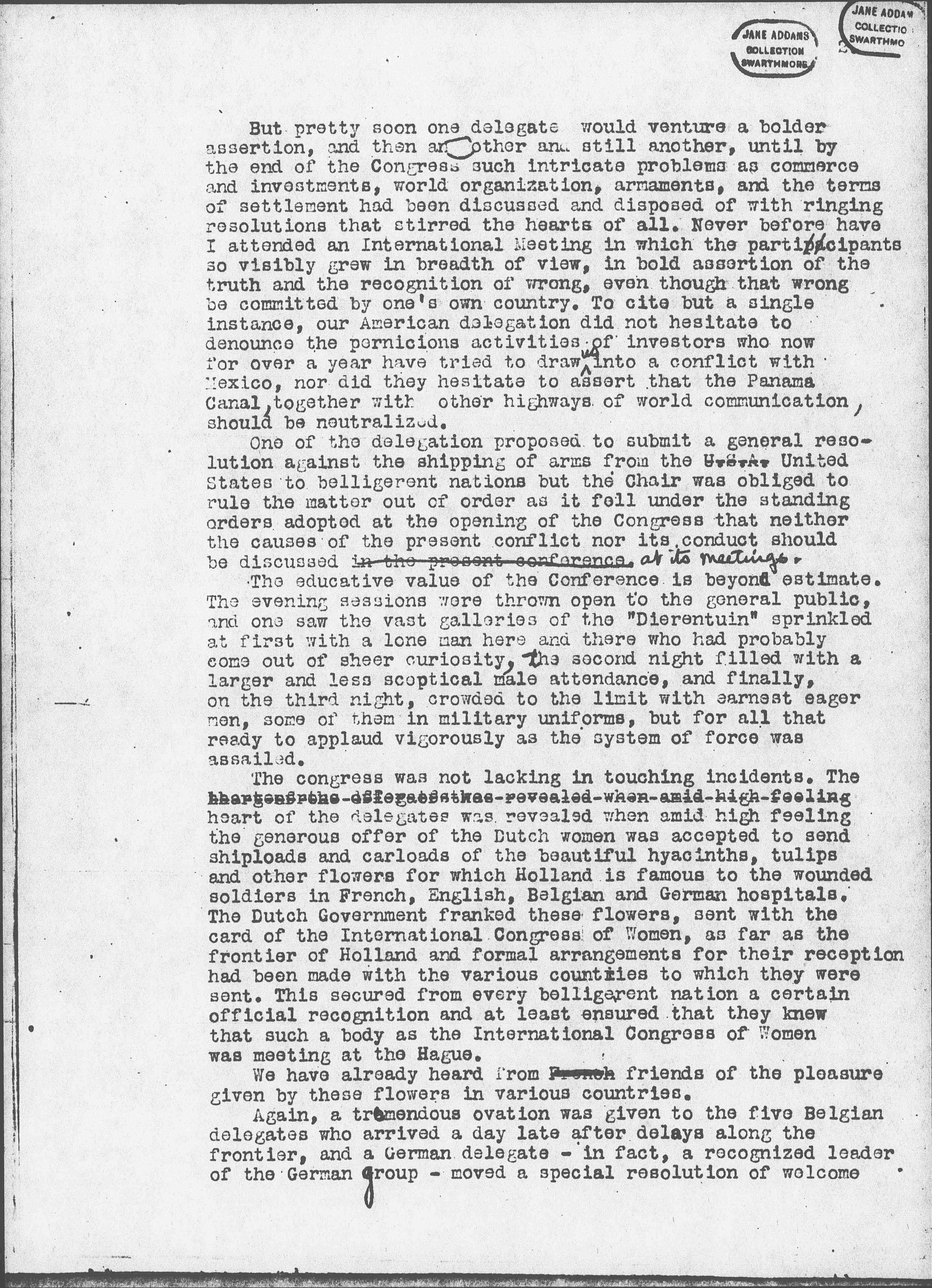 It was not surprising, then, that the first day of the conference concerned itself more or less with platitudes protesting against the barbarity of war, pledging woman's support toward the creation of a better world order and demanding that women be enfranchised in order her to bring their forces to bear against the savagery of warfare. The delegates hesitated to discuss specific problems. They were timid in their utterances. We of America, accustomed to unbridled speech, had arrived later than the other delegations due to <because of> four days of delay off Dover, England and had not yet become acclimatized. [page 2]