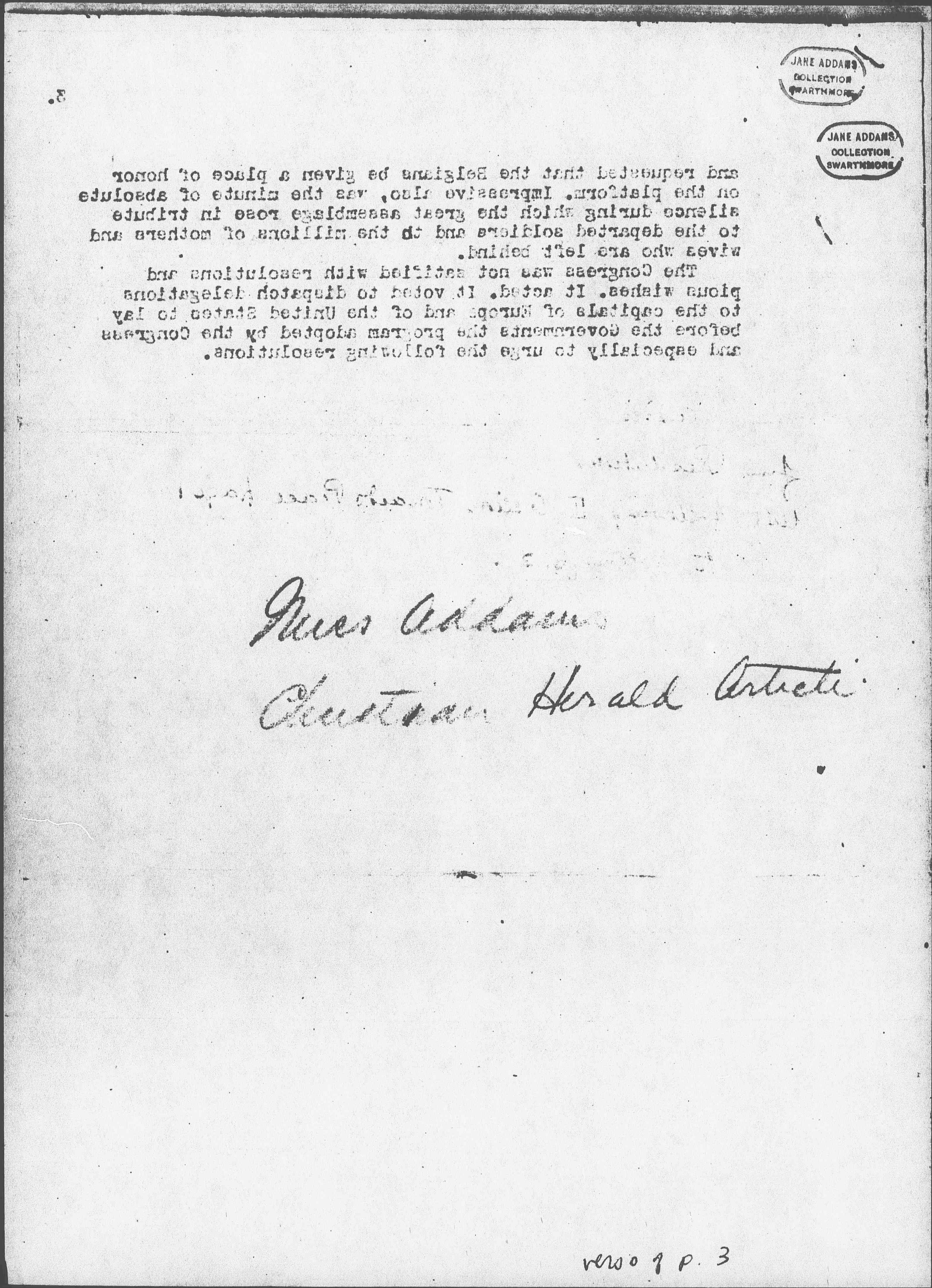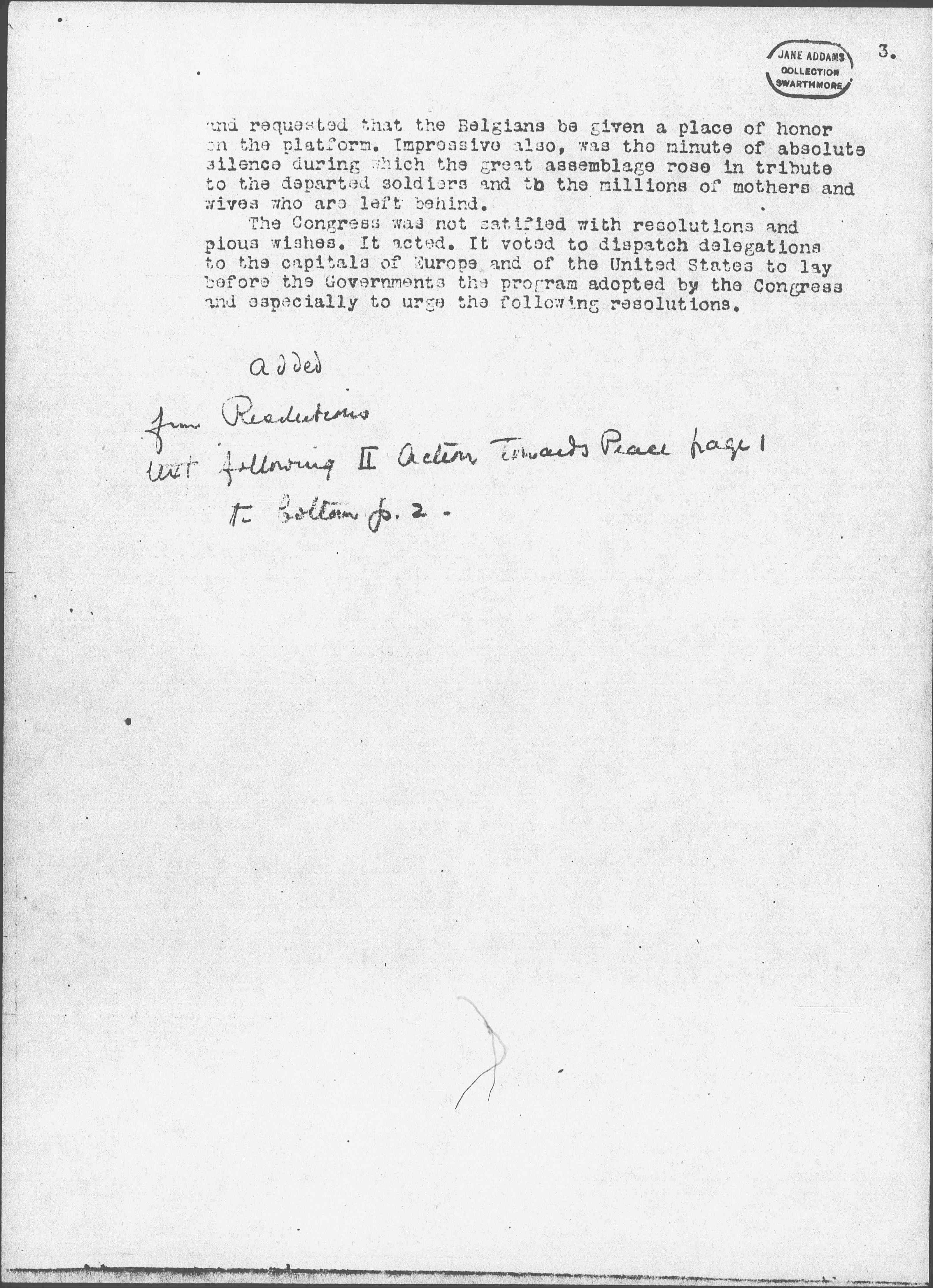 Again, a tremendous ovation was given to the five Belgian delegates who arrived a day late after delays along the frontier, and a German delegate -- in fact, a recognized leader of the German group -- moved a special resolution of welcome [page 3] and requested that the Belgians be given a place of honor on the platform. Impressive also, was the minute of absolute silence during which the great assemblage rose in tribute to the departed soldiers and to the millions of mothers and wives who are left behind.