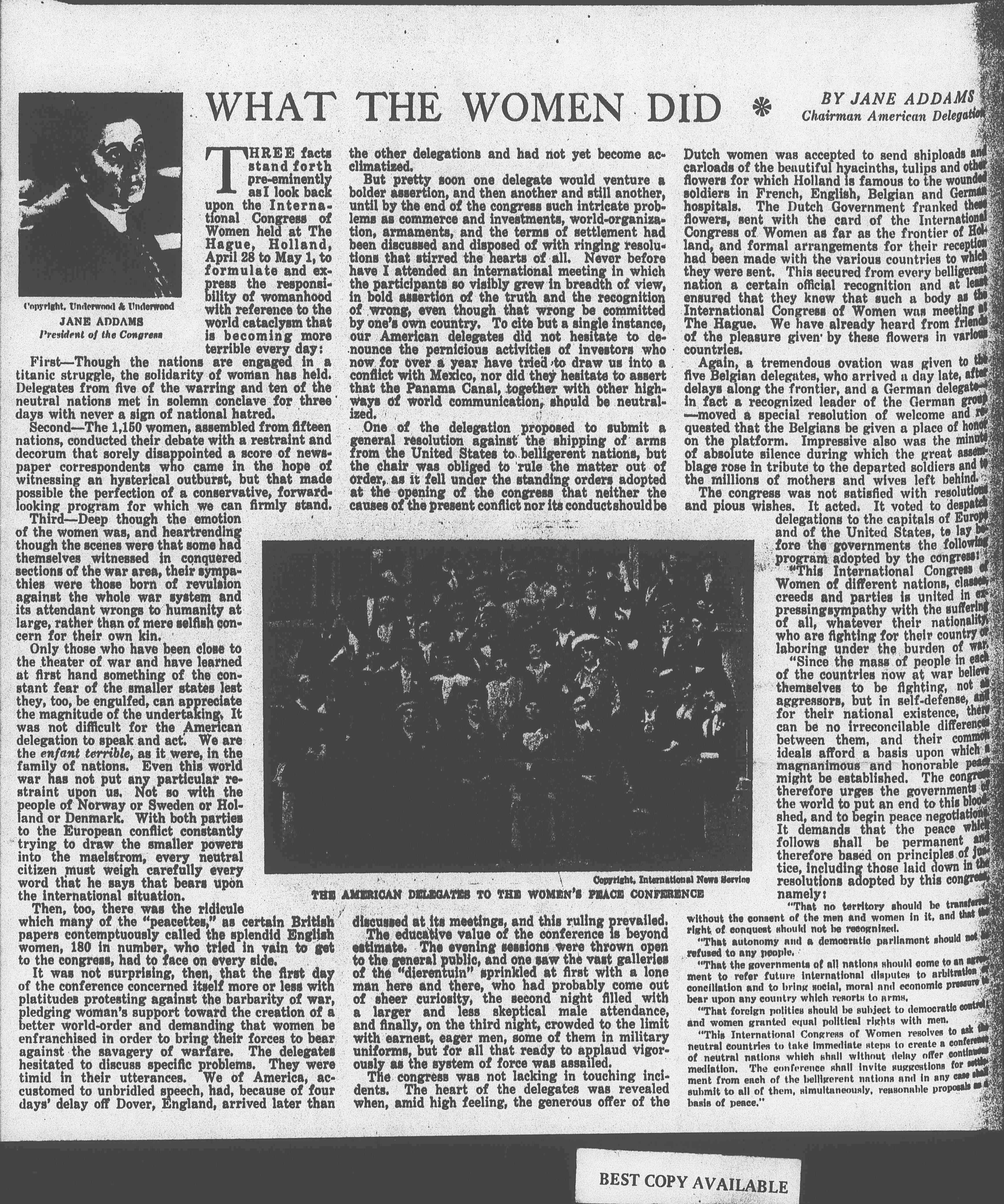 "This International Congress of Women resolves to ask the neutral countries to take immediate steps to create a conference of neutral nations which shall without delay offer continuous mediation. The conference shall invite suggestions for settlement from each of the belligerent nations and in any case shall submit to all of them, simultaneously, reasonable proposals as a basis of peace."