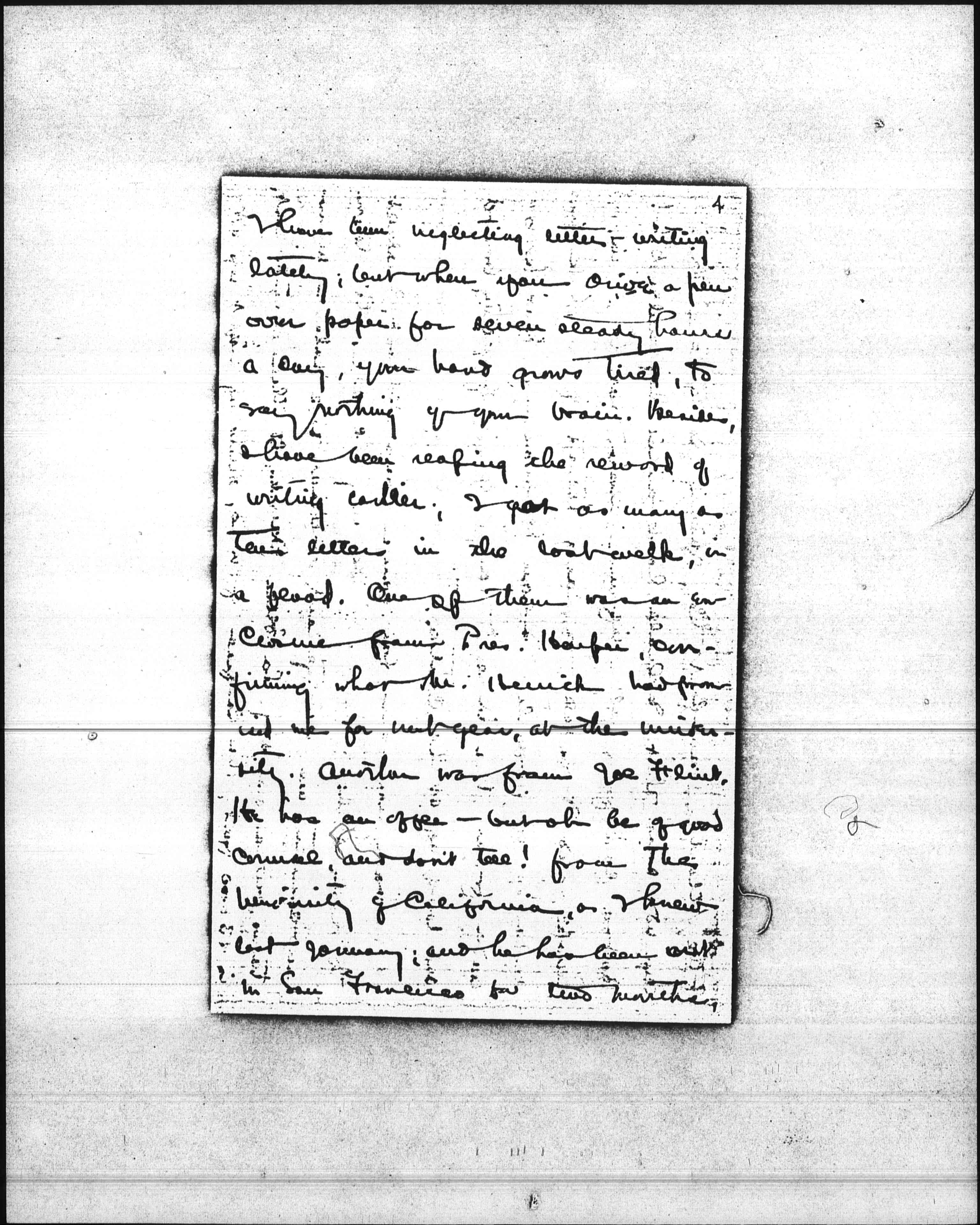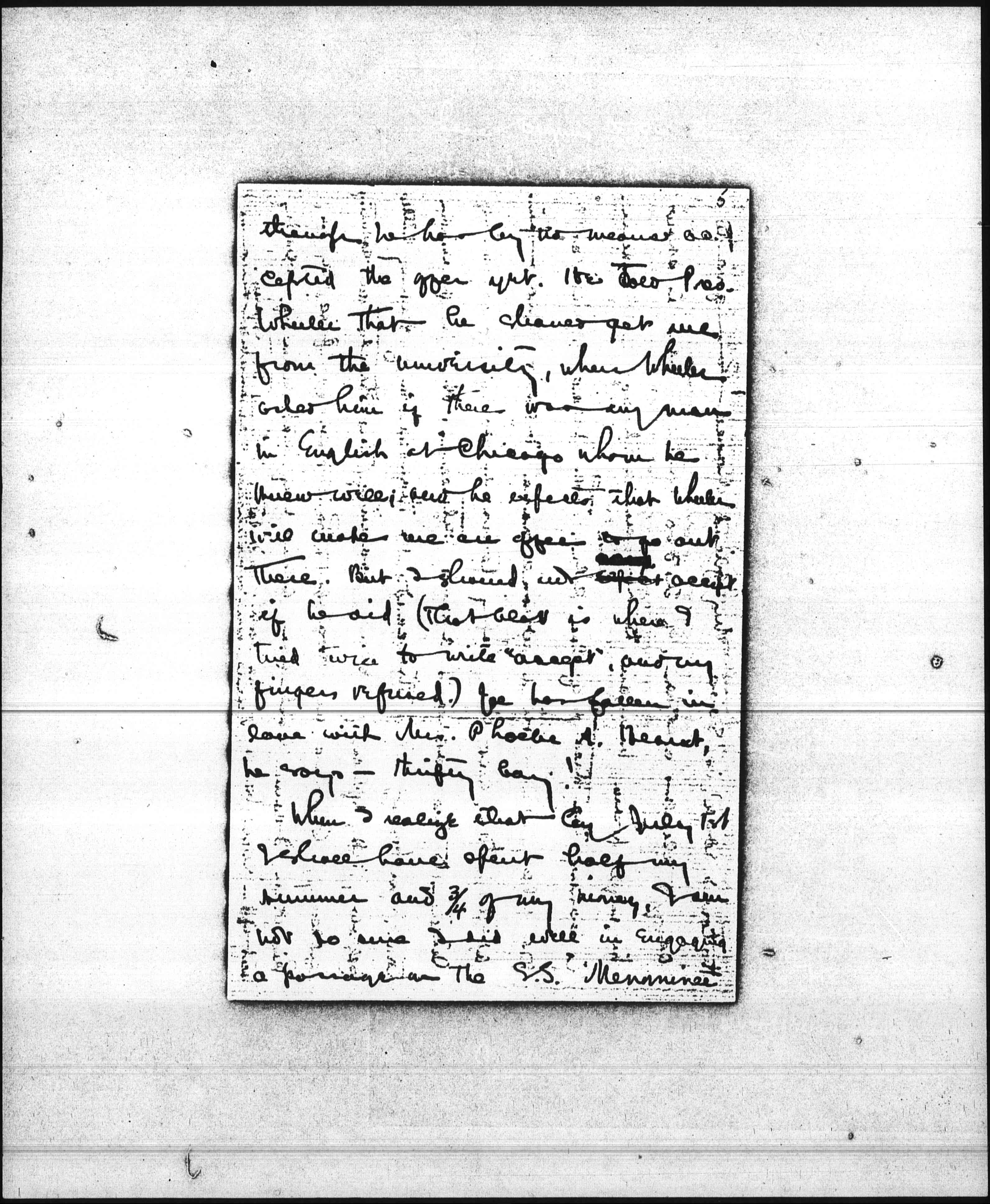 I have been neglecting letter-writing lately, but when you drive a pen over paper for seven steady hours a day, your hand grows tired, to say nothing of your brain. Besides, I have been reaping the reward of writing earlier; I got as many as ten letters in the last week, in a flood. One of them was an enclosure from Pres. Harper, confirming what Mr. Herrick had promised me for next year, at the university. Another was from Joe Flint. He has an offer--but oh be of good counsel, and don't tell! from the University of California, as I knew last January; and he has been out in San Francisco for two months [page 5] though he has by no means accepted the offer yet. He told Pres. Wheeler that should get me from the university, when Wheeler asked him if there was any man in English at Chicago whom he knew well; and he expects that Wheeler will make me an offer to go out there. But I should not [illegible] accept if he did (that blot is when I tried twice to write "accept," and my fingers refused.) He have fallen in love with Mrs Phoebe A. Hearst, he says--thirifty boy!