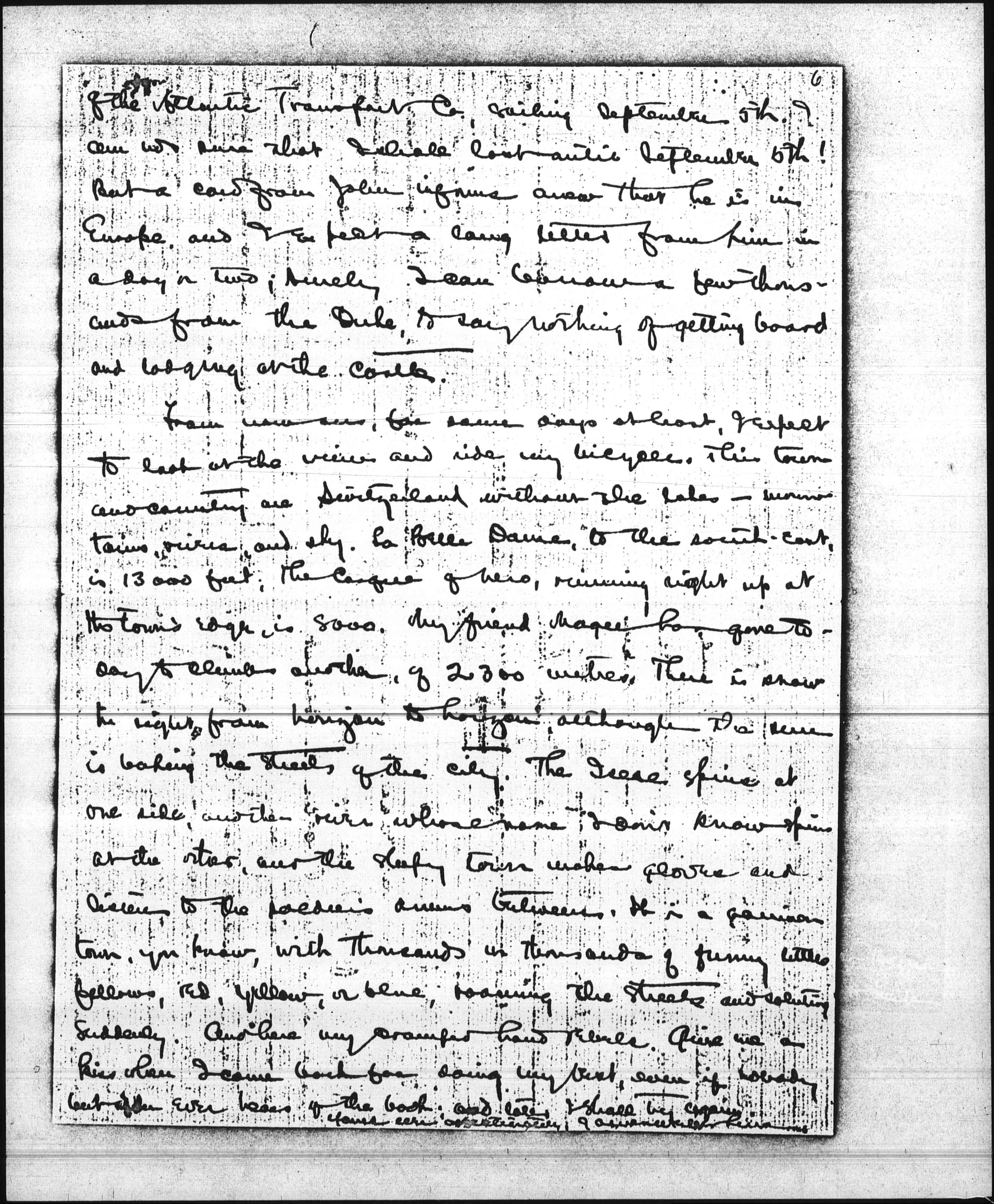 When I realize that by July 1st I shall have spent half my summer and 3/4 of my money, I am not so sure I did well in engaging a passage on the S. S. Menominee [page 6] of the Atlantic Transport Co, sailing September 5th. I am not sure that I shall last until September 5th! But a card from John informs anew that he is in Europe, and I expect a long letter from him in a day or two; surely I can borrow a few thousands from the Duke, to say nothing of getting board and lodging at the castle.
