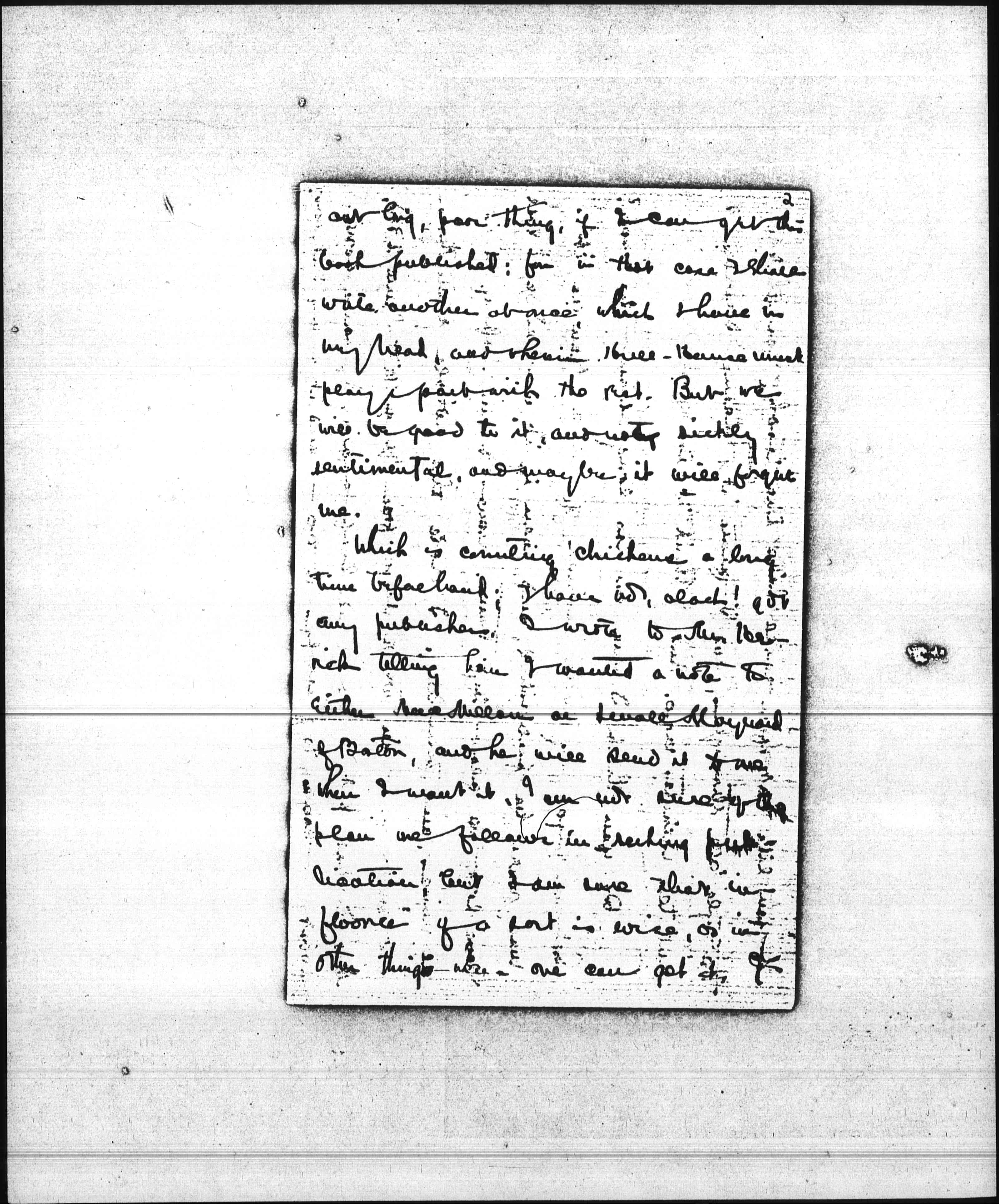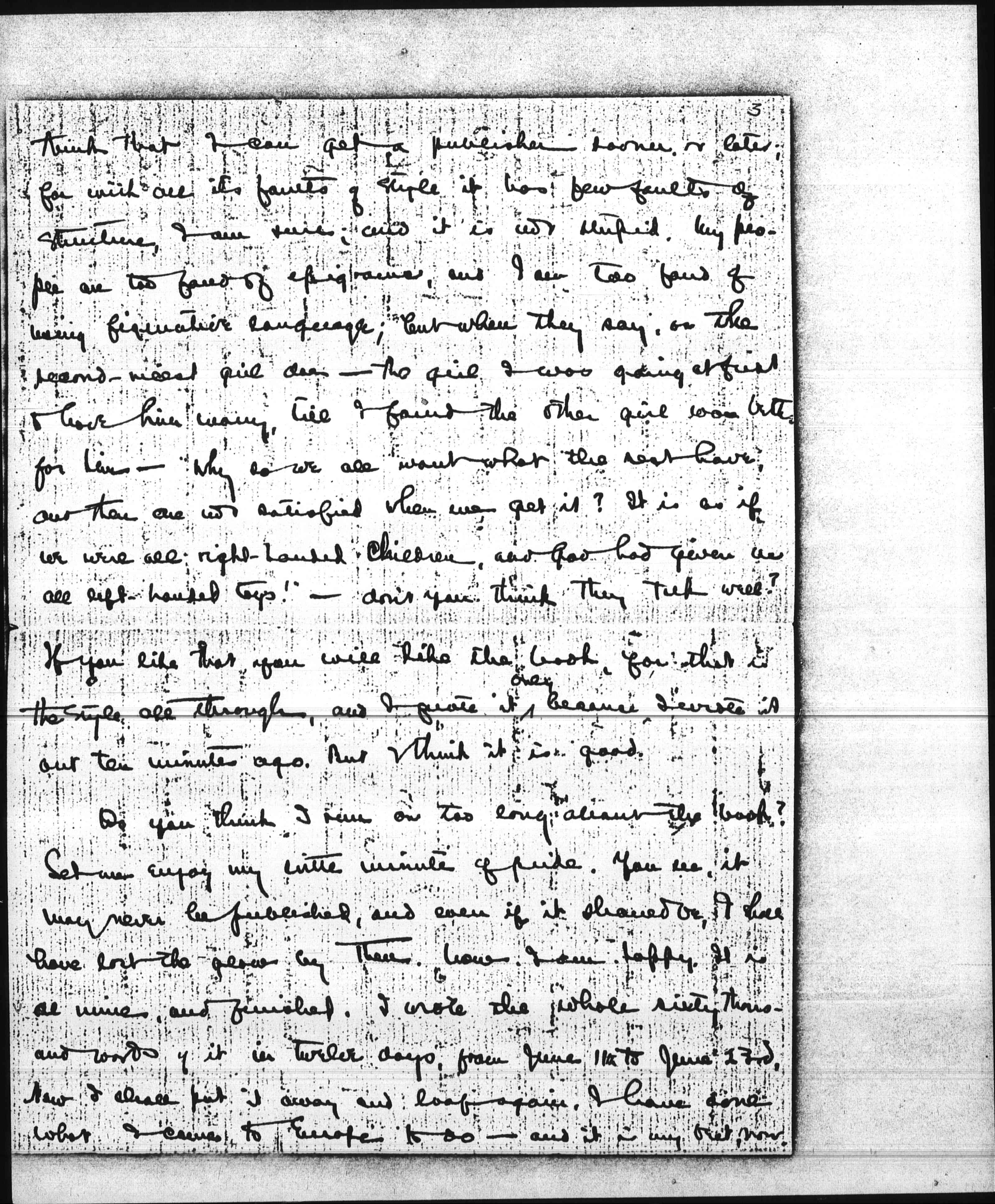 Which is counting chickens a long time beforehand. I have [illegible words] any publisher. I wrote to Mr. Herrick telling him I wanted a note to either MacMillan or Small, Maynard of Boston, and he will send it to me when I want it. I am not sure of the plan he follows in seeking publication, but I am sure that influence of a sort is wise, or in other things where one can get it. I [page 3] think that I can get a publisher sooner or later; for with all of its faults of style it has few faults of structure, I am sure; and it is not stupid. My people are too fond of epigrams, and I am too fond of using figurative language; but when they say, or the second-nicest girl does--the girl I was going at first to have him marry, till I found the other girl was better for him--"Why do we all want what the rest have, another one not satisifed when we get it? It is as if we were all right-handed children, and God had given us left-handed toys!"--don't you think they talk well? If you like that you will like the book, for that is the style all through, and I quote it ↑only↓ because I wrote it out ten minutes ago. But I think it is good.