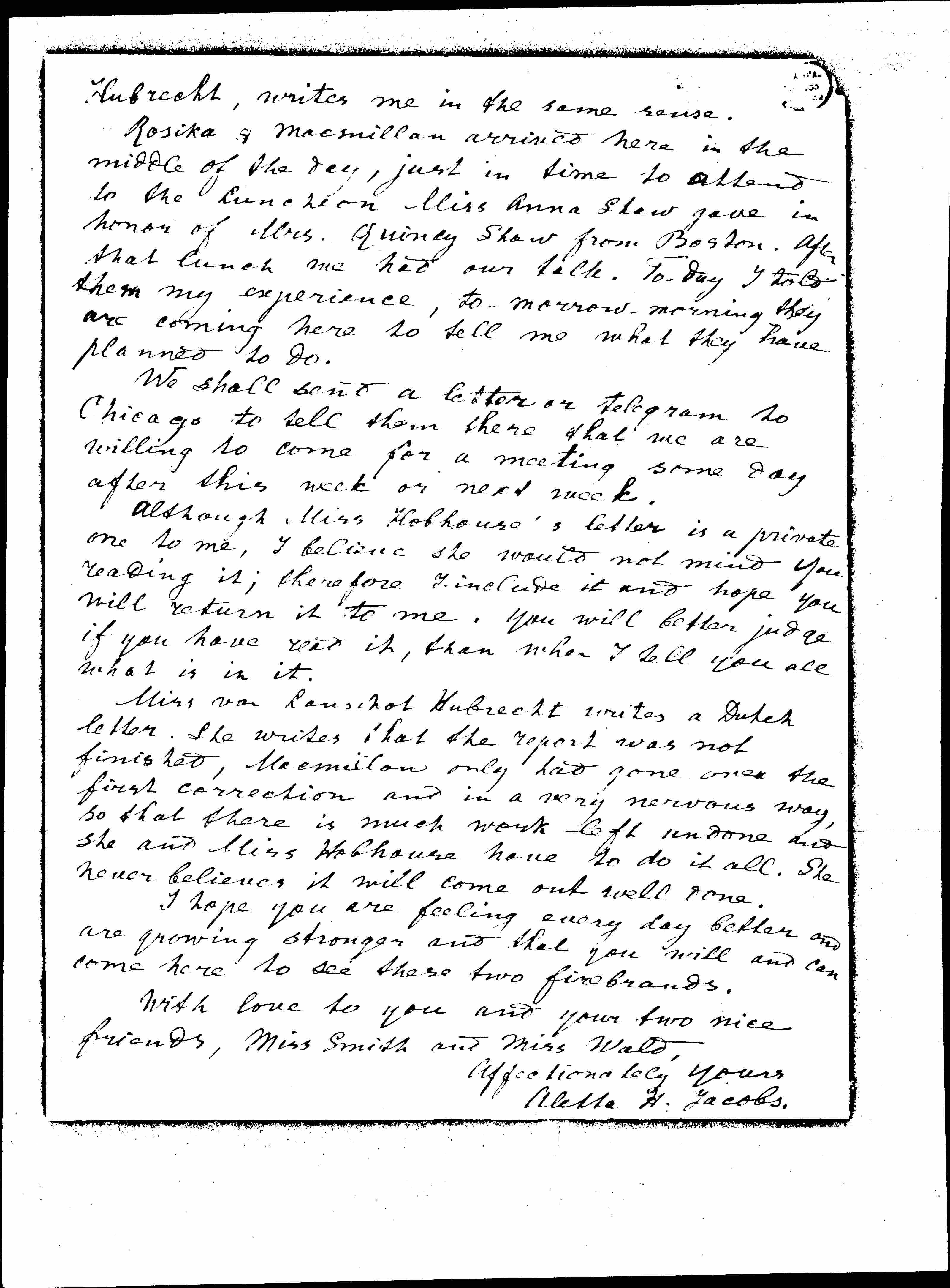 Rosika & Macmillan arrived here in the middle of the day, just in time to attend to the luncheon Miss Anna Shaw gave in honor of Mrs. Quincy Shaw from Boston. After that lunch we had our talk. [Today] I told them my experience, [tomorrow] morning they are coming here to tell me what they have planned to do.