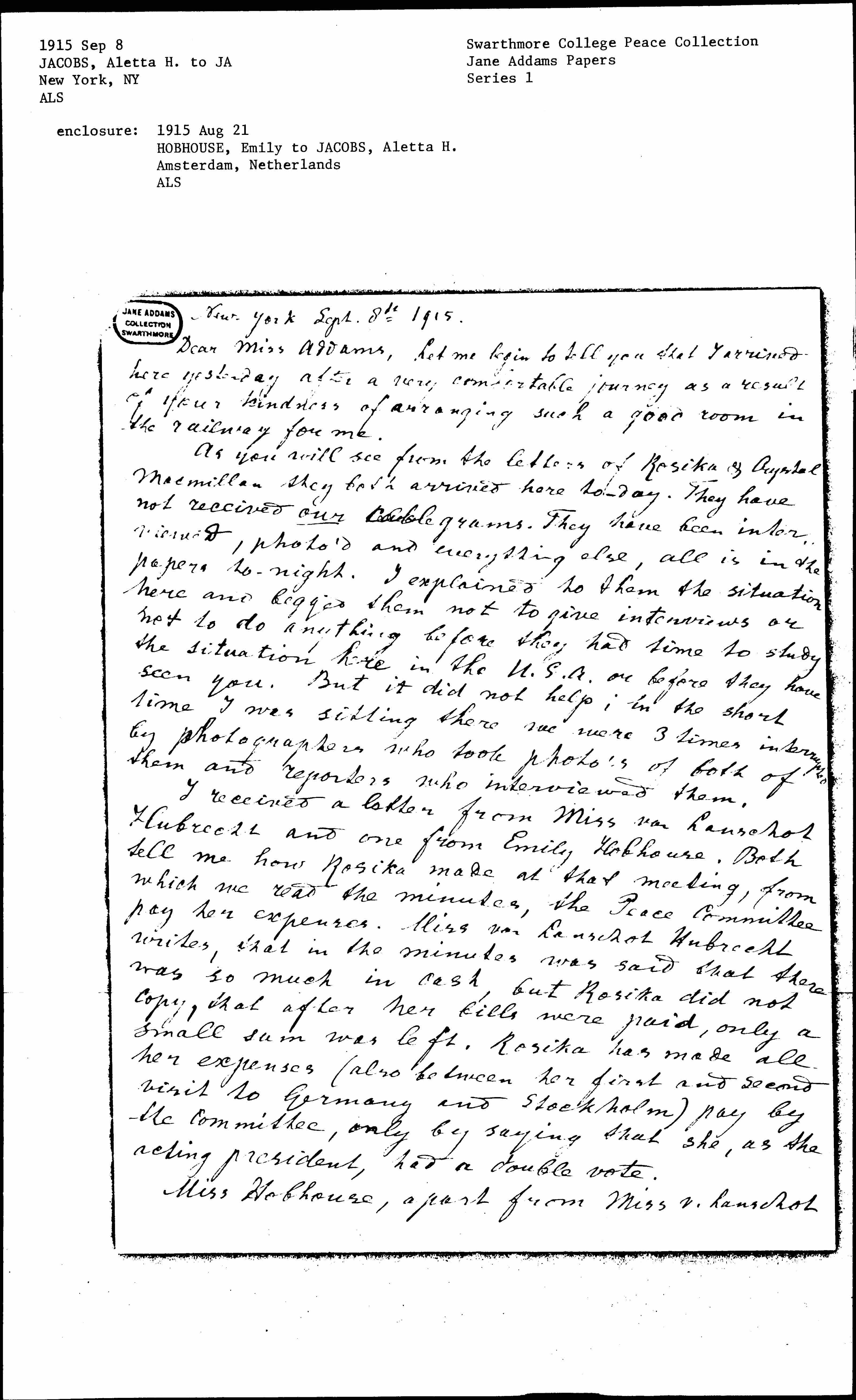 As you will see from the letters of Rosika & Chrystal Macmillan they both arrived here [today]. They have not received our cablegrams. They have been interviewed, photo'd and everything else, all is in the papers [tonight]. I explained to them the situation here and begged them not to give interviews or not to do anything before they had time to study the situation here in the U.S.A. or before they have seen you. But it did not help; in the short time I was sitting there we were 3 times interrupted by photographers who took [photos] of both of them and reporters who interviewed them.