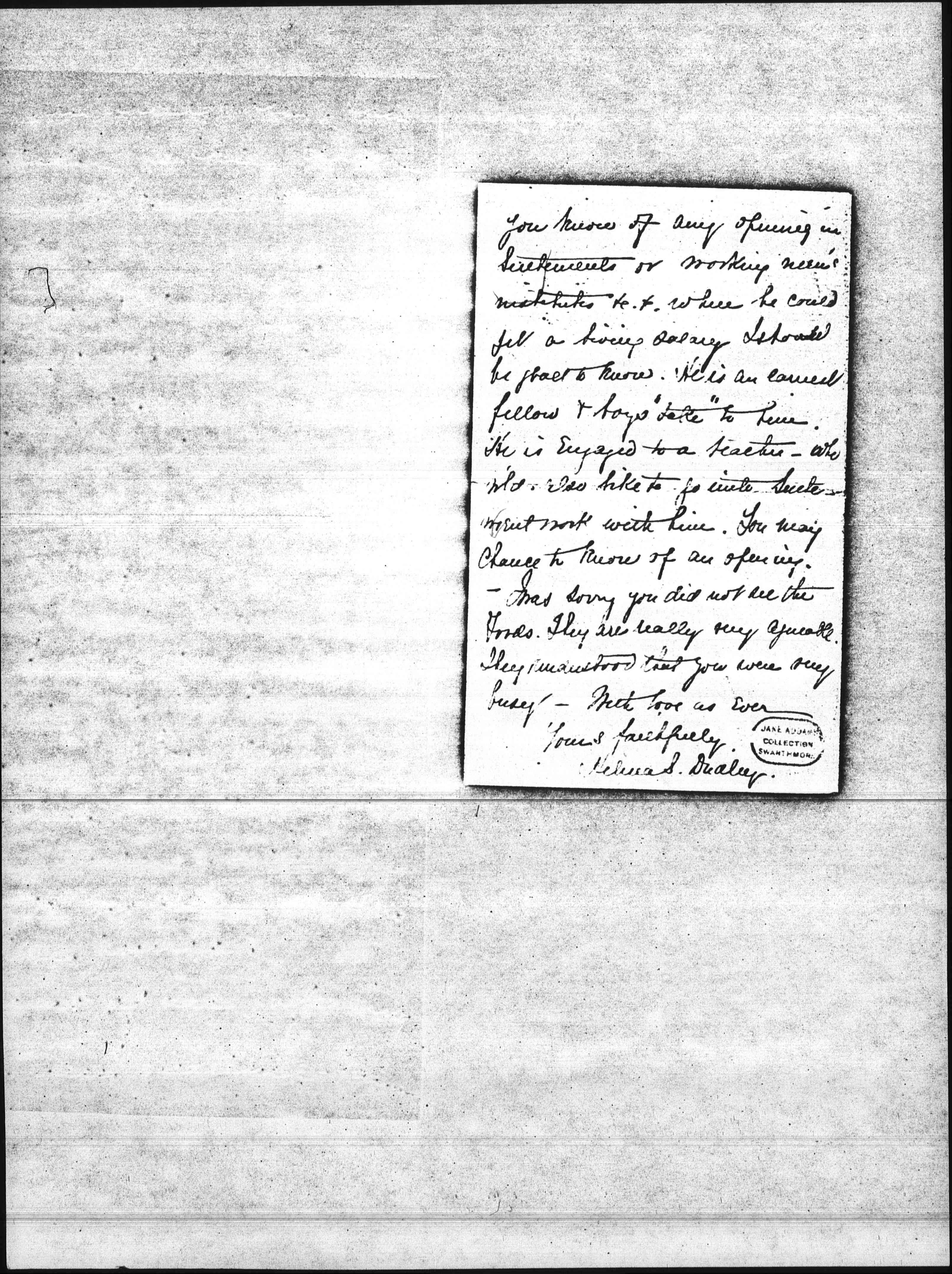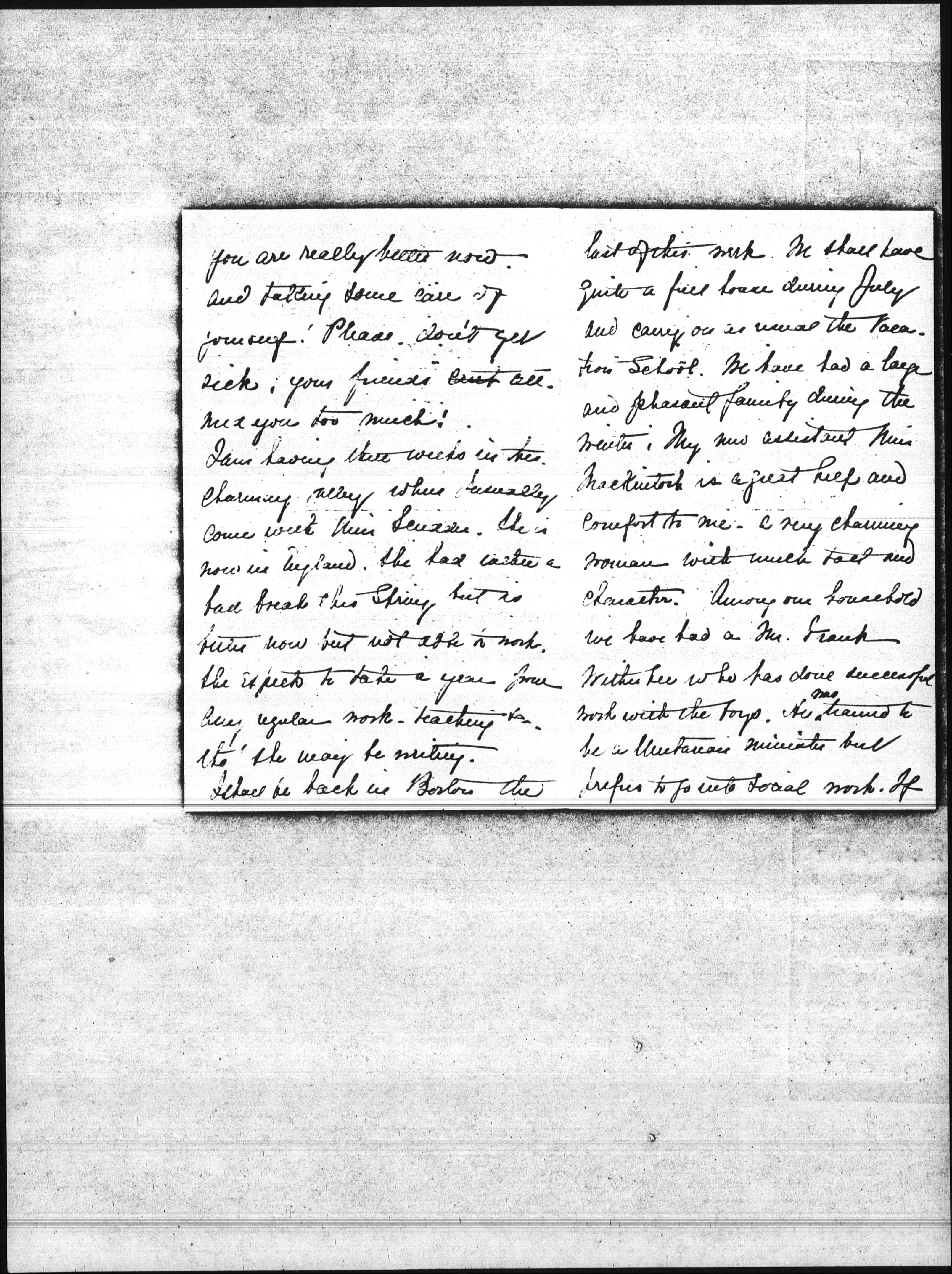 I shall be back in Boston the [page 3] last of this week. We shall have quite a full house during July and carry on as usual the [Vacation] School. We have had a large and pleasant family during the winter. My new assistant Miss Mackintosh is a great help and comfort to me--a very charming woman with much tact and character. Among our household we have had a Mr Frank [Witherbee] who has done successful work with the boys. He <was> trained to be a Unitarian minister but prefers to go into social work. If [page 4] you know of any opening in Settlements or working men's institutes [etc.] where he could get a living salary I should be glad to know. He is an earnest fellow & boys "take" to him.