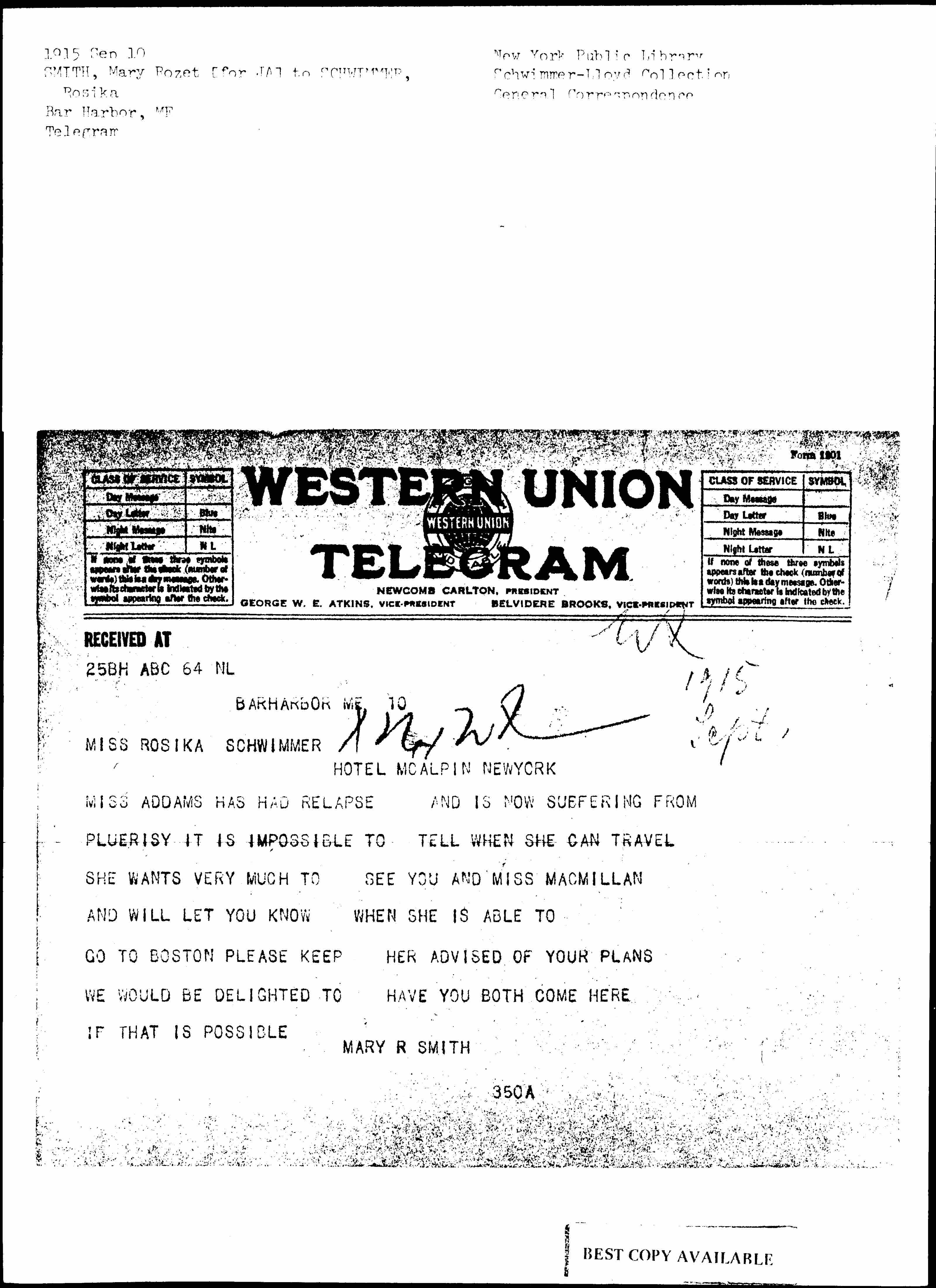 MISS ADDAMS HAS HAD RELAPSE AND IS NOW SUFFERING FROM [PLEURISY] IT IS IMPOSSIBLE TO TELL WHEN SHE CAN TRAVEL SHE WANTS VERY MUCH TO SEE YOU AND MISS MACMILLAN AND WILL LET YOU KNOW WHEN SHE IS ABLE TO GO TO BOSTON PLEASE KEEP HER ADVISED OF YOUR PLANS WE WOULD BE DELIGHTED TO HAVE YOU BOTH COME HERE IF THAT IS POSSIBLE