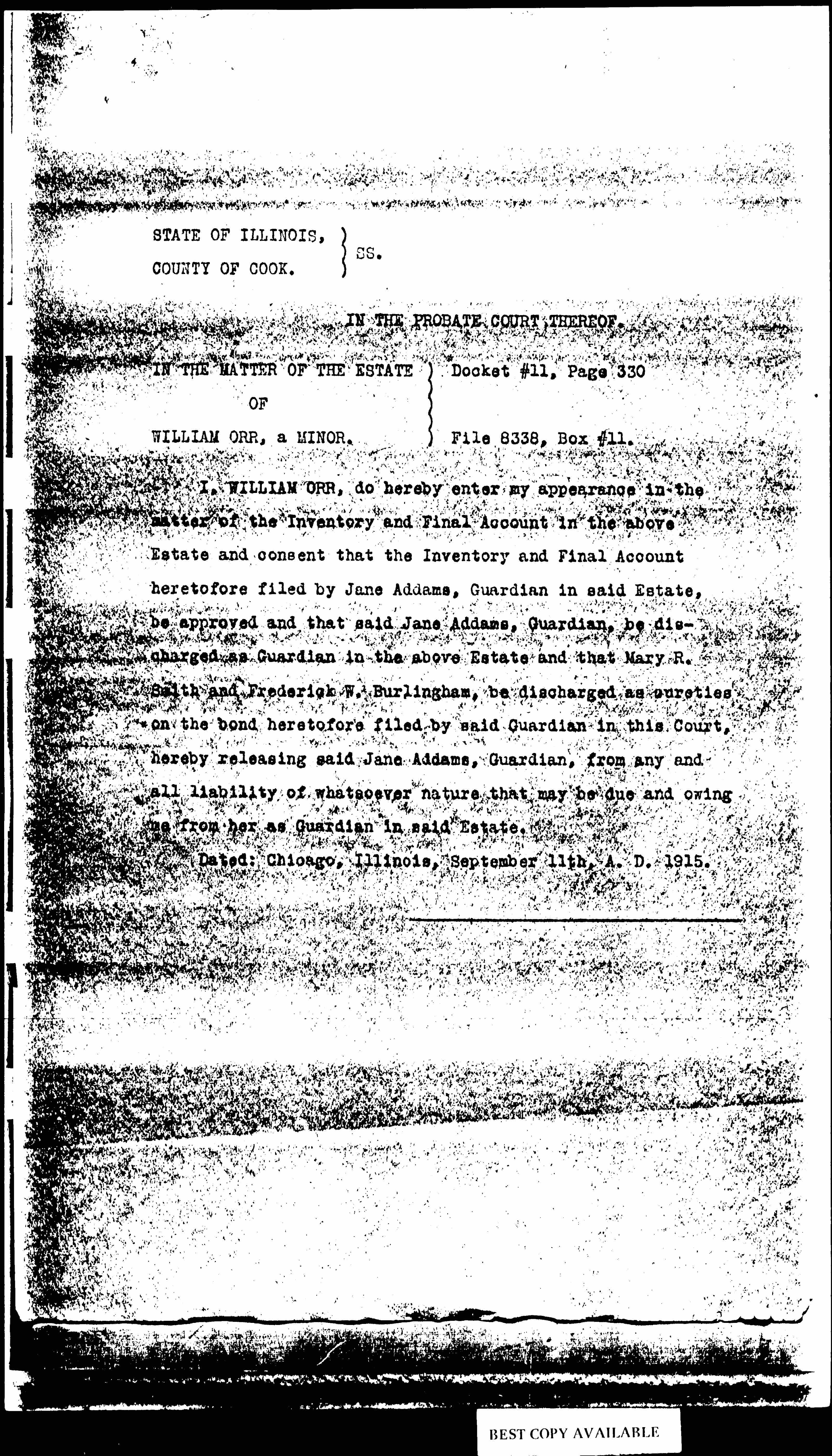 I, WILLIAM ORR, do hereby enter my appearance in the matter of the Inventory and Final Account in the above Estate and consent that the Inventory and Final Account heretofore filed by Jane Addams, Guardian in said Estate, be approved and that said Jane Addams, Guardian, be discharged as Guardian in the above Estate and that Mary R. Smith and Frederick W. Burlingham, be discharged as sureties on the bond heretofore filed by said Guardian in this Court, hereby releasing said Jane Addams, Guardian, from any and all liability of whatsoever nature that may be due and owing me from her as Guardian in said Estate.