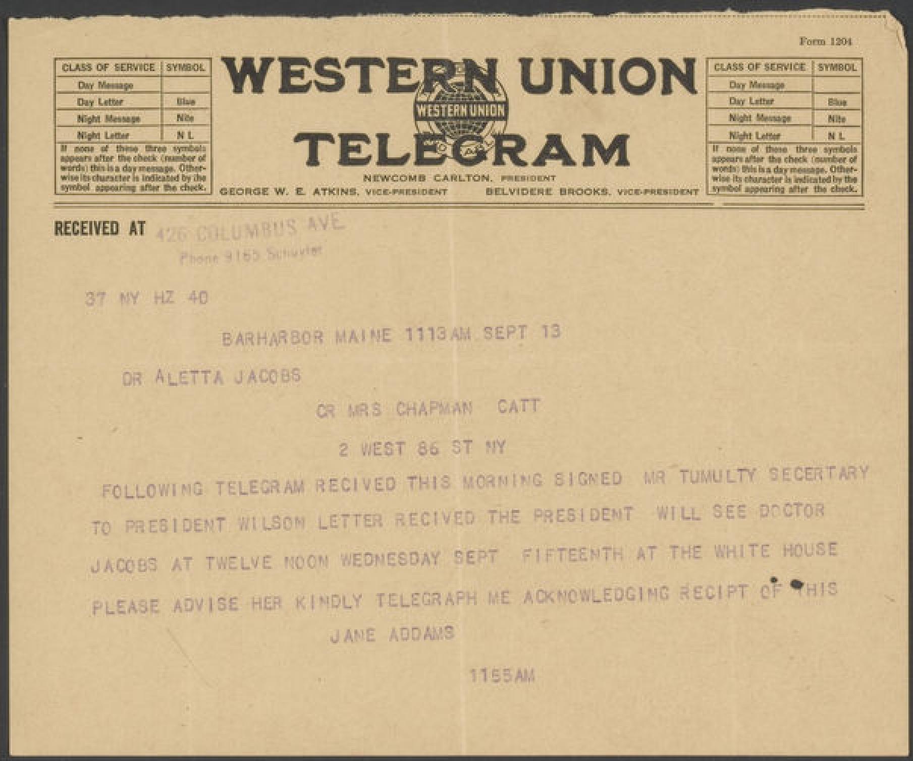 FOLLOWING TELEGRAM RECEIVED THIS MORNING SIGNED MR TUMULTY SECRETARY TO PRESIDENT WILSON LETTER [RECEIVED] THE PRESIDENT WILL SEE DOCTOR JACOBS AT TWELVE NOON WEDNESDAY SEPT FIFTEENTH AT THE WHITE HOUSE PLEASE ADVISE HER KINDLY TELEGRAPH ME ACKNOWLEDGING [RECEIPT] OF THIS