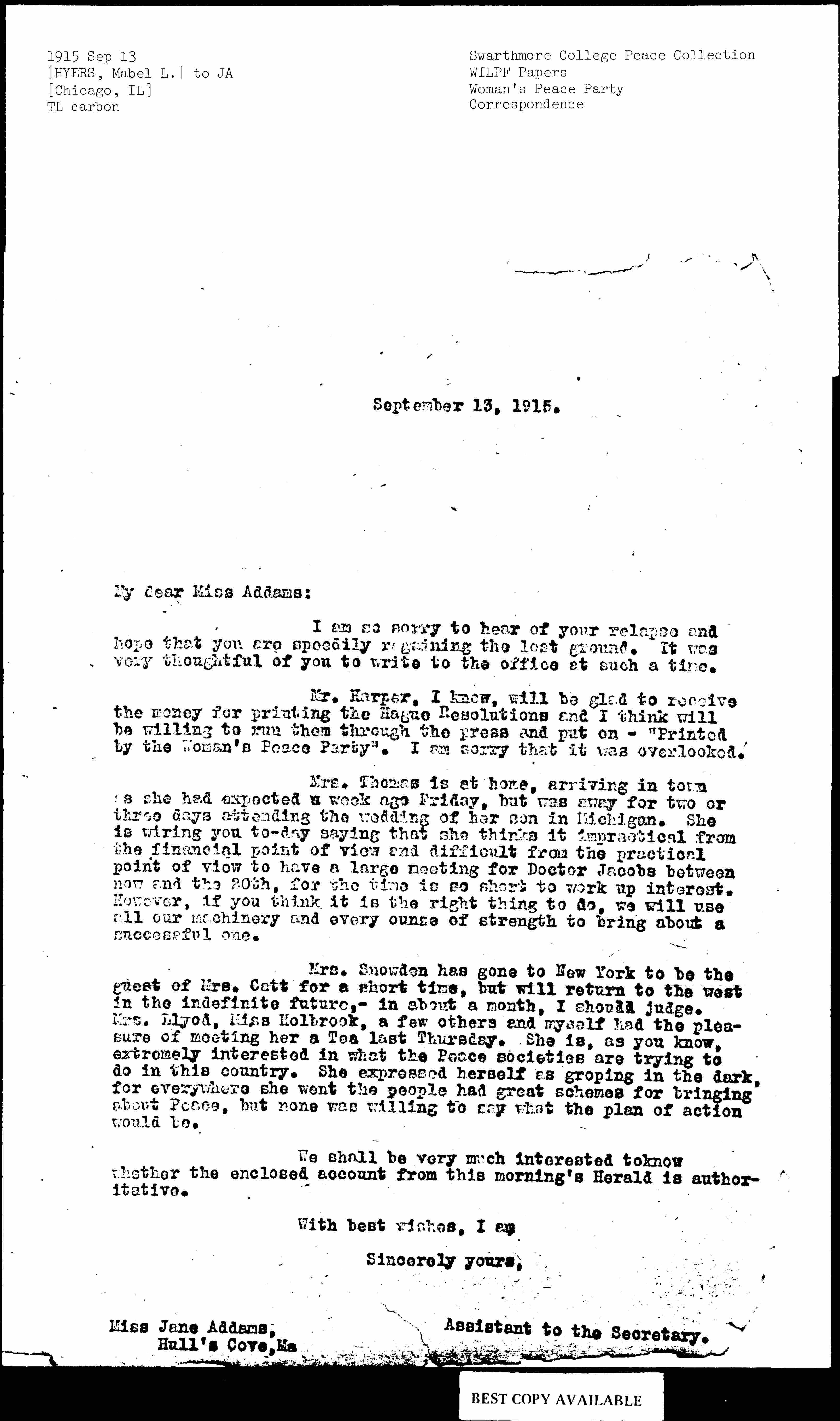 Mr. Harper, I know, will be glad to receive the money for printing the Hague Resolutions and I think will be willing to run them through the press and put on -- "Printed by the Woman's Peace Party". I am sorry that it was overlooked.
