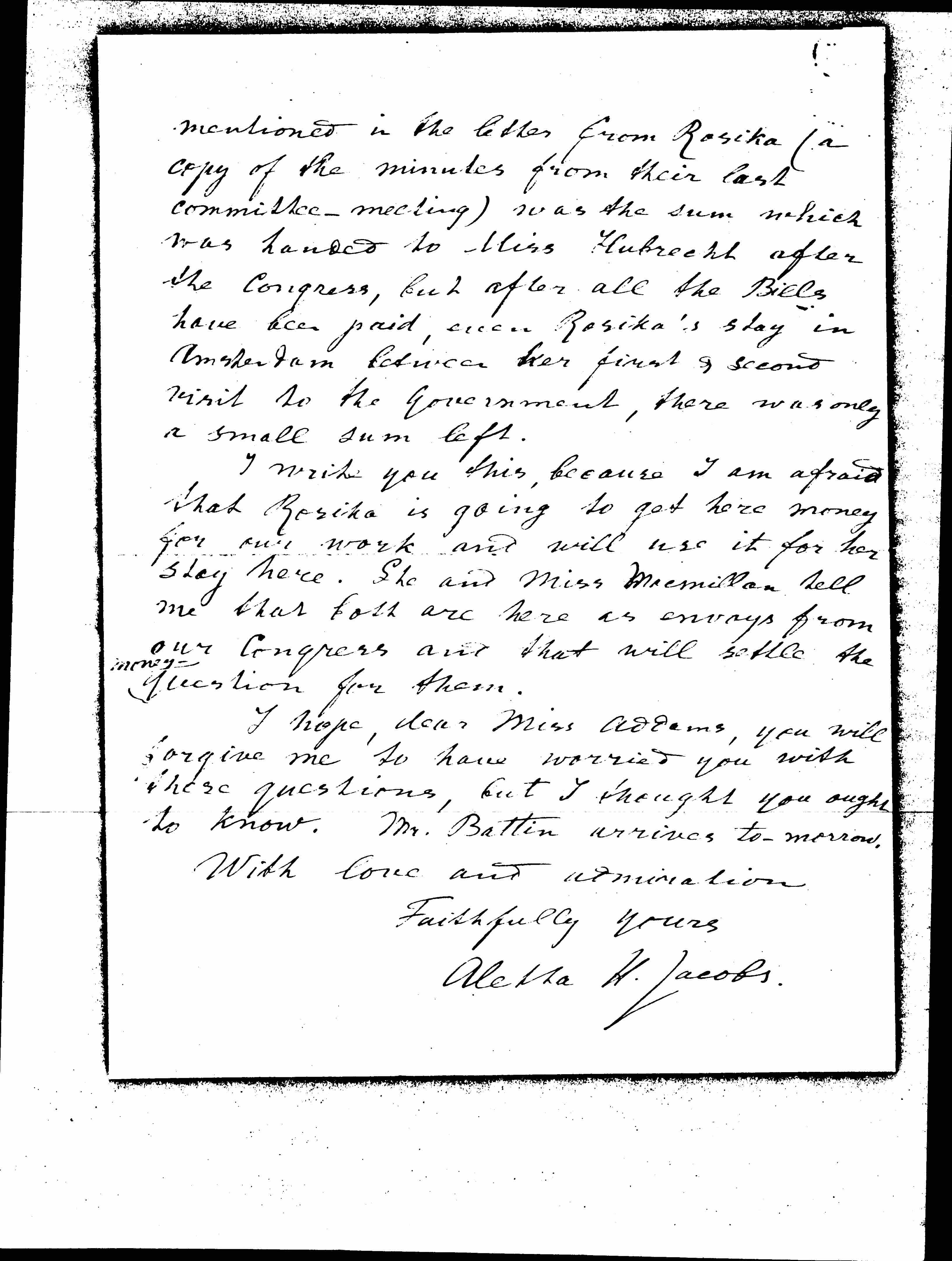 I hope, dear Miss Addams, you will forgive me to have worried you with these questions, but I thought you ought to know. Mr. [Batten] arrives [tomorrow].