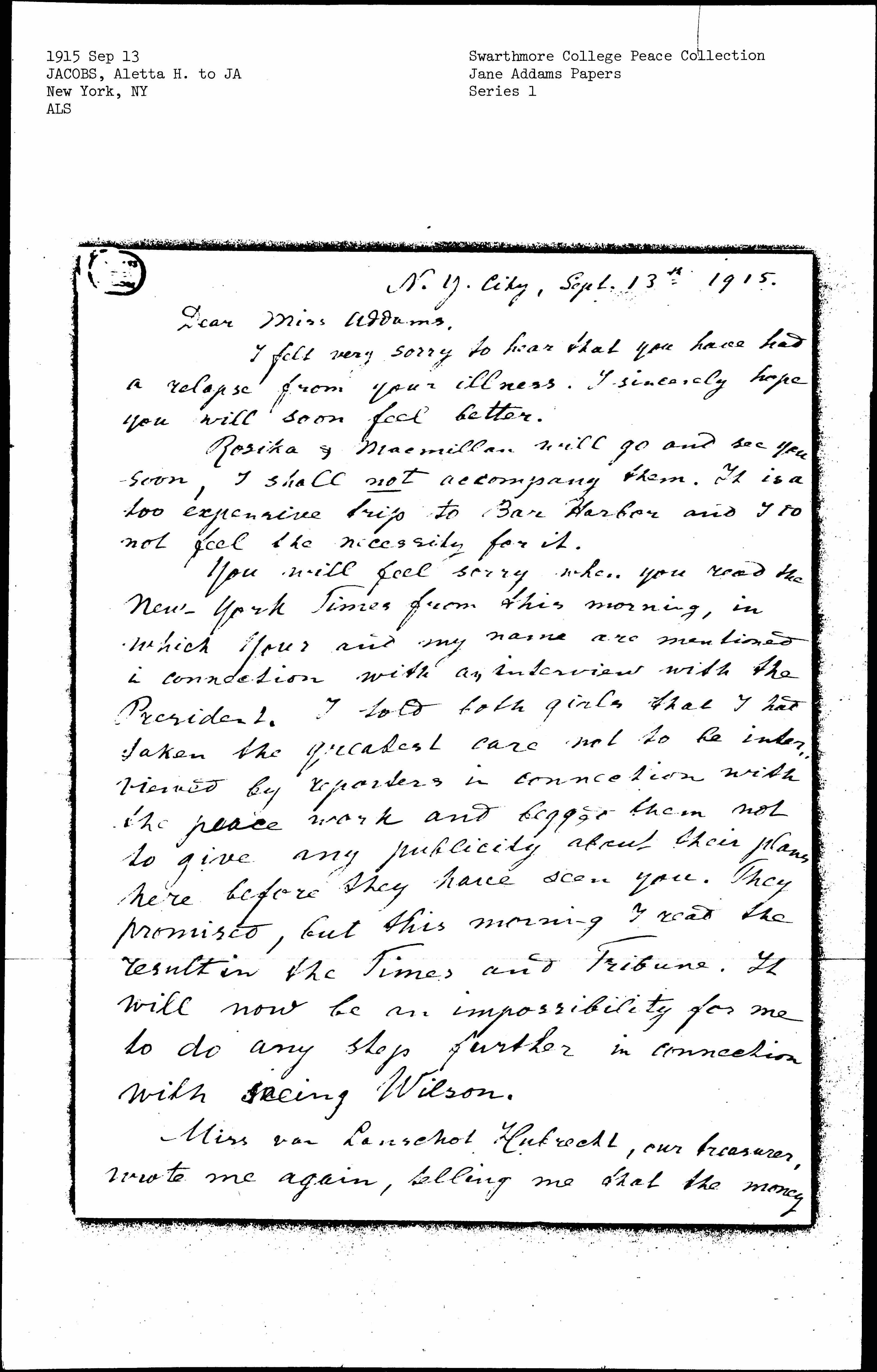 You will feel sorry when you read the New York Times from this morning, in which your and my name are mentioned in connection with an interview with the President. I told both girls that I had taken the greatest care not to be interviewed by reporters in connection with the peace work and begged them not to give any publicity about their plans here before they have seen you. They promised, but this morning I read the result in the Times and Tribune. It will now be an impossibility for me to do any step further in connection with seeing Wilson.