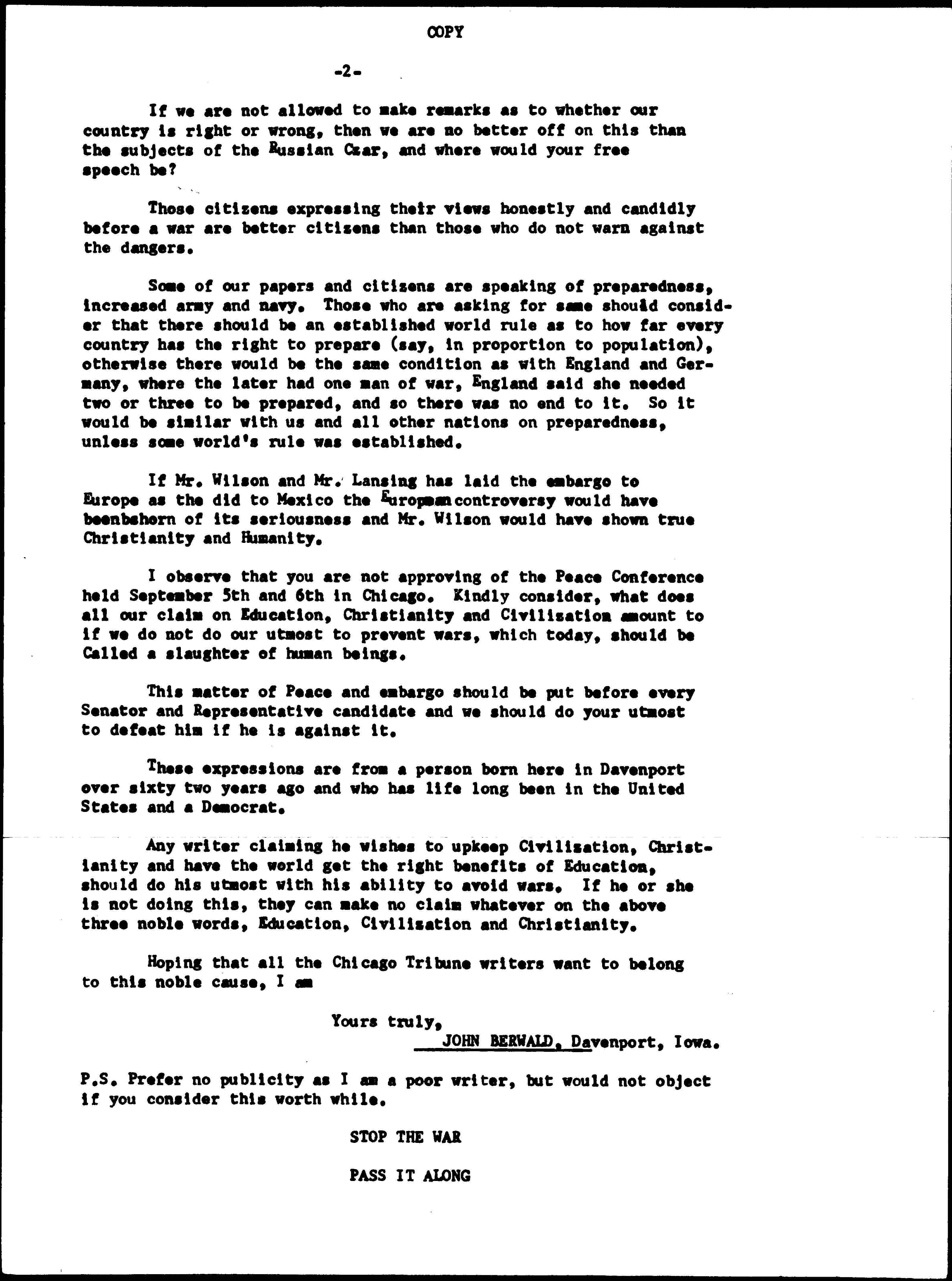 I observe that you are not approving of the Peace Conference held September 5th and 6th in Chicago. Kindly consider, what does all our claim on Education, Christianity and Civilization amount to if we do not do our utmost to prevent wars, which today, should be Called a slaughter of human beings.