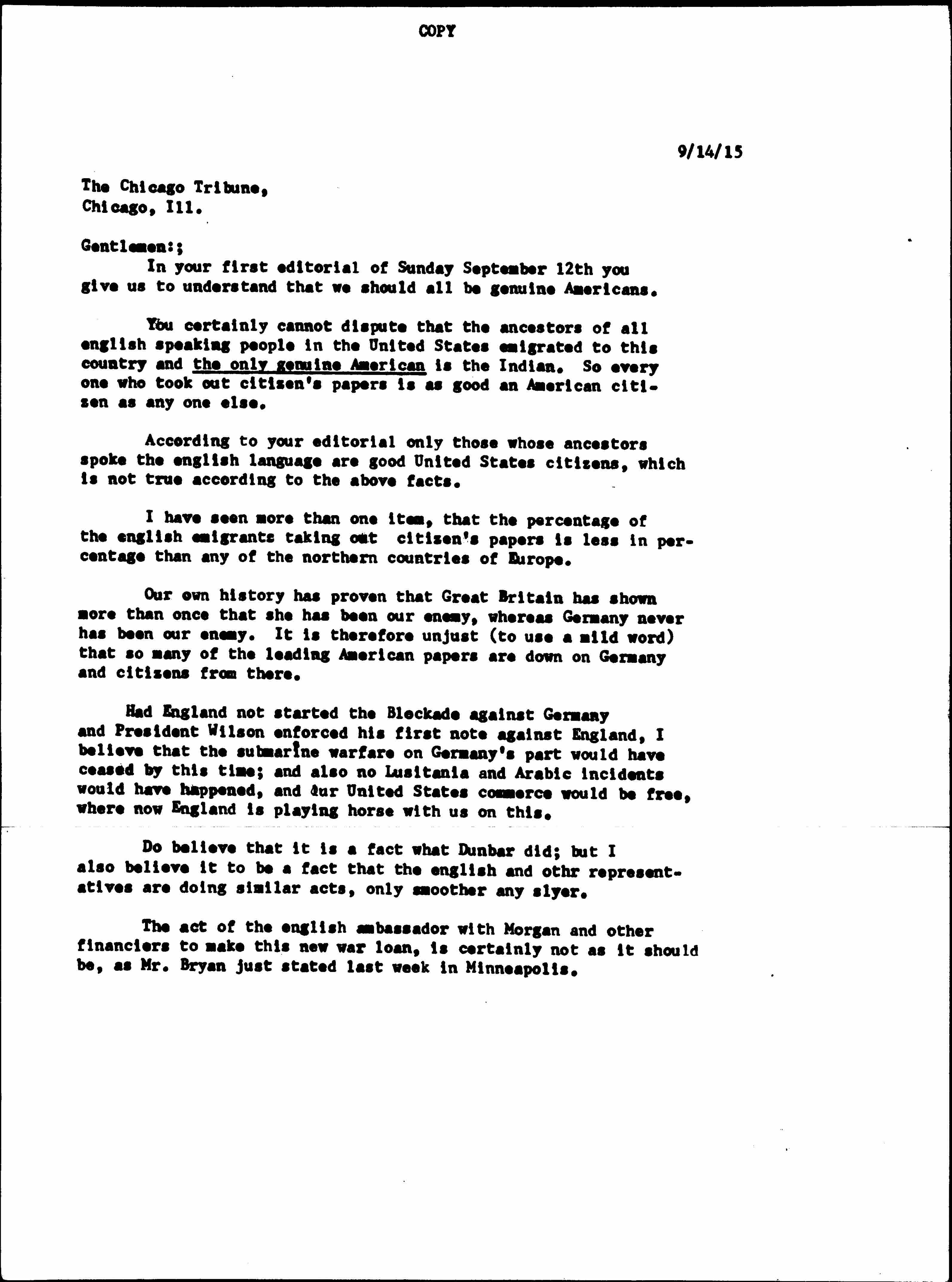 Our own history has proven that Great Britain has shown more than once that she has been our enemy, whereas Germany never has been our enemy. It is therefore unjust (to use a mild word) that so many of the leading American papers are down on Germany and citizens from there.