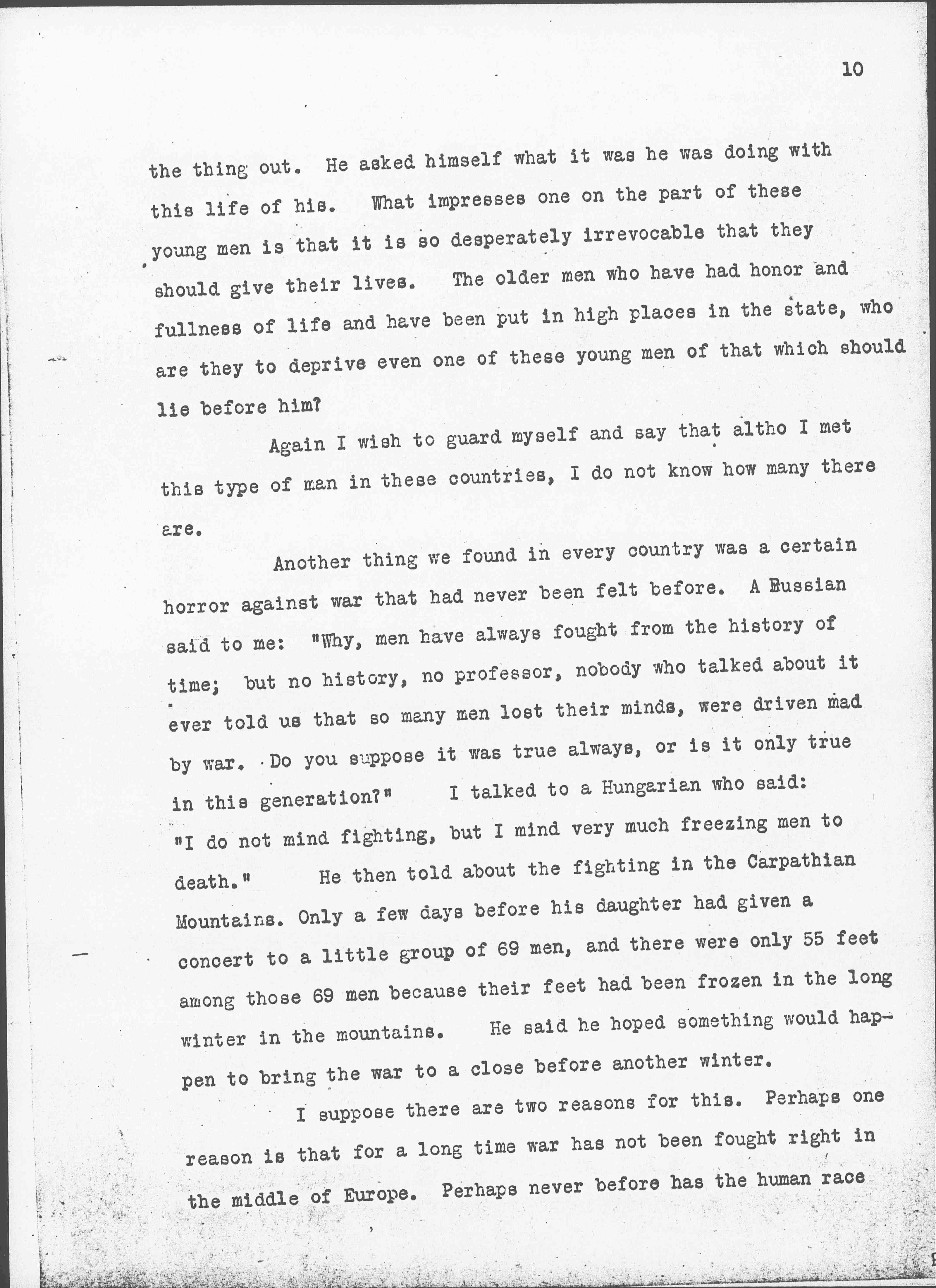 Another thing we found in every country was a certain horror against war that had never been felt before. A Russian said to me: "Why, men have always fought from the history of time; but no history, no professor, nobody who talked about it ever told us that so many men lost their minds, were driven mad by war. Do you suppose it was true always, or is it only true in this generation?" I talked to a Hungarian who said: "I do not mind fighting, but I mind very much freezing men to death." He then told about the fighting in the Carpathian Mountains. Only a few days before his daughter had given a concert to a little group of 69 men, and there were only 55 feet among those 69 men because their feet had been frozen in the long winter in the mountains. He said he hoped something would happen to bring the war to a close before another winter.