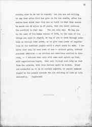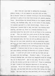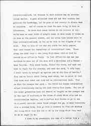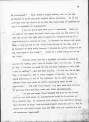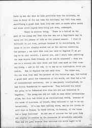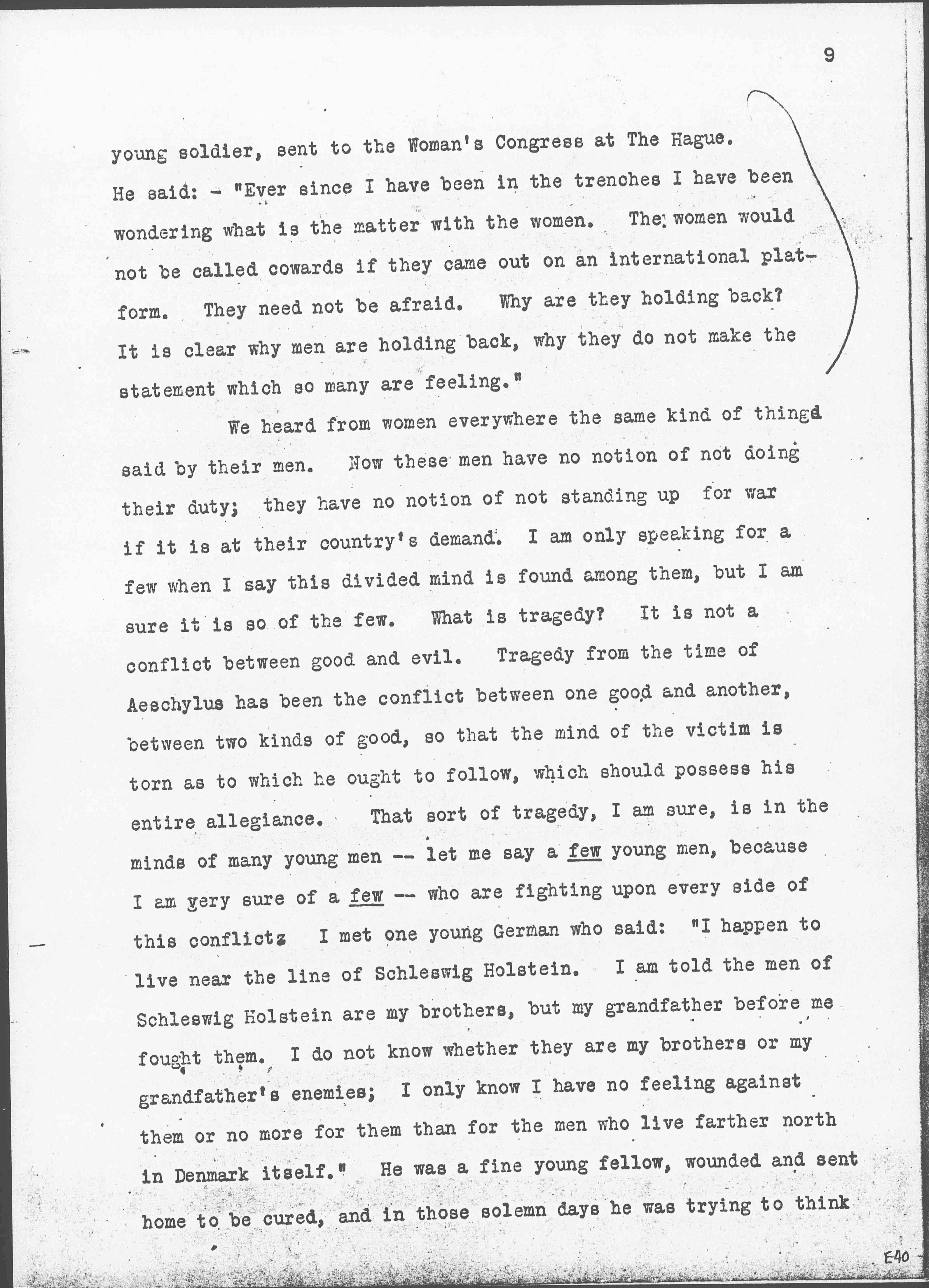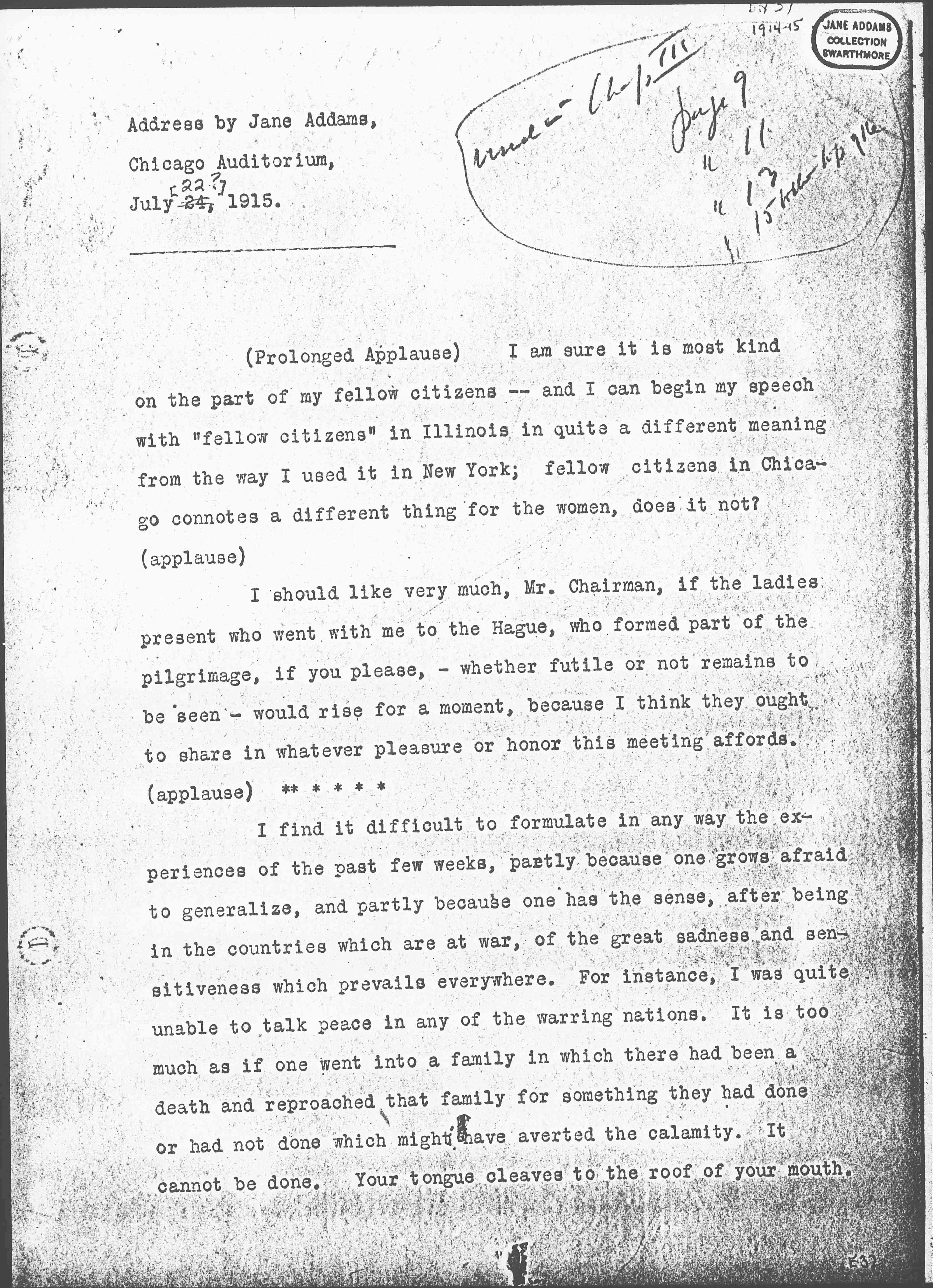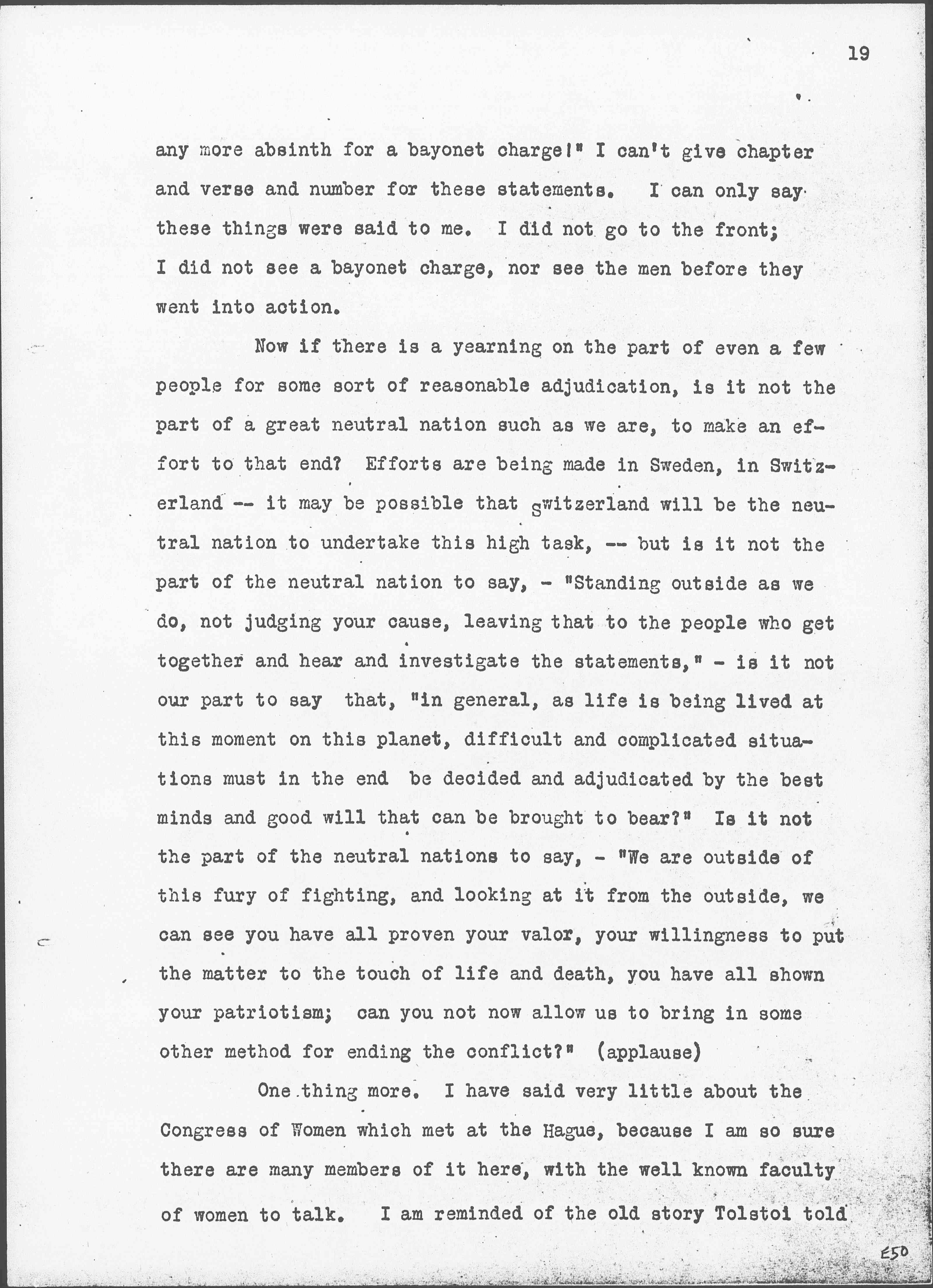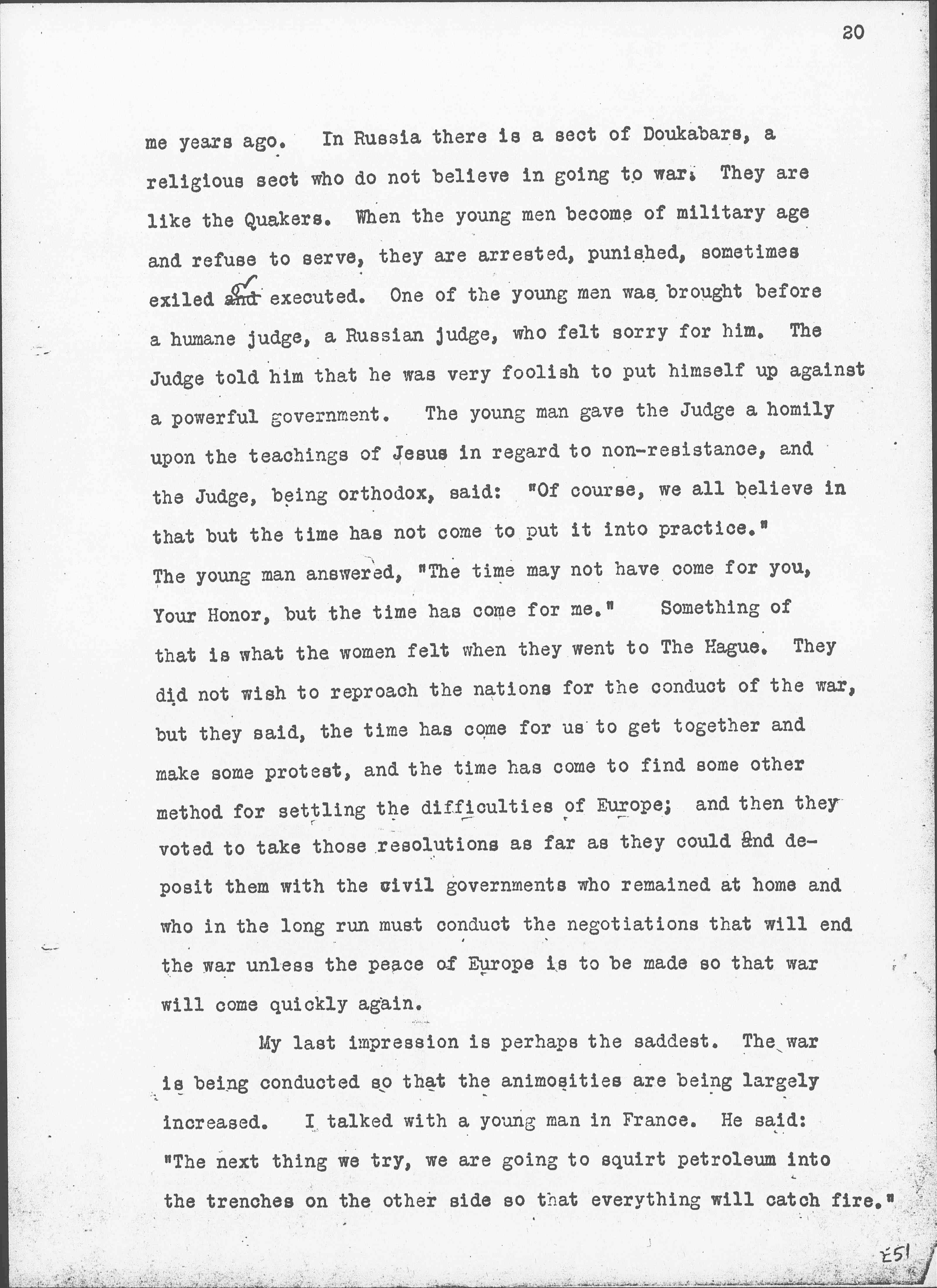 One thing more. I have said very little about the Congress of Women which met at The Hague, because I am so sure there are many members of it here, with the well known faculty of women to talk. I am reminded of the old story of [Tolstoy] told [page 20] me years ago. In Russia there is a sect of [Doukhobors], a religious sect who do not believe in going to war. They are like the Quakers. When the young men become of military age and refuse to serve, they are arrested, punished, sometimes exiled and ↑or↓ executed. One of the young men was brought before a humane judge, a Russian judge, who felt sorry for him. The Judge told him that he was very foolish to put himself up against a powerful government. The young man gave the Judge a homily upon the teachings of Jesus in regard to [nonresistance], and the Judge, being orthodox, said: "Of course, we all believe in that but the time has not come to put it into practice." The young men answered, "The time may not have come for you, Your Honor, but the time has come for me." Something of that is what the women felt when they went to The Hague. They did not wish to reproach the nations for the conduct of the war, but they said, the time has come for us to get together and make some protest, and the time has come to find some other method for settling the difficulties of Europe; and then they voted to take those resolutions as far as they could and deposit them with the civil governments who remained at home and who in the long run must conduct the negotiations that will end the war unless the peace of Europe is to be made so that war will come quickly again.