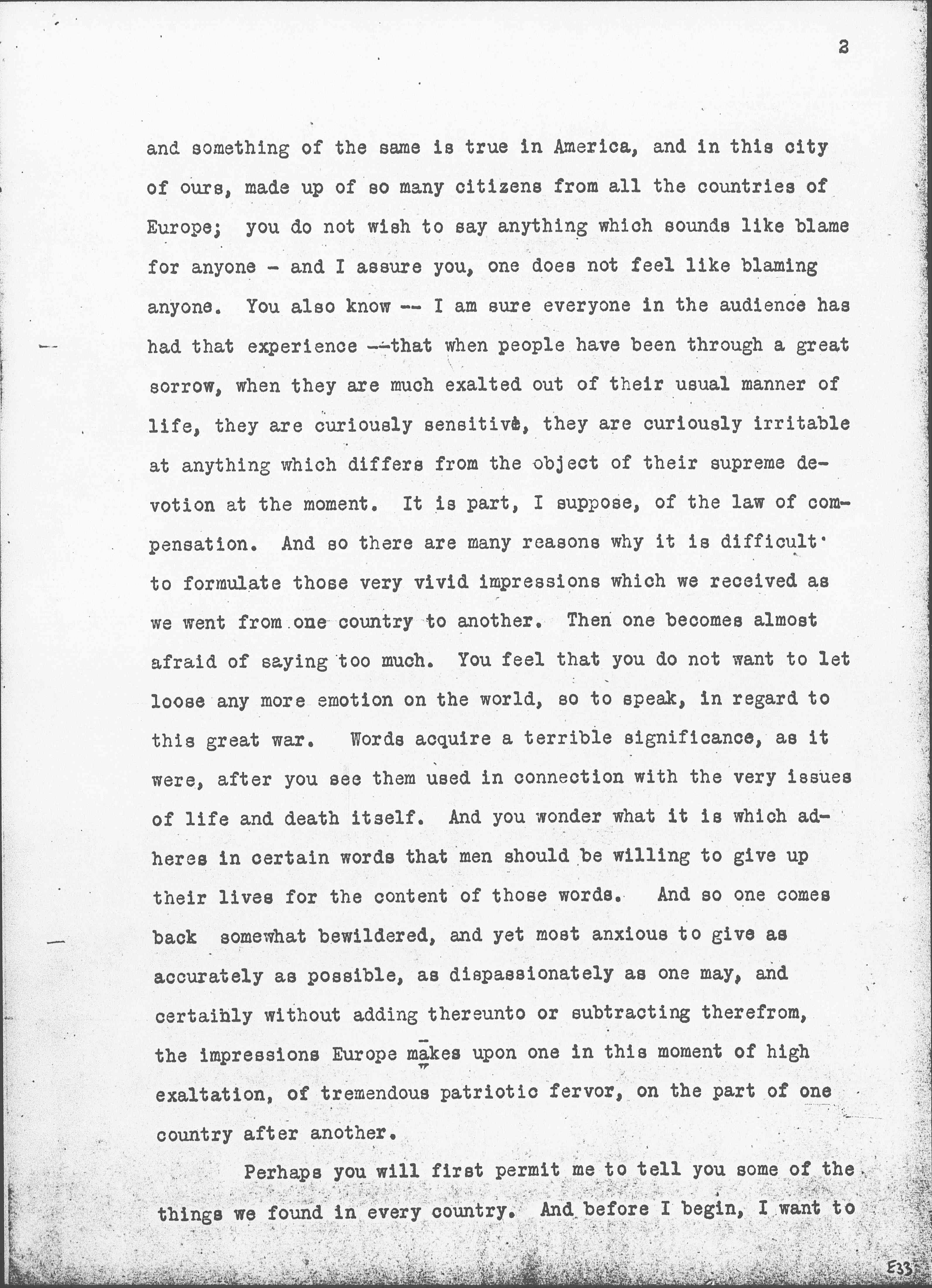 I find it difficult to formulate in any way the experiences of the past few weeks, partly because one grows afraid to generalize, and partly because one has the sense, after being in the countries which are at war, of the great sadness and sensitiveness which prevails everywhere. For instance, I was quite unable to talk peace in any of the warring nations. It is too much as if one went into a family in which there had been a death and reproached that family for something they had done or had not done which might have averted the calamity. It cannot be done. Your tongue cleaves to the roof of your mouth, [page 2] and something of the same is true in America, and in this city of ours, made up of so many citizens from all the countries of Europe; you do not wish to say anything which sounds like blame for anyone -- and I assure you, one does not feel like blaming anyone. You also know -- I am sure everyone in the audience has had that experience -- that when people have been through a great sorrow, when they are much exalted out of their usual manner of life, they are curiously sensitive, they are curiously irritable at anything which differs from the object of their supreme devotion at the moment. It is part, I suppose, of the law of compensation. And so there are many reasons why it is difficult to formulate those very vivid impressions which we received as we went from one country to another. Then one because almost afraid of saying too much. You feel that you do not want to let loose any more emotion on to the world, so to speak, in regard to this great war. Words acquire a terrible significance, as it were, after you see them used in connection with the very issues of life and death itself. And you wonder what it is which adheres in certain words that men should be willing to give up their lives for the content of those words. And so one comes back somewhat bewildered, and yet most anxious to give as accurately as possible, as dispassionately as one may, and certainly without adding thereunto or subtracting therefrom, the impressions Europe makes upon one in this moment of high exaltation, of tremendous patriotic fervor, on the part of one country after another.
