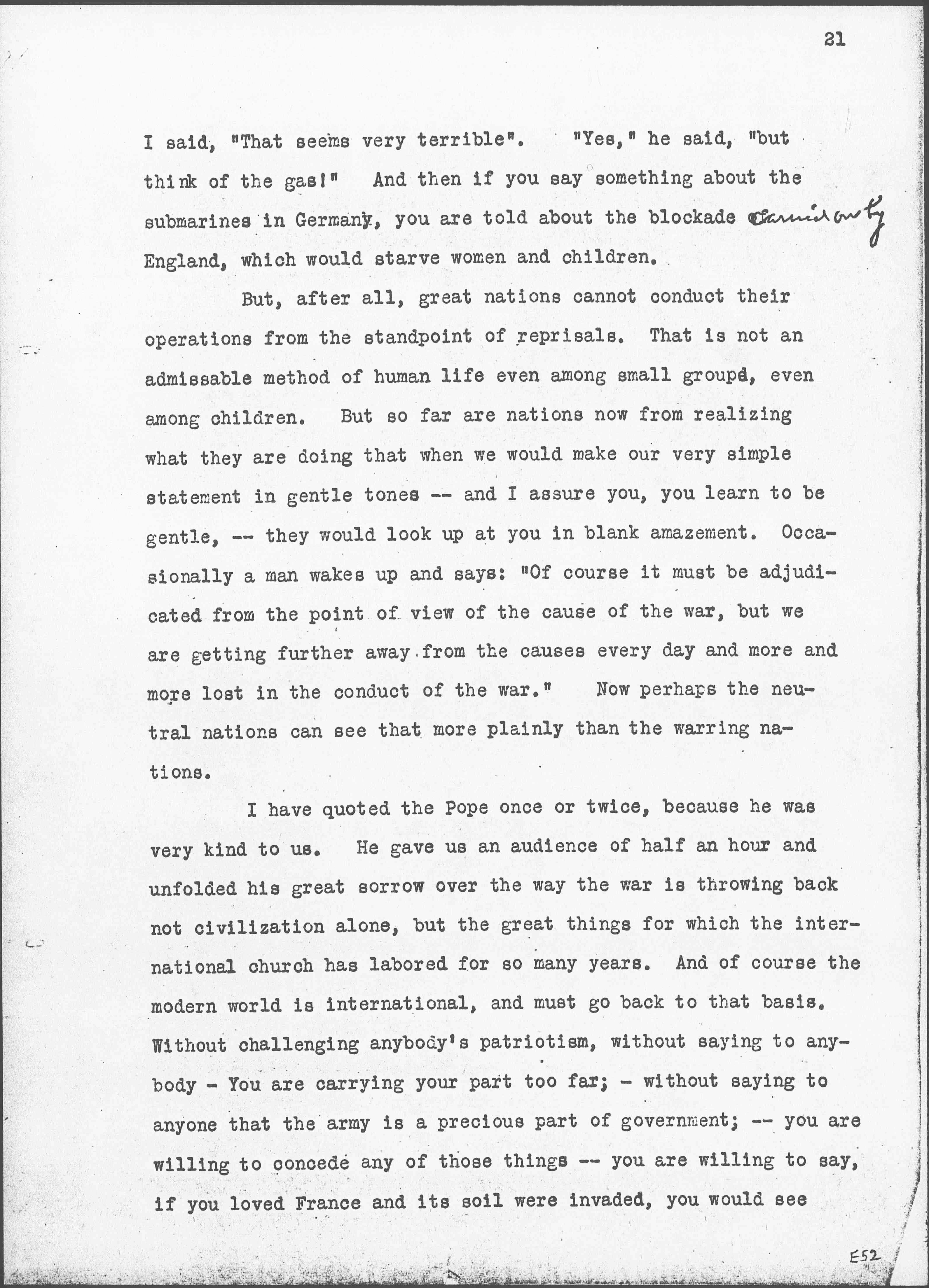 My last impression is perhaps the saddest. The war is being conducted so that the animosities are being largely increased. I talked with a young man in France. He said: "The next thing we try, we are going to squirt petroleum into the trenches on the other side so that everything will catch fire." [page 21] I said, "That seems very terrible." "Yes," he said, "but think of the gas!" And then if you say something about the submarines in Germany, you are told about the blockade ↑carried on by↓ England, which would starve women and children.