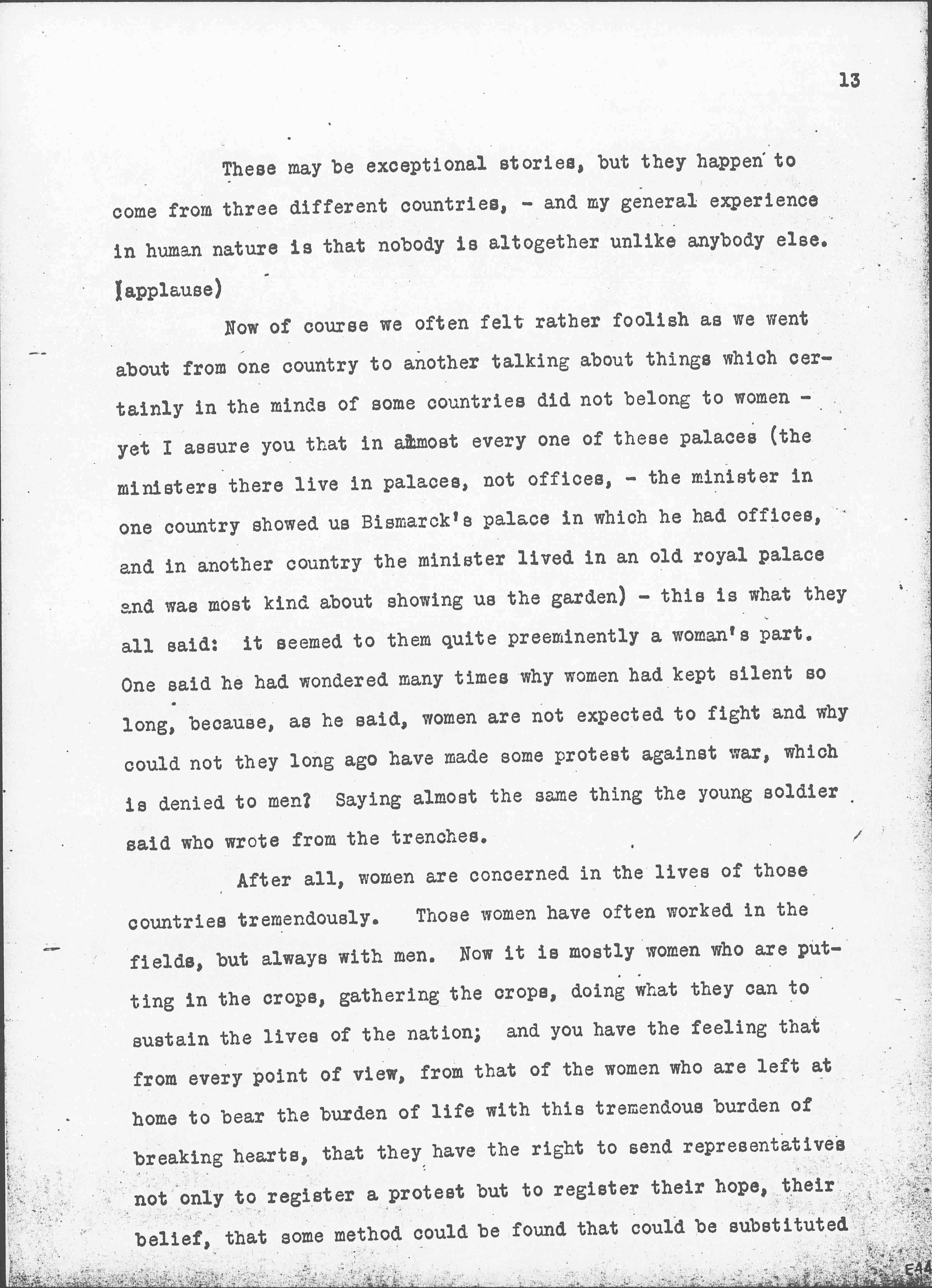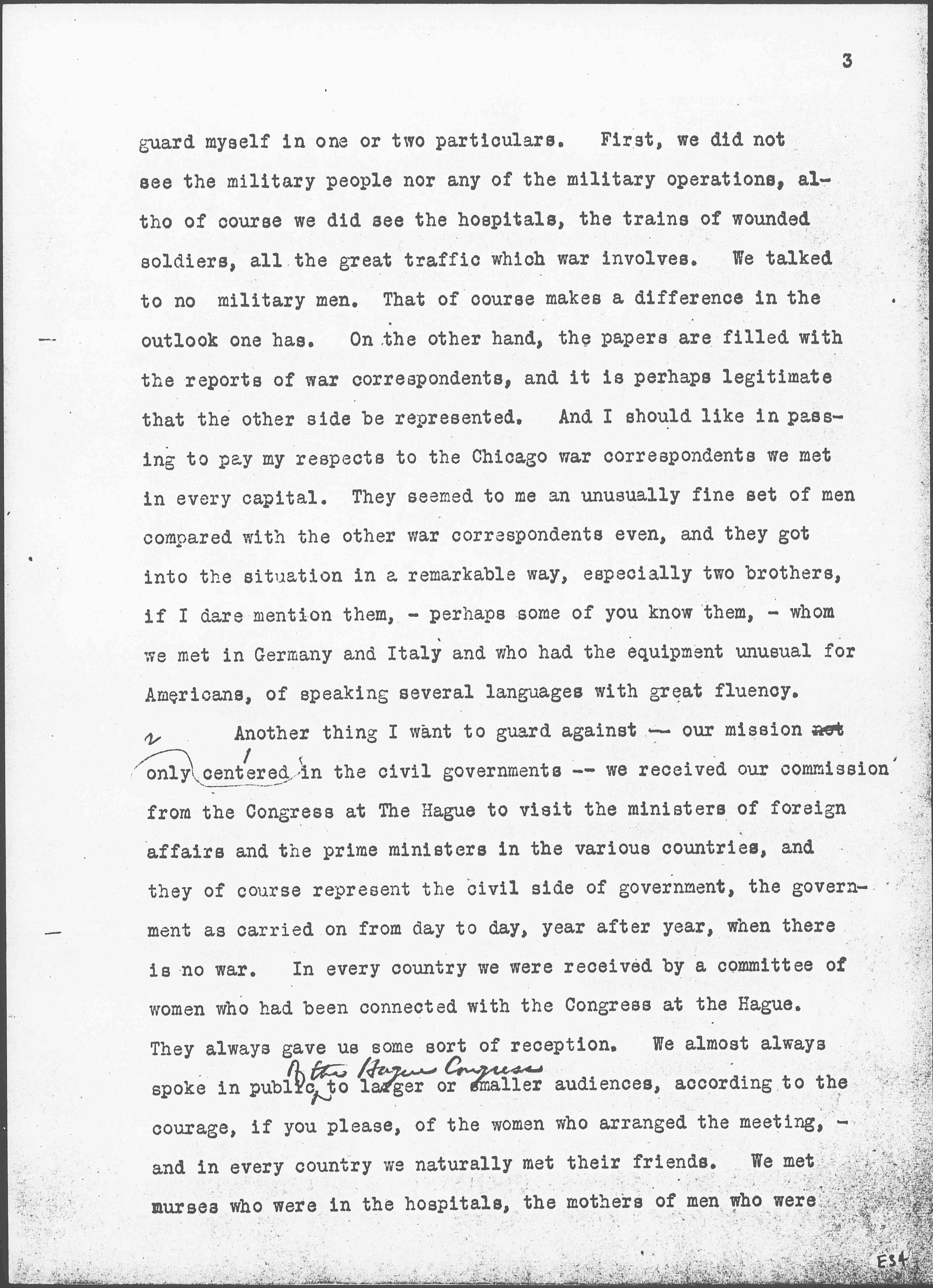 Another thing I want to guard against -- our mission not [centered only] in the civil governments -- we received our commission from the Congress at The Hague to visit the ministers of foreign affairs and the prime ministers in the various countries, and they of course represent the civil side of government, the government as carried on from day to day, year after year, when there is no war. In every country we were received by a committee of women who had been connected with the Congress at The Hague. They always gave us some sort of reception. We almost always spoke in public ↑of The Hague Congress↓ to larger or smaller audiences, according to the courage, if you please, of the women who arranged the meeting, -- and in every country we naturally met their friends. We met nurses who were in the hospitals, the mothers of men who were (page 4) at the front, and, if you please, not only the civilian side of life but the feminine side, [although] we by no means confined our talks to women, but met in every country men associated with government, members of parliament, and ↑those↓ who had much to do with all the events which led up to the war.