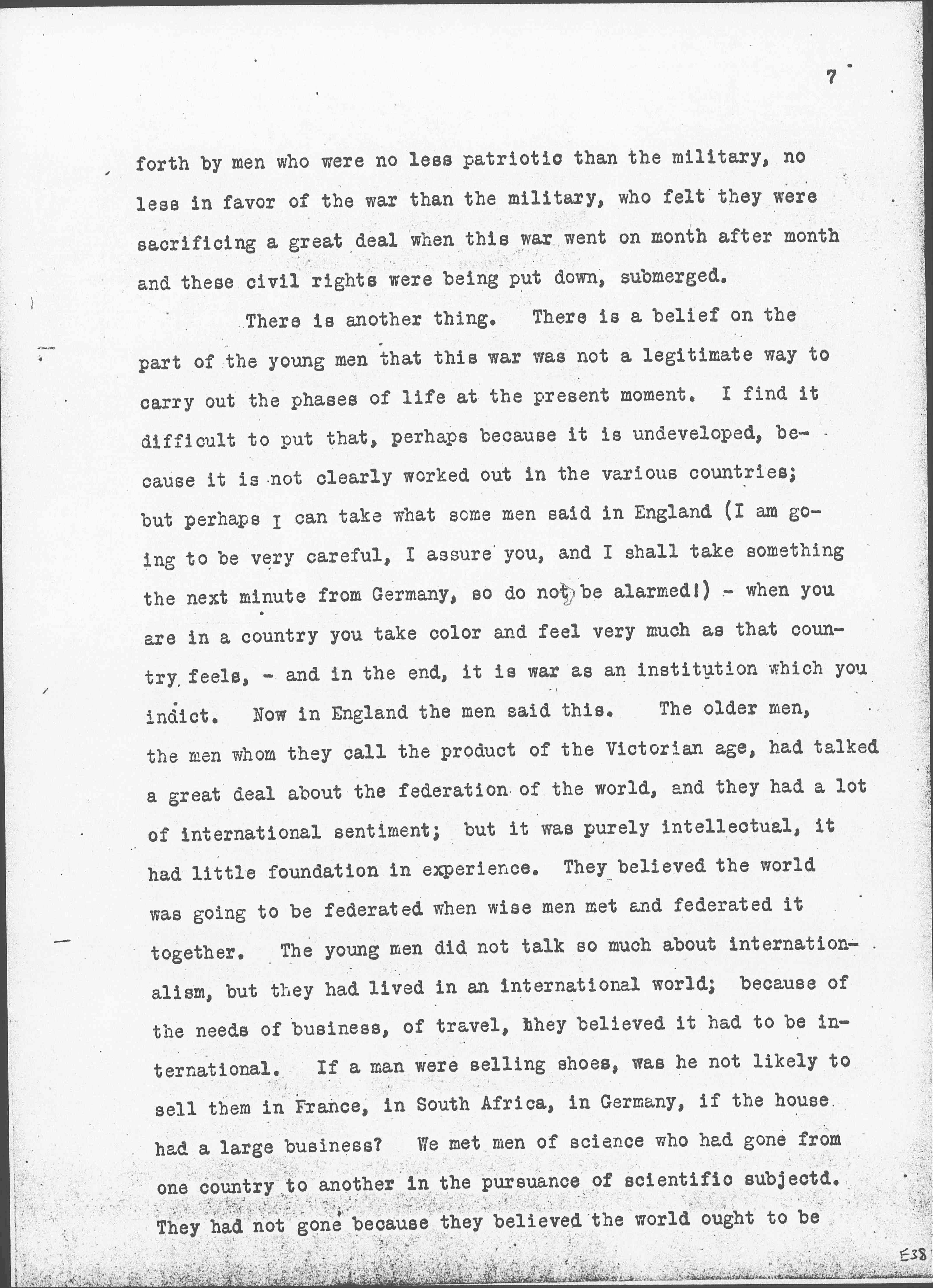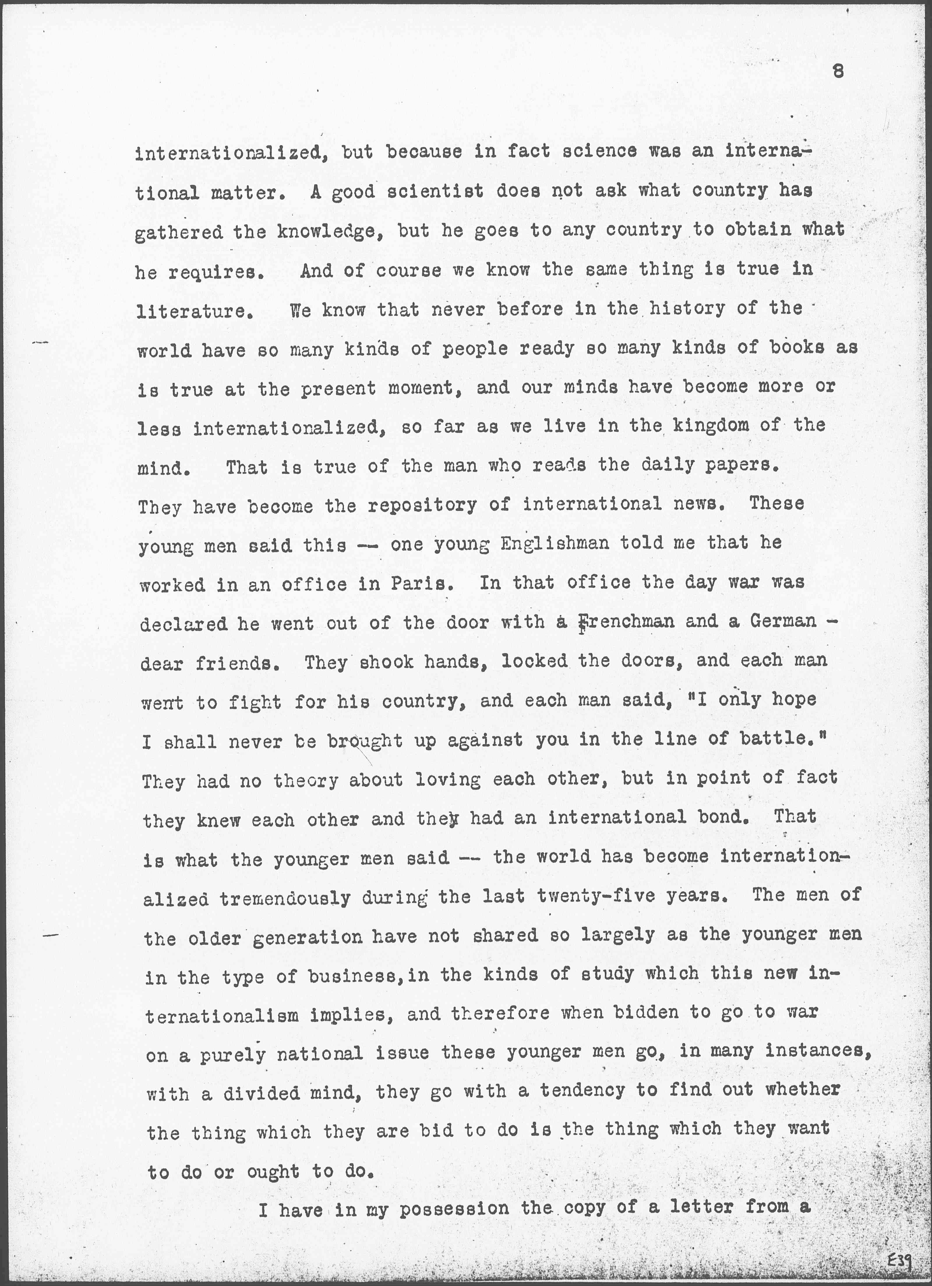There is another thing. There is a belief on the part of the young men that this war was not a legitimate way to carry out the phases of life at the present moment. I find it difficult to put that, perhaps because it is undeveloped, because it is not clearly worked out in the various countries; but perhaps I can take what some men said in England (I am going to be very careful, I assure you, and I shall take something the next minute from Germany, so do not be alarmed!) -- when you are in a country you take color and feel very much as that country feels, -- and in the end, it is war as an institution which you indict. Now in England the men said this. The older men, the men whom they call the product of the Victorian age, had talked a great deal about the federation of the world, and they had a lot of international sentiment; but it was purely intellectual, it had little foundation in experience. They believed the world was going to be federated when wise men met and federated it together. The young men did not talk so much about internationalism, but they had lived in an international world; because of the needs of business, of travel, they believed it had to be international. If a man were selling shoes, was he not likely to sell them in France, in South Africa, in Germany, if the house had a large business? We met men of science who had gone from one country to another in the pursuance of scientific [subjects]. They had not gone because they believed the world ought to be [page 8] internationalized, but because in fact science was an international matter. A good scientist does not ask what country has gathered the knowledge, but he goes to any country to obtain what he requires. And of course we know the same thing is true in literature. We know that never before in the history of the world have so many kinds of people [read] so many kinds of books as is true at the present moment, and our minds have become more or less internationalized, so far as we live in the kingdom of the mind. That is true of the man who reads the daily papers. They have become the repository of international news. These young men said this -- one young Englishman told me that he worked in an office in Paris. In that office the day war was declared he went out of the door with a Frenchman and a German -- dear friends. They shook hands, locked the doors, and each man went to fight for his country, and each man said, "I only hope I shall never be brought up against you in the line of battle." They had no theory about loving each other, but in point of fact they knew each other and they had an international bond. That is what the younger men said -- the world has become internationalized tremendously during the last twenty-five years. The men of the older generation have not shared so largely as the younger men in the type of business, in the kinds of study which this new internationalism implies, and therefore when bidden to go to war on a purely national issue these younger men go, in many instances, with a divided mind, they go with a tendency to find out whether the thing which they are bid to do is the thing which they want to do or ought to do.