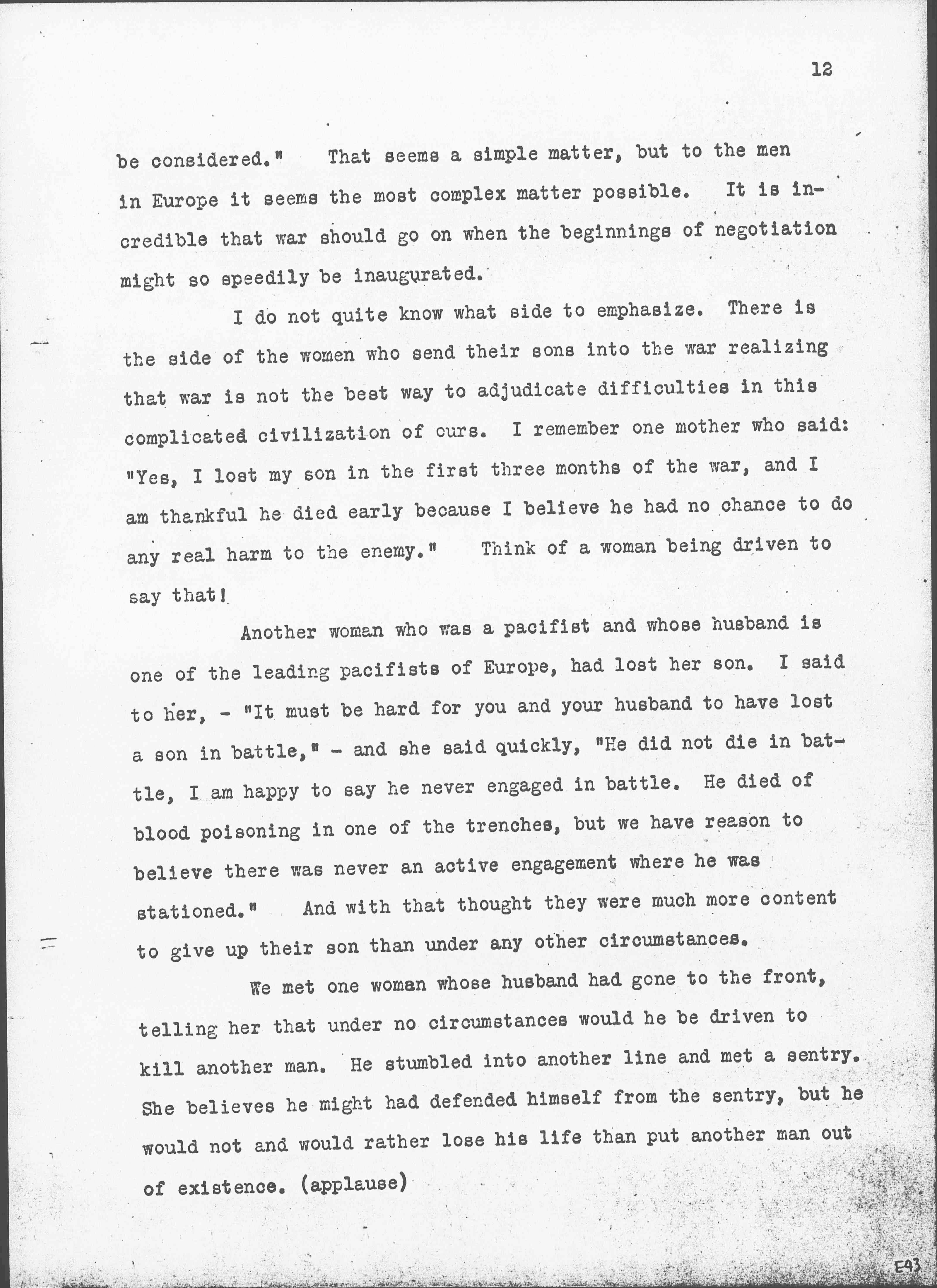 We met one woman whose husband had gone to the front, telling her that under no circumstances would he be driven to kill another man. He stumbled into another line and met a sentry. She believes he might had defended himself from the sentry, but he would not and would rather lose his life than put another man out of existence. (applause) [page 13]