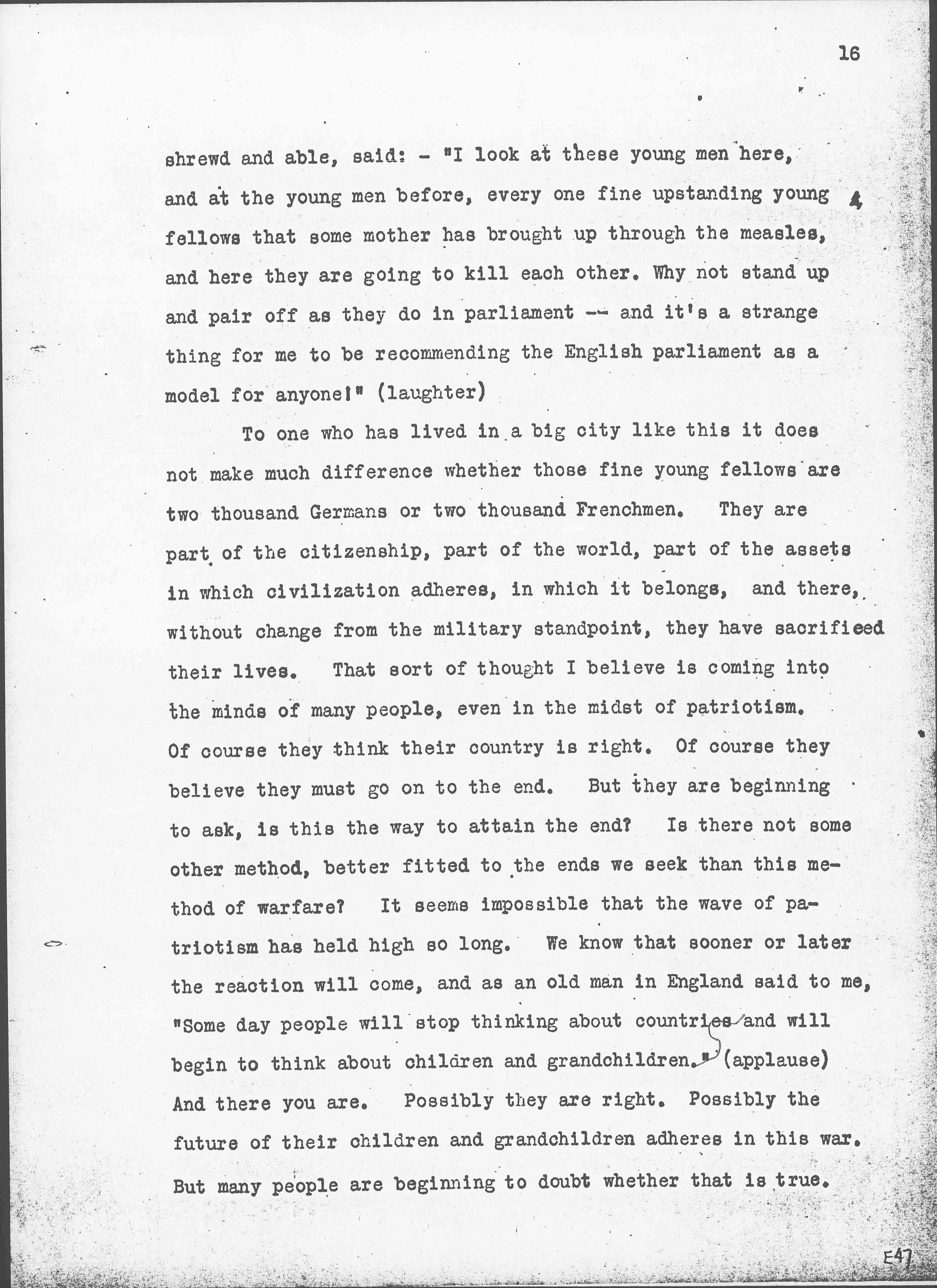 To one who has lived in a big city like this it does not make much difference whether those fine young fellows are two thousand Germans or two thousand Frenchmen. They are part of the citizenship, part of the world, part of the assets in which civilization adheres, in which it belongs, and there, without change from the military standpoint, they have sacrificed their lives. That sort of thought I believe is coming into the minds of many people, even in the midst of patriotism. Of course they think their country is right. Of course they believe they must go on to the end. But they are beginning to ask, is this the way to attain the end? Is there not some other method, better fitted to the ends we seek than this method of warfare? It seems impossible that the wave of patriotism has held high so long. We know that sooner or later the reaction will come, and as an old man in England said to me, "Some day people will stop thinking about countries and will begin to think about children and grandchildren." (applause) And there you are. Possibly they are right. Possibly the future of their children and grandchildren adheres in this war. But many people are beginning to doubt whether that is true. [page 17]