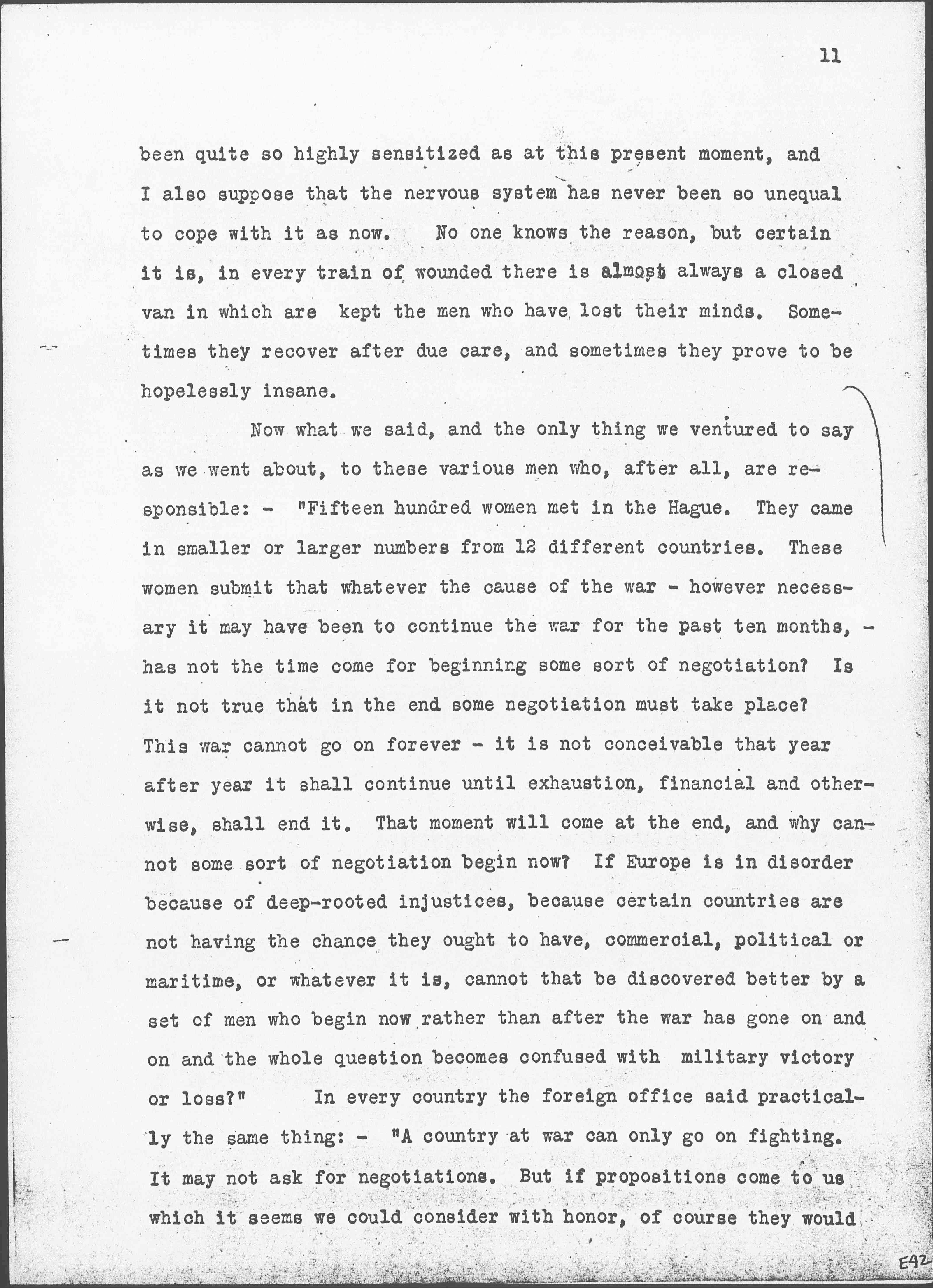 Now what we said, and the only thing we ventured to say as we went about, to these various men who, after all, are responsible: -- "Fifteen hundred women met in The Hague. They came in smaller or larger numbers from 12 different countries. These women submit that whatever the cause of the war -- however necessary it may have been to continue the war for the past ten months, -- has not the time come for beginning some sort of negotiation? Is it not true that in the end some negotiation must take place? This war cannot go on forever -- it is not conceivable that year after year it shall continue until exhaustion, financial and otherwise, shall end it. That moment will come at the end, and why cannot some sort of negotiation begin now? If Europe is in disorder because of deep-rooted injustices, because certain countries are not having the chance they ought to have, commercial, political or maritime, or whatever it is, cannot that be discovered better by a set of men who begin now rather than after the war has gone on and on and the whole question becomes confused with military victory or loss?" In every country the foreign office said practically the same thing: -- "A country at war can only go on fighting. It may not ask for negotiations. But if propositions come to us which it seems we could consider with honor, of course they would [page 12] be considered." That seems a simple matter, but to the men in Europe it seems the most complex matter possible. It is incredible that war should go on when the beginnings of negotiation might so speedily be inaugurated.