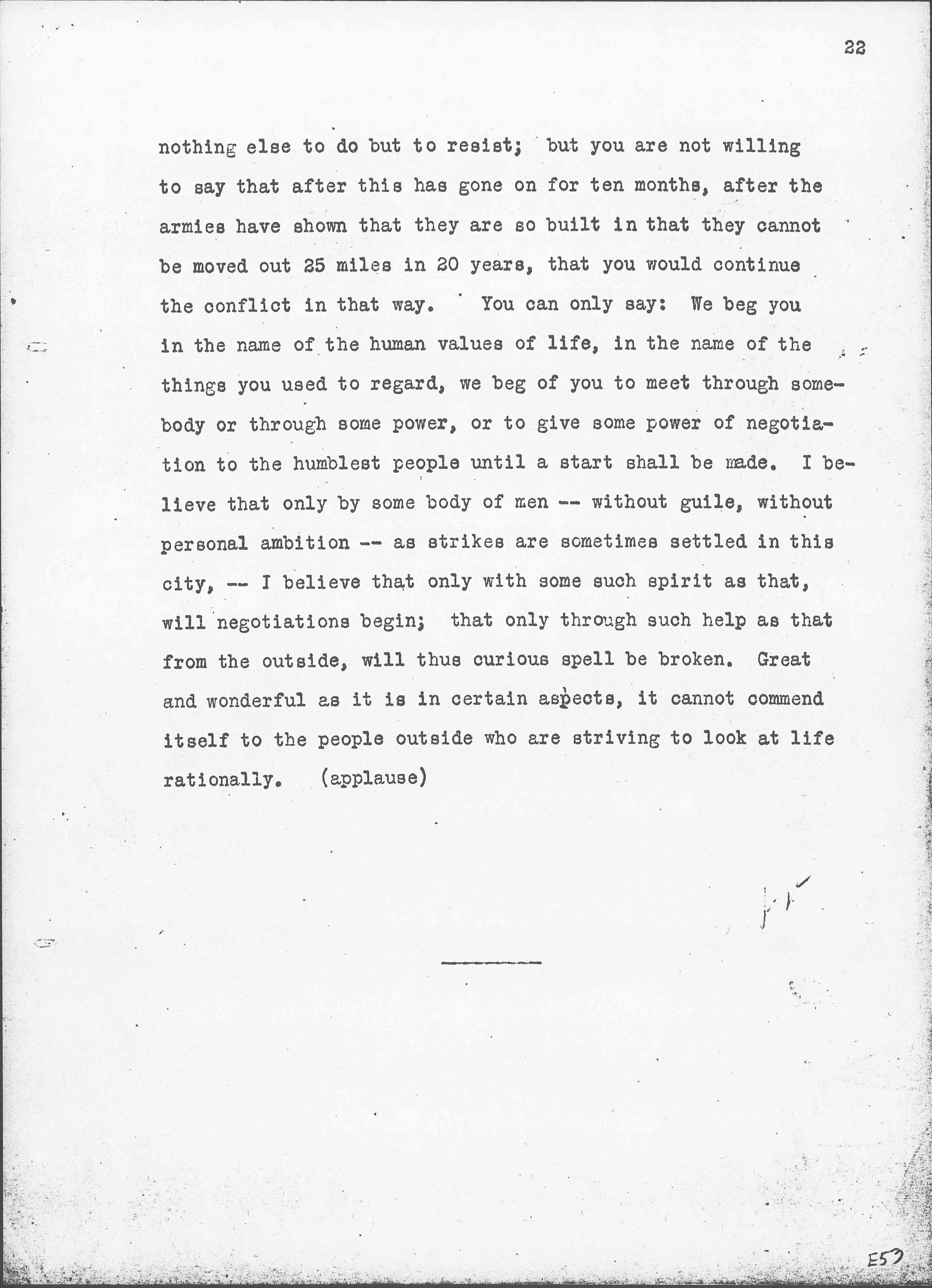 I have quoted the Pope once or twice, because he was very kind to us. He gave us an audience of half an hour and unfolded his great sorrow over the way the war is throwing back not civilization alone, but the great things for which the international church has labored for so many years. And of course the modern world is international, and must go back to that basis. Without challenging anybody's patriotism, without saying to anybody -- You are carrying your part too far; -- without saying to anyone that the army is a precious part of government; -- you are willing to concede any of those things -- you are willing to say, if you loved France and its soil were invaded, you would see [page 22] nothing else to do but to resist; but you are not willing to say that after this has gone on for ten months, after the armies have shown that they are so built in that they cannot be moved out 25 miles in 20 years, that you would continue the conflict in that way. You can only say: We beg you in the name of the human values of life, in the name of the things you used to regard, we beg of you to meet through somebody or through some power, or to give some power of negotiation to the humblest people until a start shall be made. I believe that only by some body of men -- without guile, without personal ambition -- as strikes are sometimes settled in this city, -- I believe that only with some such spirit as that, will negotiations begin; that only through such help as that from the outside, will thus curious spell be broken. Great and wonderful as it is in certain aspects, it cannot commend itself to the people outside who are striving to look at life rationally. (applause)
