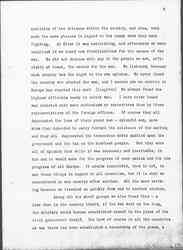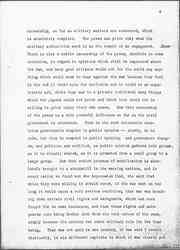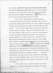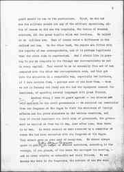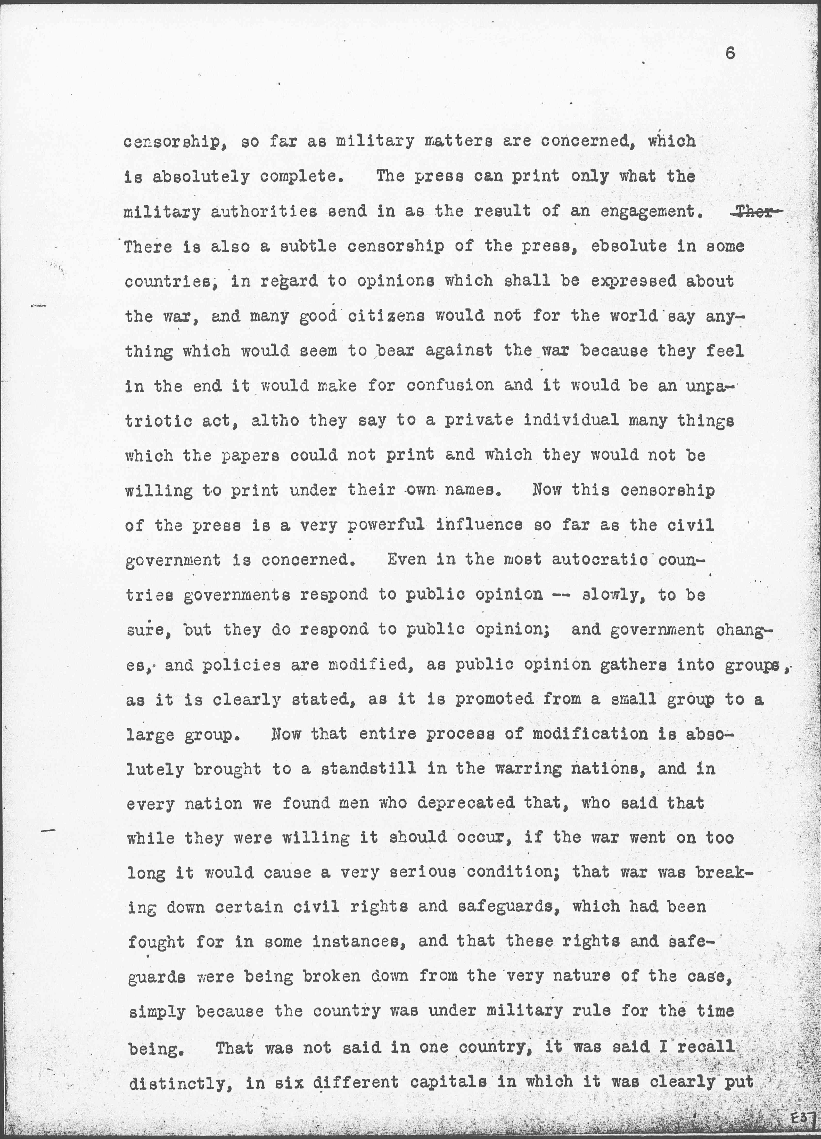 Among all the civil groups we also found this -- a fear that in the country itself, if the war went on too long, the military would become established almost in the place of the civil government itself. You know of course in all the countries at war there has been established a censorship of the press, a [page 6] censorship, so far as military matters are concerned, which is absolutely complete. The press can print only what the military authorities send in as the result of an engagement. There is also a subtle censorship of the press, [absolute] in some countries, in regard to opinions which shall be expressed about the war, and many good citizens would not for the world say anything which would seem to bear against the war because they feel in the end it would make for confusion and it would be an unpatriotic act, [although] they say to a private individual many things which the papers could not print and which they would not be willing to print under their own names. Now this censorship of the press is a very powerful influence so far as the civil government is concerned. Even in the most autocratic countries governments respond to public opinion -- slowly, to be sure, but they do respond to public opinion; and government changes, and policies are modified, as public opinion gathers into groups, as it is clearly stated, as it is promoted from a small group to a large group. Now that entire process of modification is absolutely brought to a standstill in the warring nations, and in every nation we found men who deprecated that, who said that while they were willing it should occur, if the war went on too long it would cause a very serious condition; that war was breaking down certain civil rights and safeguards, which had been fought for in some instances, and that these rights and safeguards were being broken down from the very nature of the case, simply because the country was under military rule for the time being. That was not said in one country, it was said I recall distinctly, in six different capitals in which it was clearly put [page 7] forth by men who were no less patriotic than the military, no less in favor of the war than the military, who felt they were sacrificing a great deal when this war went on month after month and these civil rights were being put down, submerged.