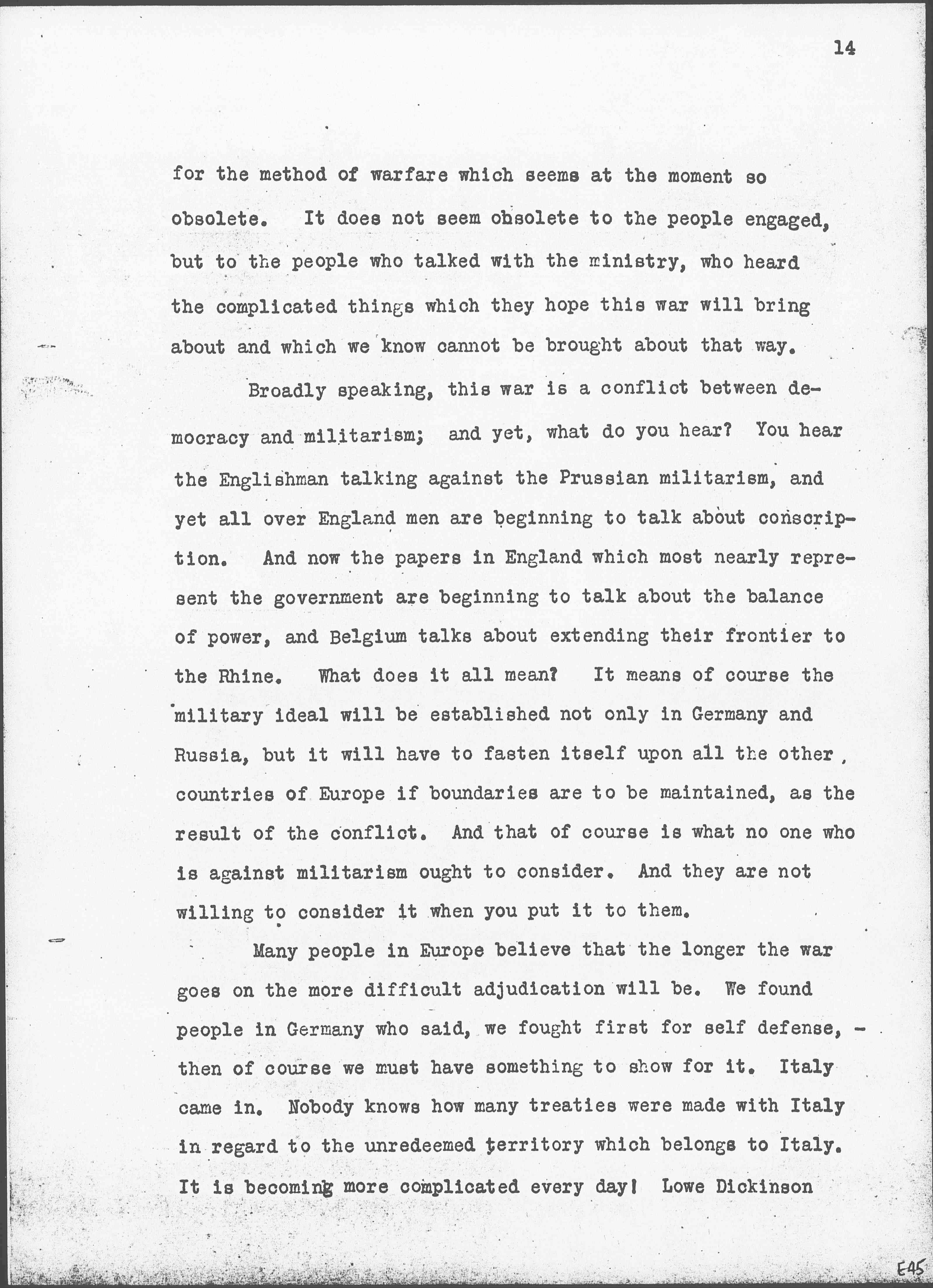 Broadly speaking, this war is a conflict between democracy and militarism; and yet, what do you hear? You hear the Englishman talking against the Prussian militarism, and yet all over England men are beginning to talk about conscription. And now the papers in England which most nearly represent the government are beginning to talk about the balance of power, and Belgium talks about extending their frontier to the Rhine. What does it all mean? It means of course the military ideal will be established not only in Germany and Russia, but it will have to fasten itself upon all the other countries of Europe if boundaries are to be maintained, as the result of the conflict. And that of course is what no one who is against militarism ought to consider. And they are not willing to consider it when you put it to them.