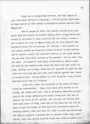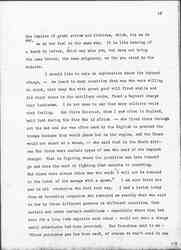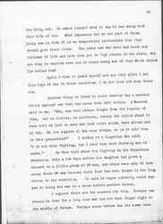 I should like to make an explanation about the bayonet charge, -- we heard in many countries that men who were willing to shoot, that many who with great good will fired shells and did their share in the artillery corps, found a bayonet charge very loathsome. I do not mean to say that many soldiers voice that feeling. But Olive [Schreiner], whom I saw often in England, said that during the Boer War in Africa -- she lived there [throughout] the war and she was often used by the English to protect the troops because they would place her on the engine, and the Boers would not shoot at a woman, -- she said that in the South African War there were certain types of men who said of the bayonet charge: That is fighting where the primitive man lets himself go and does the sort of fighting that amounts to something. But there were always other men who said: "I will not be reduced to the level of the savage with a spear." I am sure there are men in all countries who feel that way. I had a letter today from my traveling companion who reminded me exactly what was said to her by three different persons in different countries, that certain men under certain conditions -- especially where they had been for a long time opposite each other -- would not make a charge until stimulants had been provided. One Frenchman said to me -- "Since poisonous gas has been used, of course we won't need to use [page 19] any more [absinthe] for a bayonet charge!" I can't give chapter and verse and number for these statements. I can only say these things were said to me. I did not go to the front; I did not see a bayonet charge, nor see the men before they went into action.