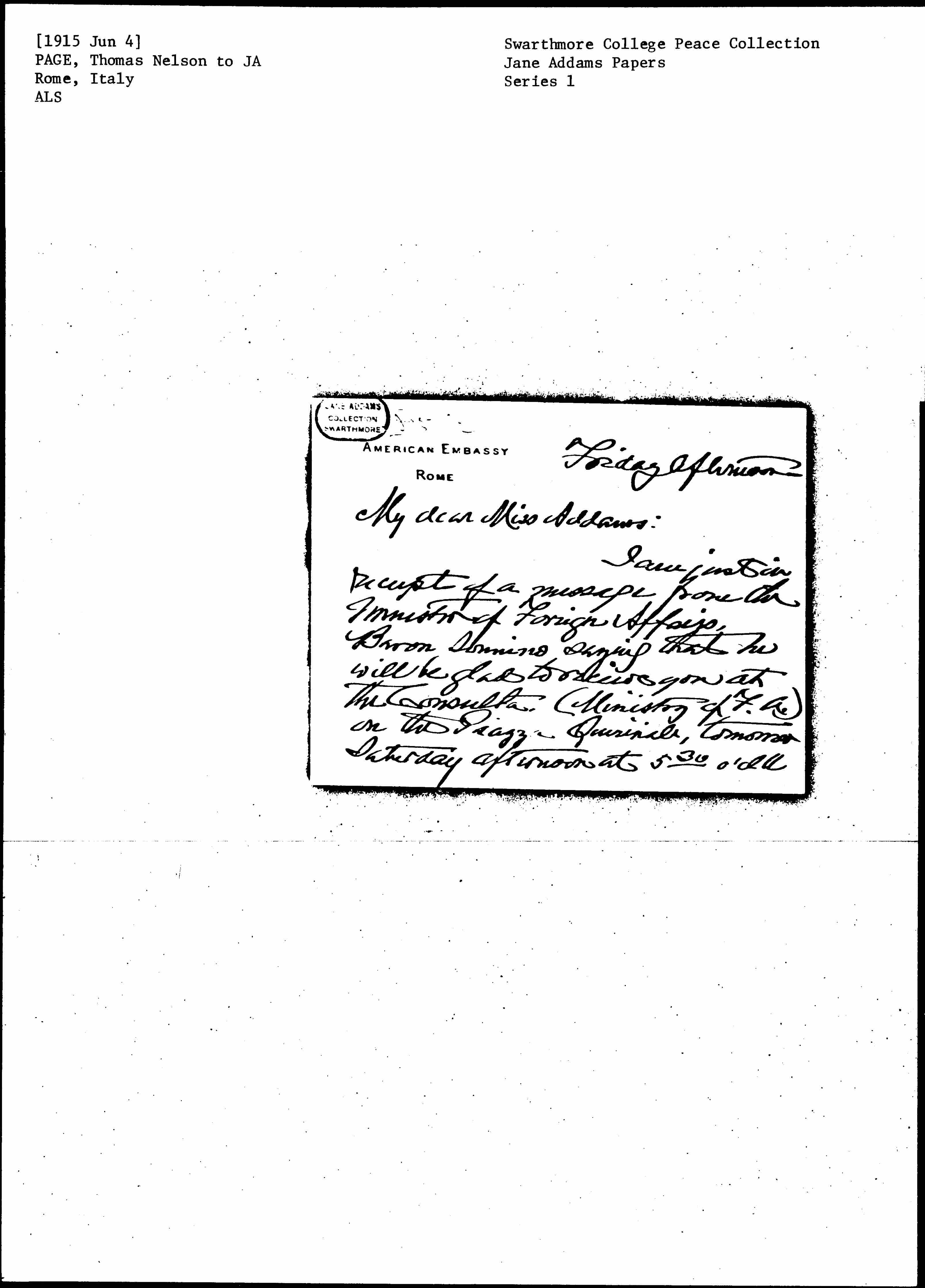 I am just in receipt of a message from the Minister of Foreign Affairs, Baron Sonnino saying that he will be glad to receive you at the Consulta, (Ministry of F. A.) on the Piazza Quirinale, tomorrow Saturday afternoon at 530 o'clk. [page 2] I had supposed that he received you this morning.
