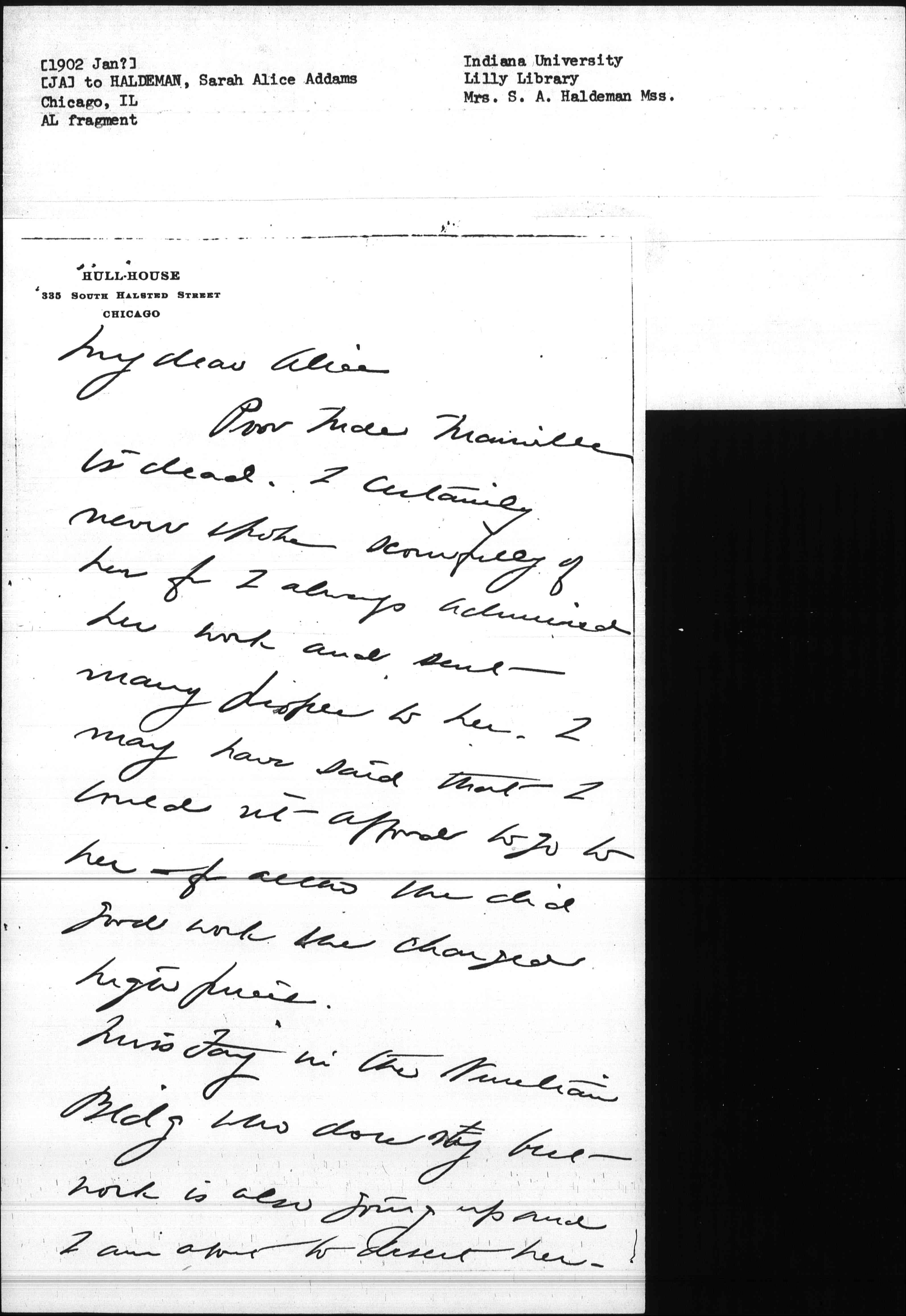 Poor Mde. [Manville] is dead. I certainly never spoke scornfully of her for I always admired her work and sent many people to her. I may have said that I couldn't afford to go to her for [although] she did good work she charged high prices.