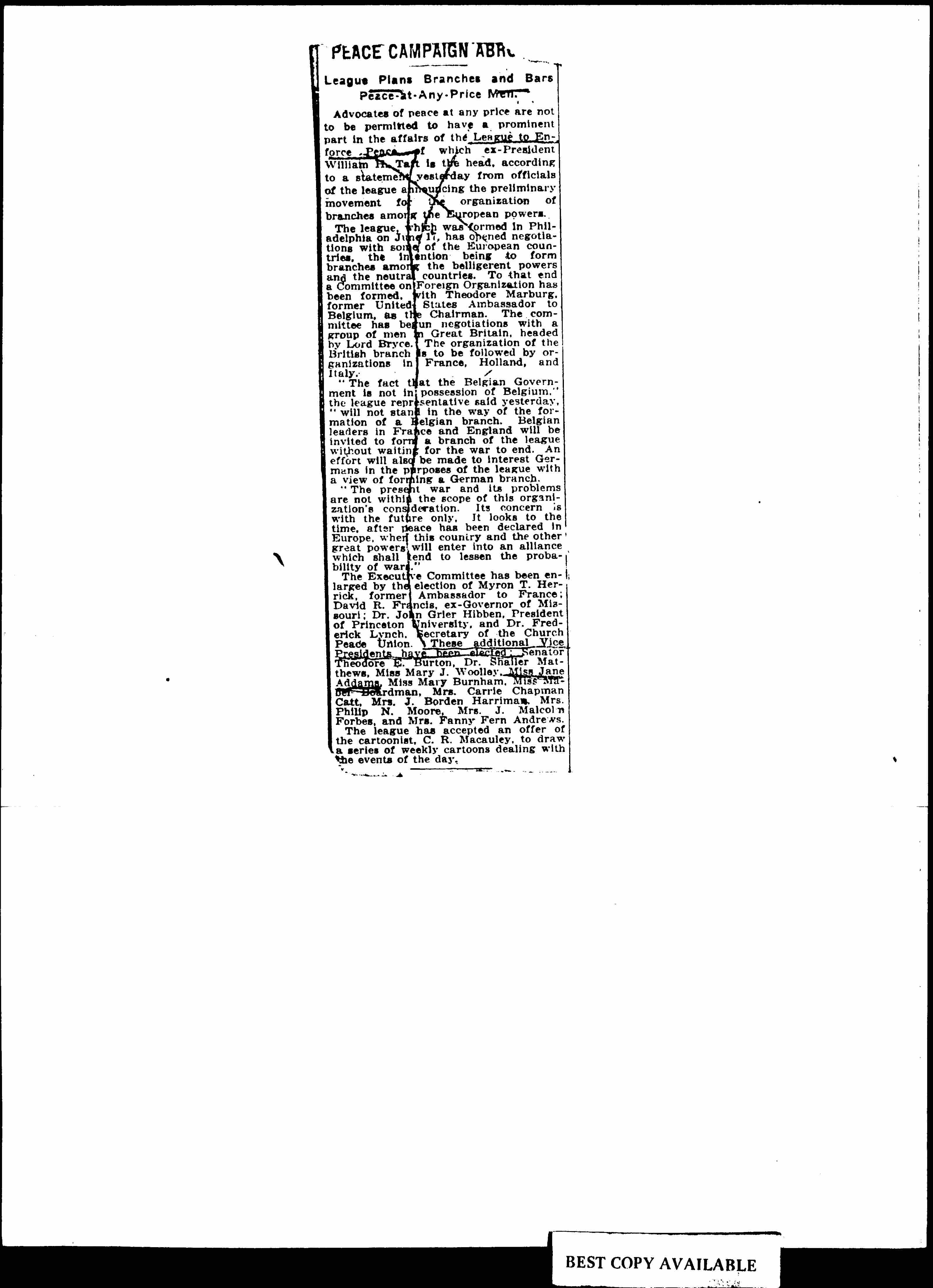"The present war and its problems are not within the scope of this organization's consideration. Its concern is with the future only. It looks to the time, after peace has been declared in Europe, when this country and the other great powers will enter into an alliance which shall tend to lessen the probability of wars."