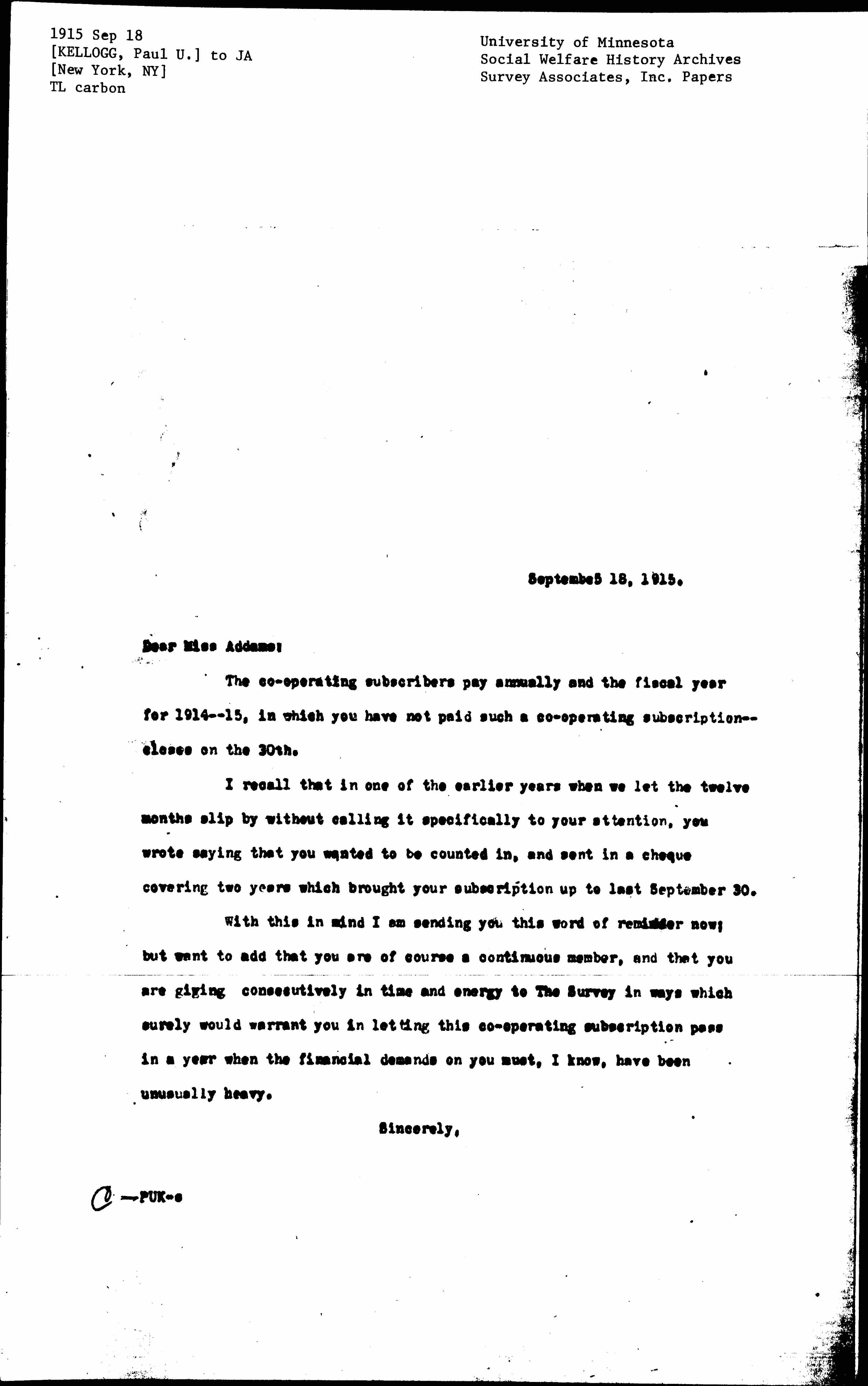 With this in mind I am sending you this word of reminder now; but want to add that you are of course a continuous member, and that you are giving consecutively in time and energy to The Survey in ways which surely would warrant you in letting this [cooperating] subscription pass in a year when the financial demands on you must, I know, have been unusually heavy.