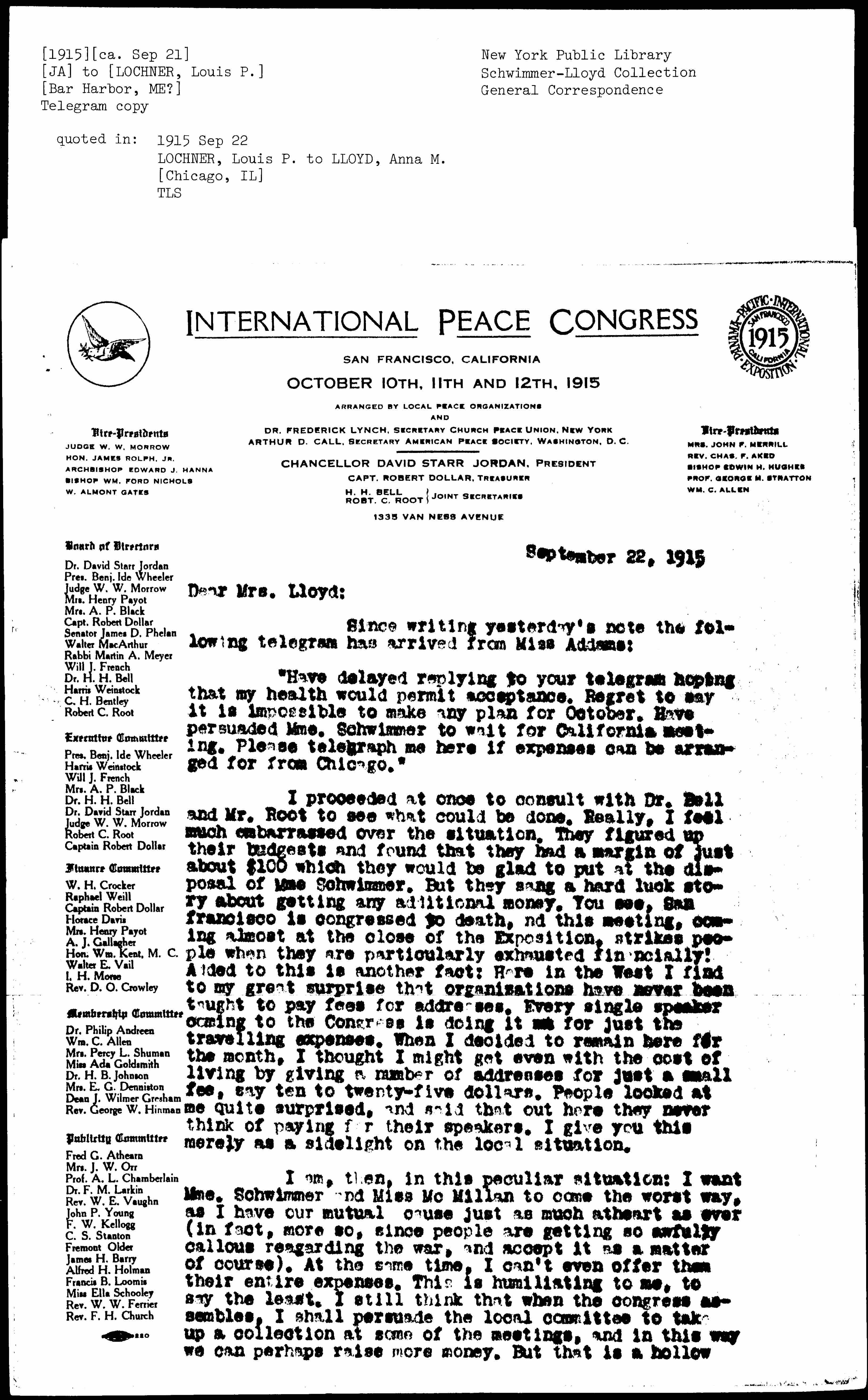 Have delayed replying to your telegram hoping that my health would permit acceptance. Regret to say it is impossible to make any plan for October. Have persuaded Mme. Schwimmer to wait for California meeting. Please telegraph me here if expenses can be arranged for from Chicago.