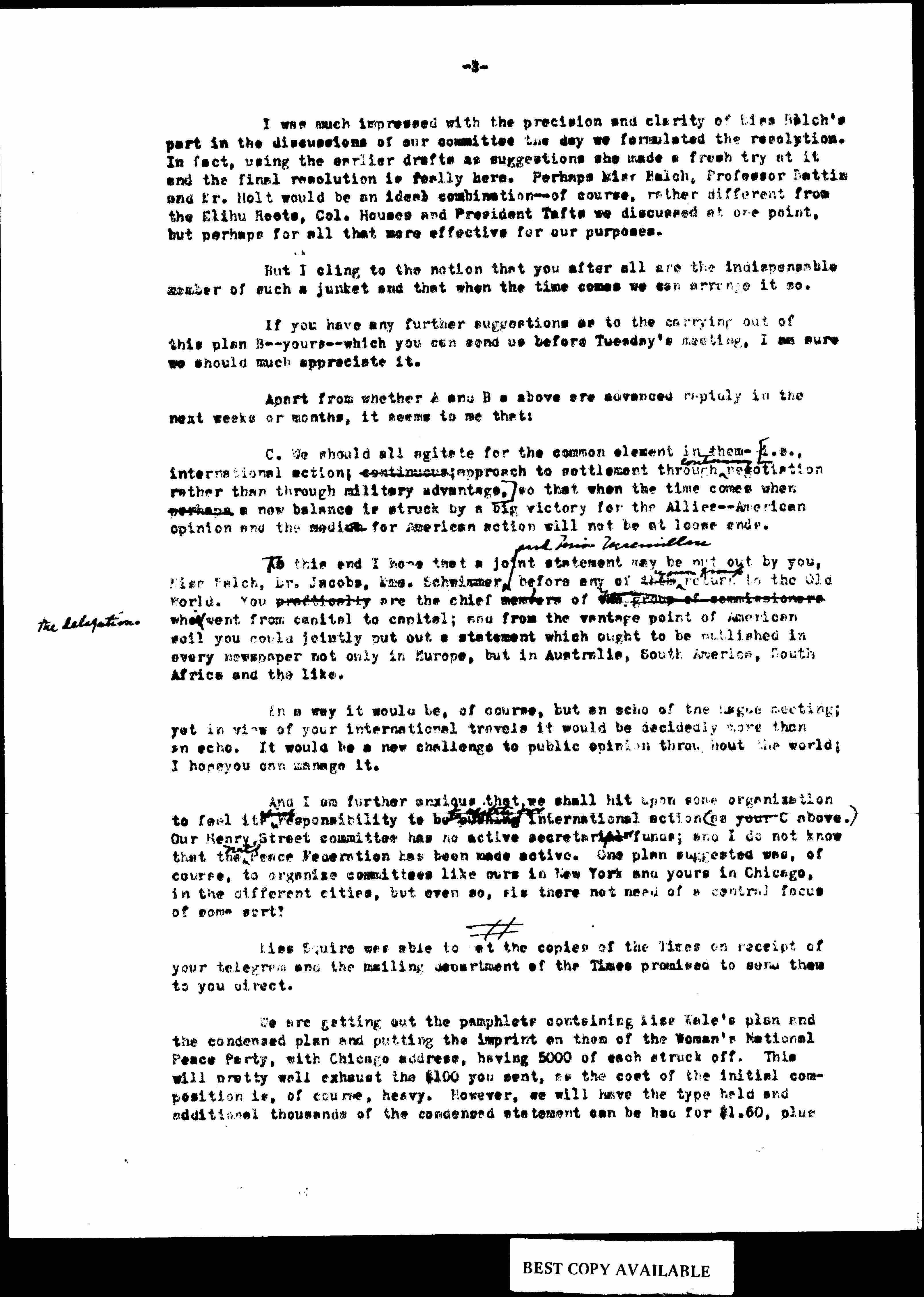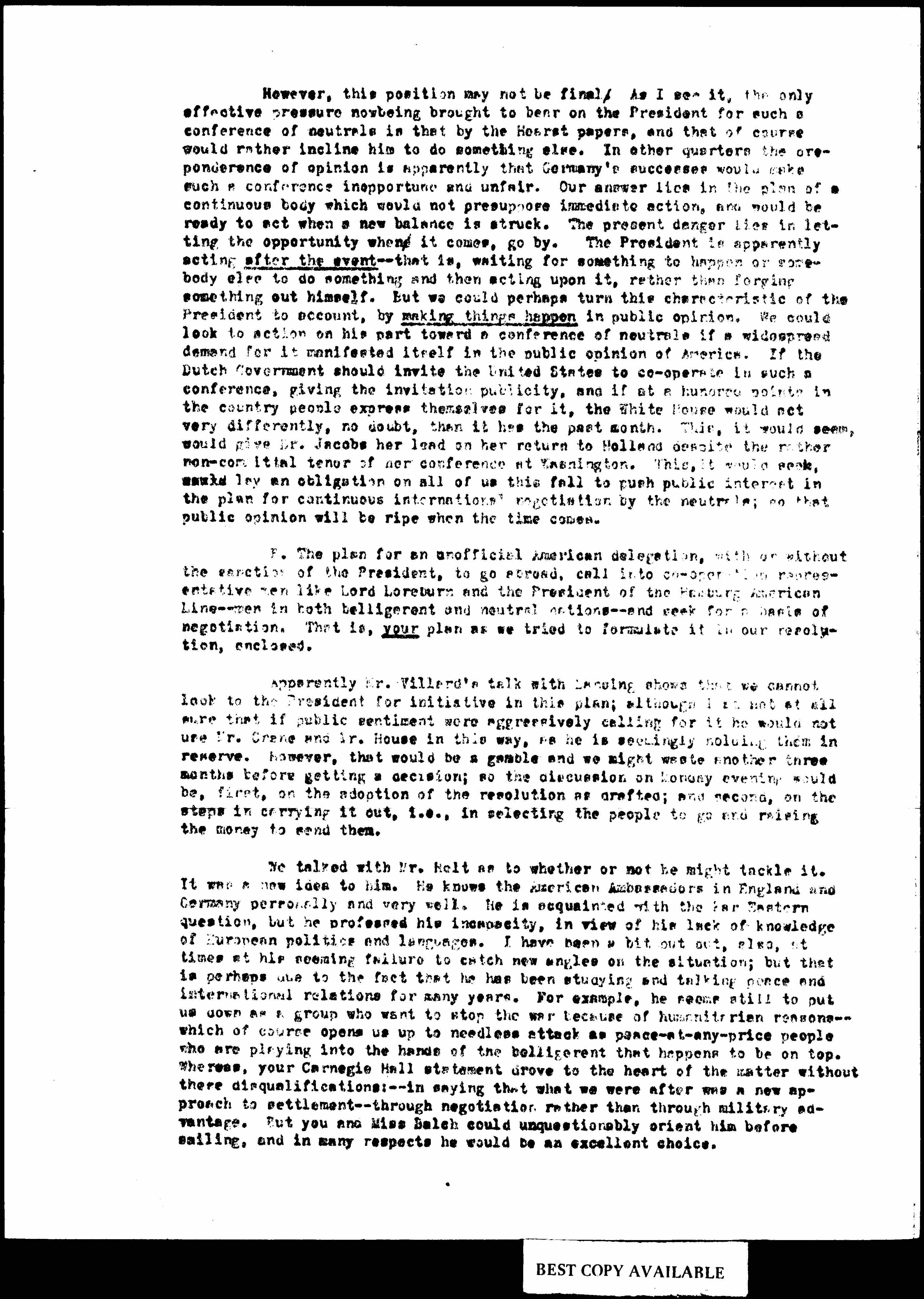We talked with Mr. Holt as to whether or not he might tackle it. It was a new idea to him. He knows the American Ambassadors in England and Germany [personally] and very well. He is acquainted with the Far Eastern question, but he professed his incapacity, in view of his lack of knowledge of European politics and languages. I have been a bit put out, also, at times at his seeming failure to catch new angles on the situation; but that is perhaps due to the fact that he has been studying and talking peace and international relations for many years. For example, he seems still to put us down as a group who want to stop the war because of humanitarian reasons -- which of course opens us up to needless attack as peace-at-any-price people who are playing into the hands of the belligerent that happens to be on top. Whereas, your Carnegie Hall statement drove to the heart of the matter without [these] disqualifications: -- in saying that what we were after was a new approach to settlement -- through negotiation rather than through military advantage. But you and Miss Balch could unquestionably orient him before sailing, and in many respects he would be an excellent choice. [page 3]