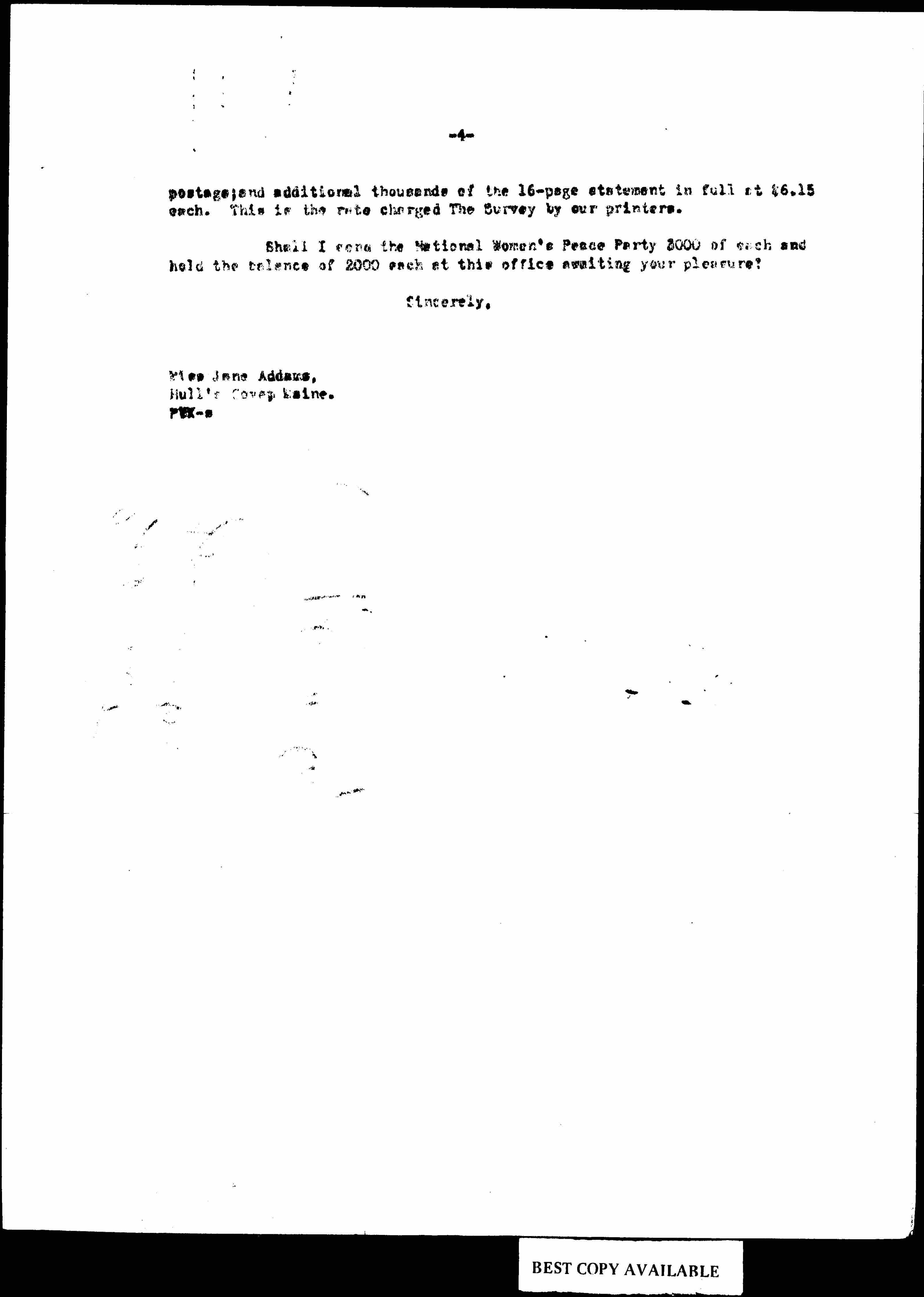 We are getting out the pamphlets containing Miss [Wales'] plan and the condensed plan and putting the imprint on them of the Woman's National Peace Party, with Chicago address, having 5000 of each struck off. This will pretty well exhaust the $100 you sent, as the cost of the initial composition is, of course, heavy. However, we will have the type held and additional thousands of the condensed statement can be had for $1.60, plus [page 4]