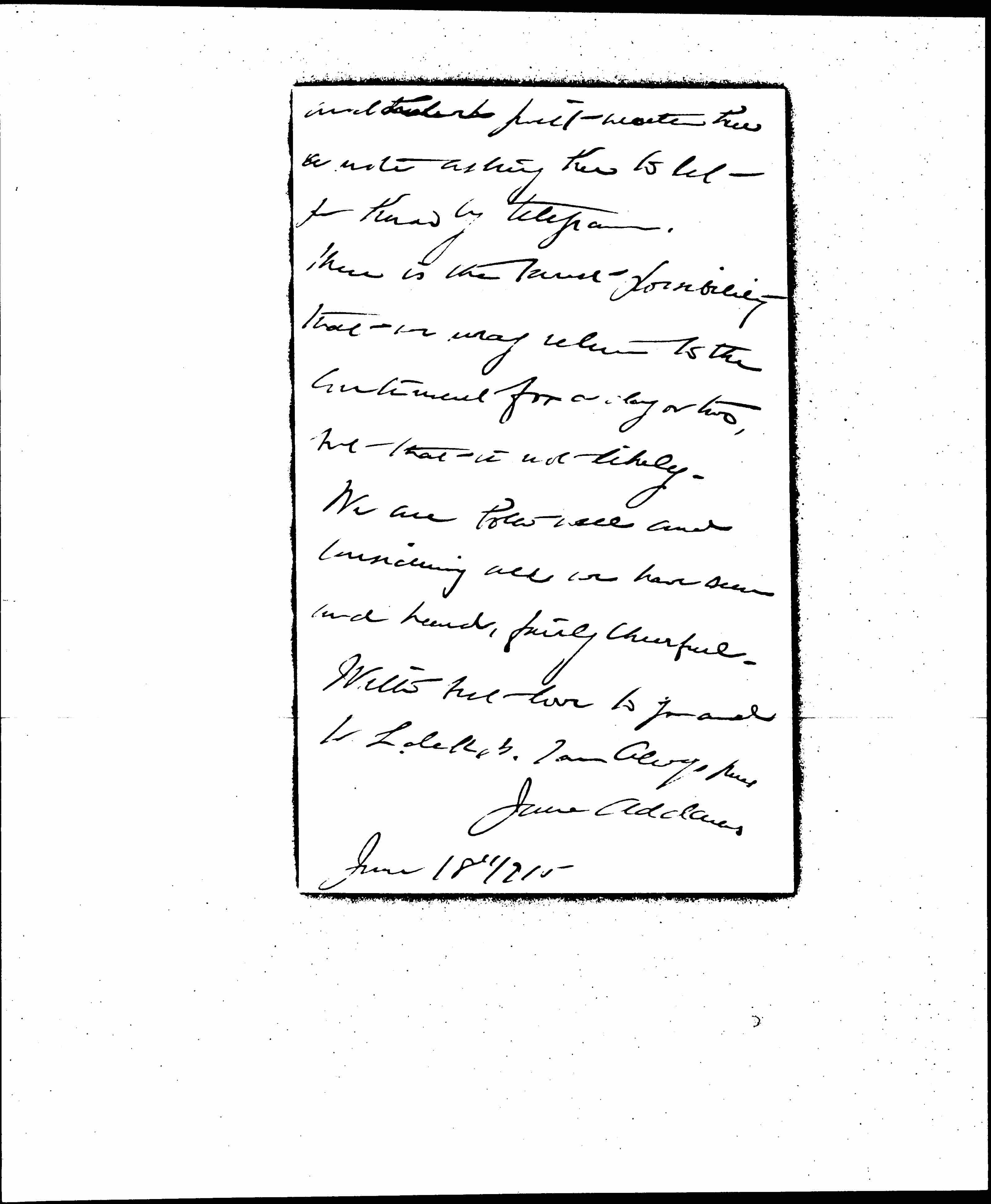 There is the [lowest] possibility that we may return to the continent for a day or two, but that is not likely. We are both well and considering all we have seen and heard, fairly cheerful.