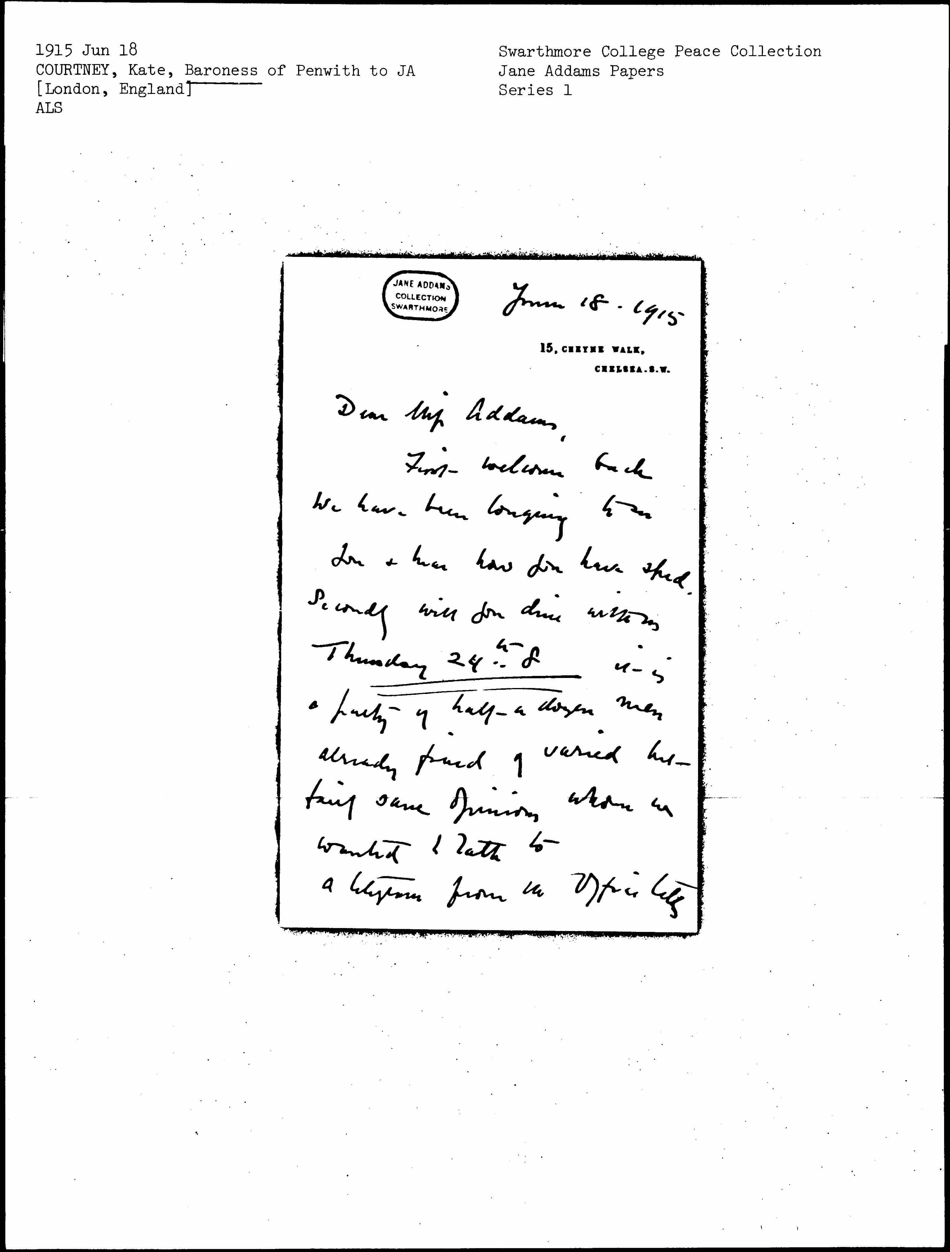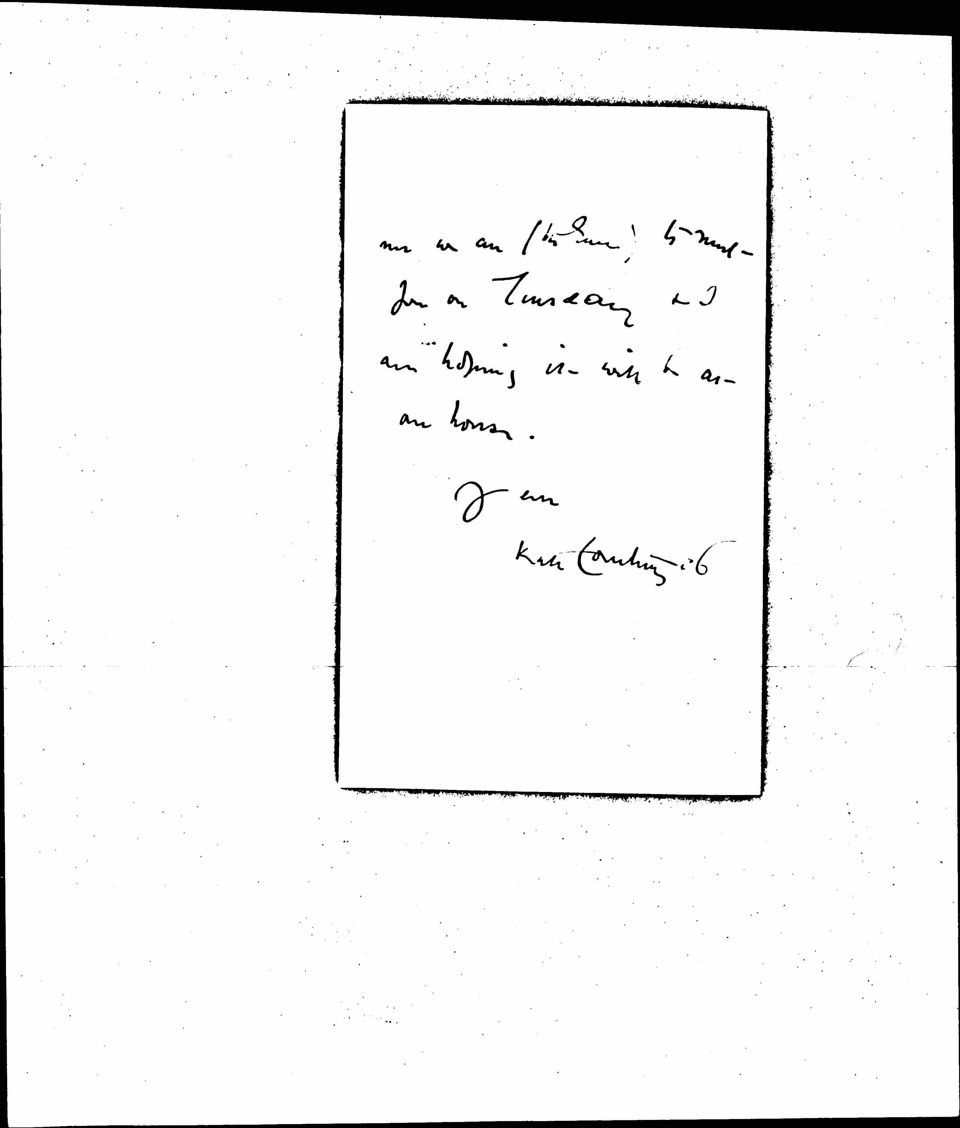 First welcome back. We have been longing to see you & hear how you have [sped?]. Secondly will you dine with us Thursday 24th 8 it is a party of half-a dozen men already [formed?] of varied but fairly sane opinions whom we wanted to talk to.