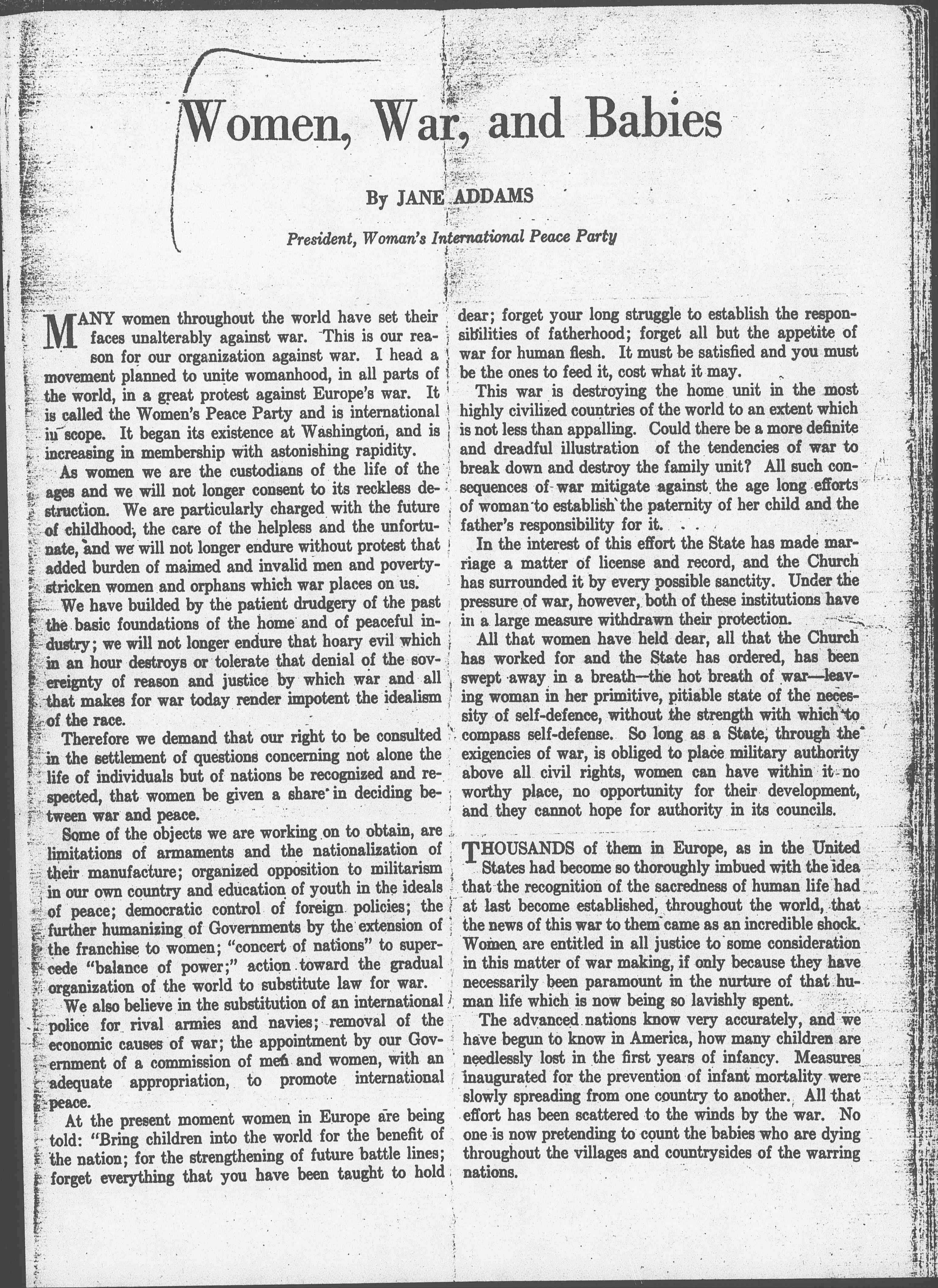 Therefore we demand that our right to be consulted in the settlement of questions concerning not alone the life of individuals but of nations be recognized and respected, that women be given a share in deciding between war and peace.