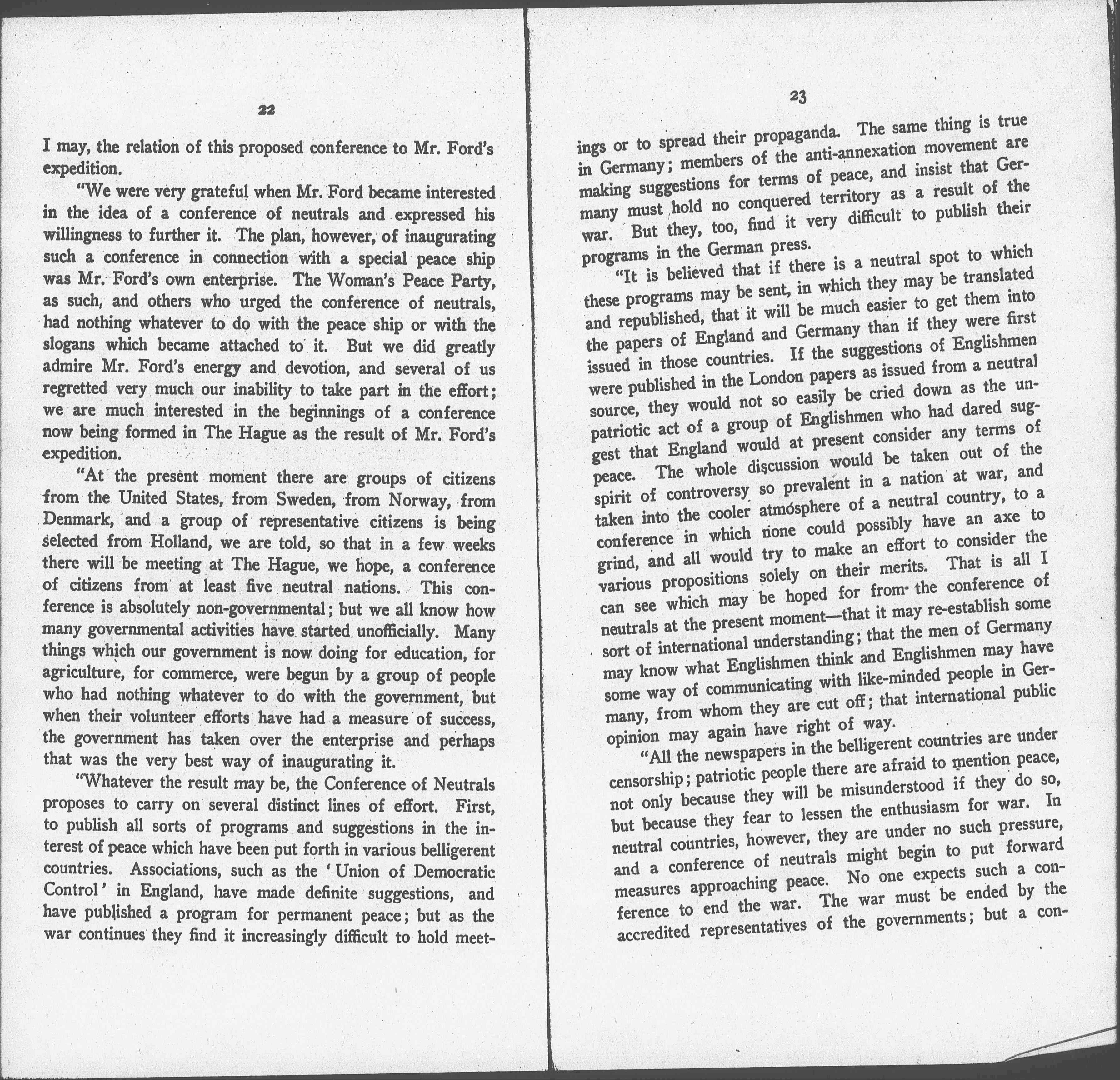 "We found, however, that the administration here, doubtless with the very best of reasons, felt that the time had not yet come for action, a decision concerning which we never for a moment felt critical as the Government has much more information than we have. As a result, however, of this decision there developed among the members of the Woman's Peace Party, as well as among other people, a plan for a possible conference of neutrals that should be [nongovernmental], not to take the place of a governmental conference but to prepare the way for it. I should like to explain, [page 2] if I may, the relation of this proposed conference to Mr. Ford's expedition.
