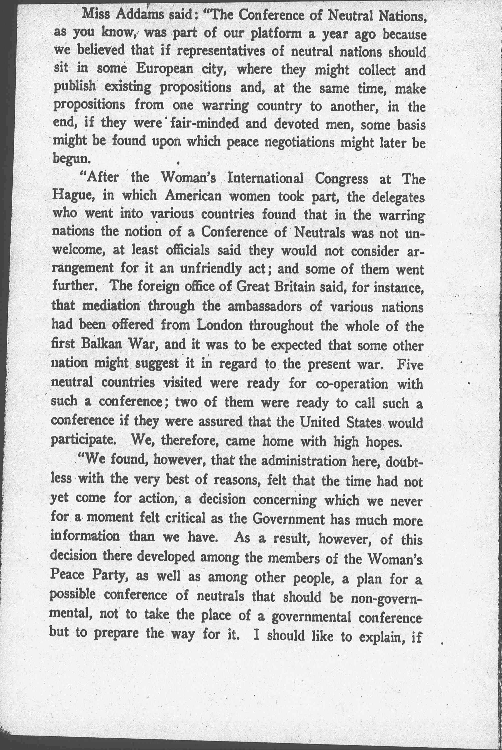 "After the Woman's International Congress at The Hague, in which American women took part, the delegates who went into various countries found that in the warring nations the notion of a Conference of Neutrals was not unwelcome, at least officials said they would not consider arrangement for it an unfriendly act; and some of them went further. The foreign office of Great Britain said, for instance, that mediation through the ambassadors of various nations had been offered from London throughout the whole of the first Balkan War, and it was to be expected that some other nation might suggest it in regard to the present war. Five neutral countries visited were ready for [cooperation] with such a conference; two of them were ready to call such a conference if they were assured that the United States would participate. We, therefore, came home with high hopes.