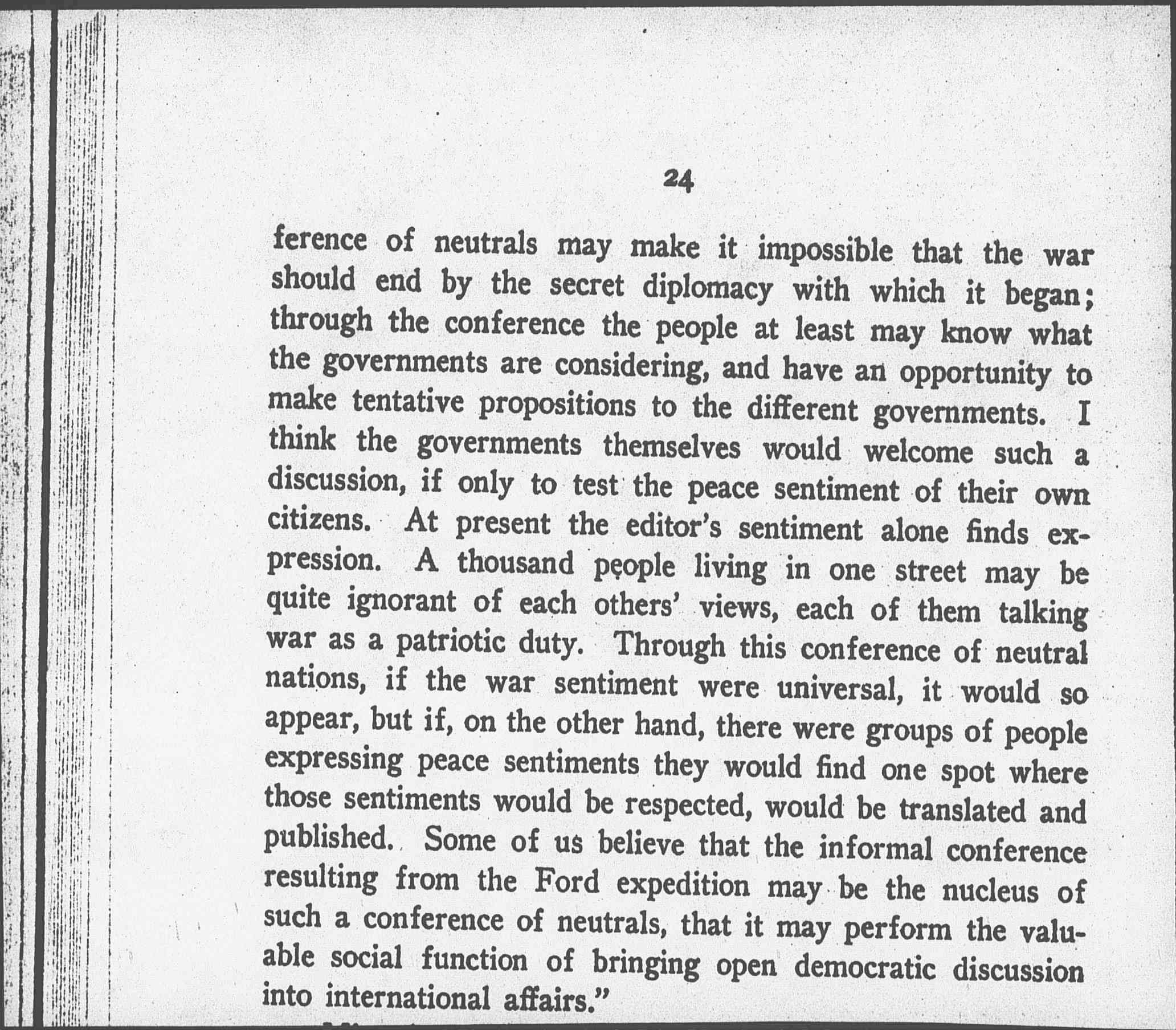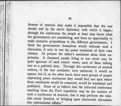 "All the newspapers in the belligerent countries are under censorship; patriotic people there are afraid to mention peace, not only because they will be misunderstood if they do so, but because they fear to lessen the enthusiasm for war. In neutral countries, however, they are under no such pressure, and a conference of neutrals might begin to put forward measures approaching peace. No one expects such a conference to end the war. The war must be ended by the accredited representatives of the governments, but a conference [page 4] of neutrals may make it impossible that the war should end by the secret diplomacy with which it began; through the conference the people at least may know what the governments are considering, and have an opportunity to make tentative propositions to the different governments. I think the governments themselves would welcome such a discussion, if only to test the peace sentiment of their own citizens. At present the editor's sentiment alone finds expression. A thousand people living in one street may be quite ignorant of each other's views, each of them talking war as a patriotic duty. Through this conference of neutral nations, if the war sentiment were universal, it would so appear, but if, on the other hand, there were groups of people expressing peace sentiments they would find one spot where those sentiments would be respected, would be translated and published. Some of us believe that the informal conference resulting from the Ford expedition may be the nucleus of such a conference of neutrals, that it may perform the valuable social function of bringing open democratic discussion into international affairs."
