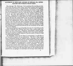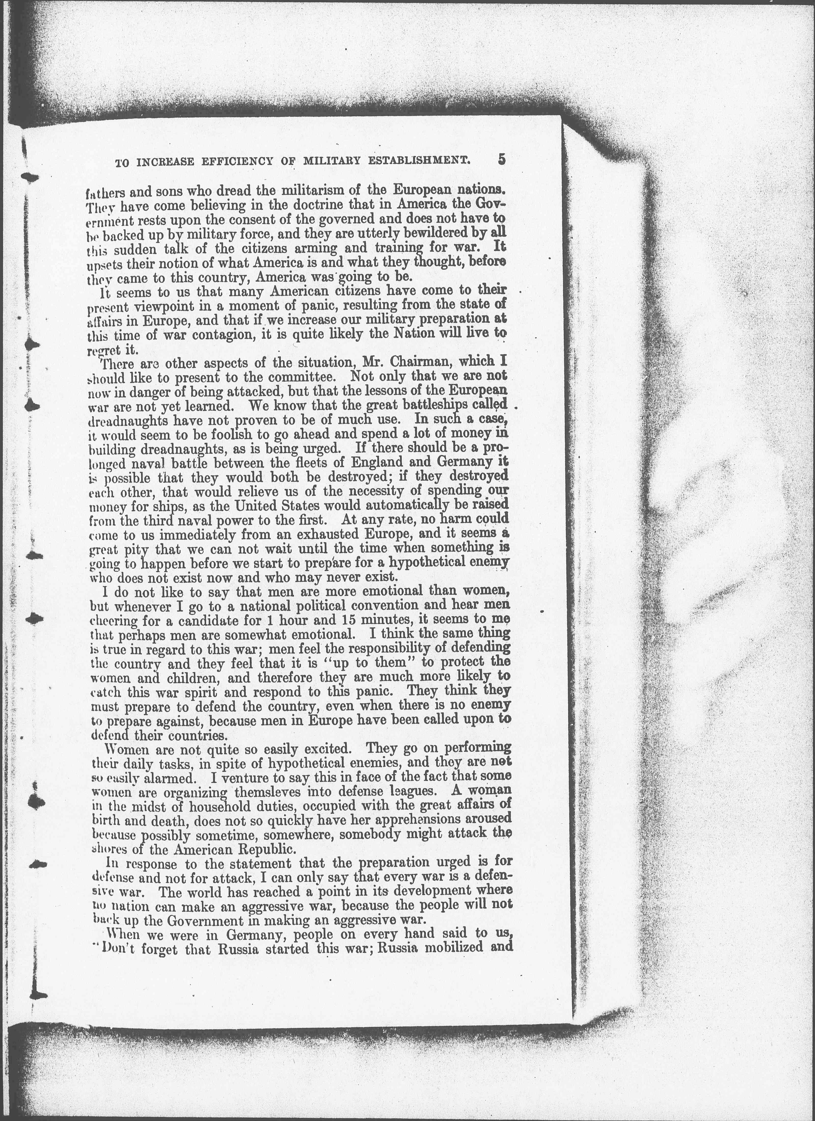 I think these are the suggestions which we desire to present to you this morning. I beg you, gentlemen, to believe that I am speaking not for myself alone, not even for the large membership of the Woman's Peace Party alone, but I am speaking for those women all over the country who [cannot] understand what has so suddenly turned public opinion in the direction of an increase for the Army and Navy, when even our hypothetical enemies are across the ocean, and nobody knows really that we have any enemies. These women [cannot] understand why the Government should want to "prepare" before there is need to contemplate any war.