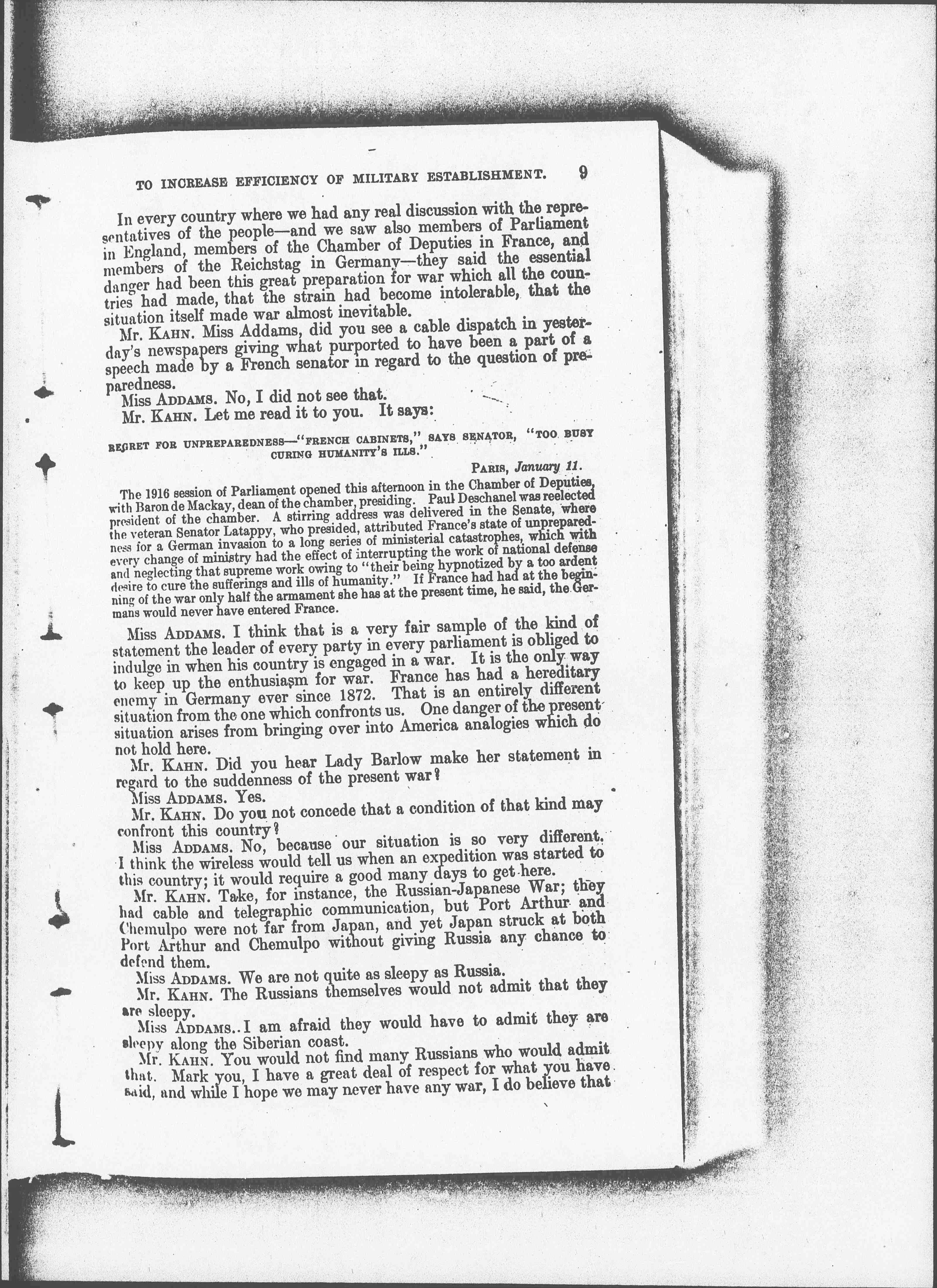 Mr. KAHN. Miss Addams, did you see a cable dispatch in yesterday's newspapers giving what purported to have been a part of a speech made by a French senator in regard to the question of preparedness.