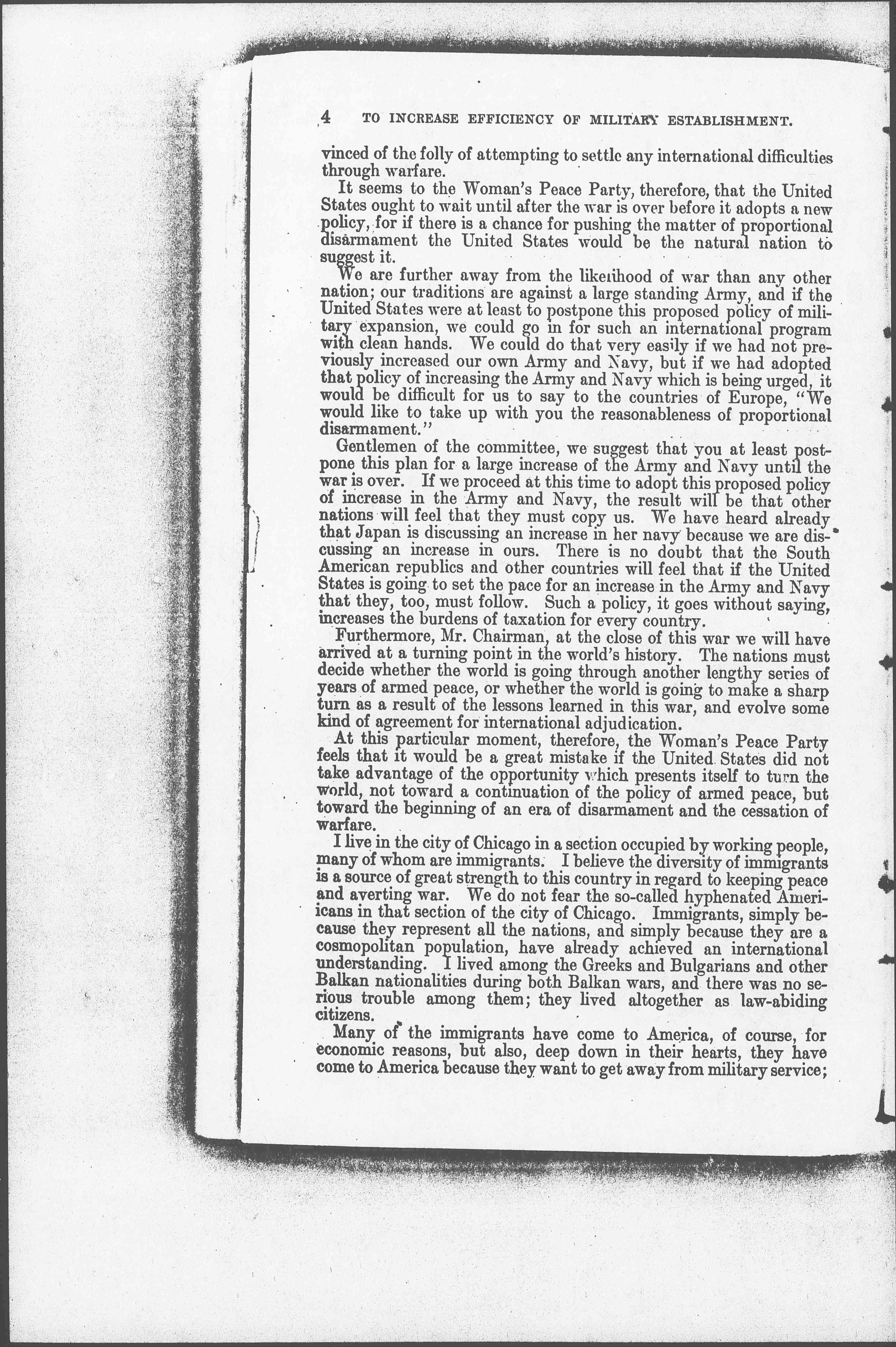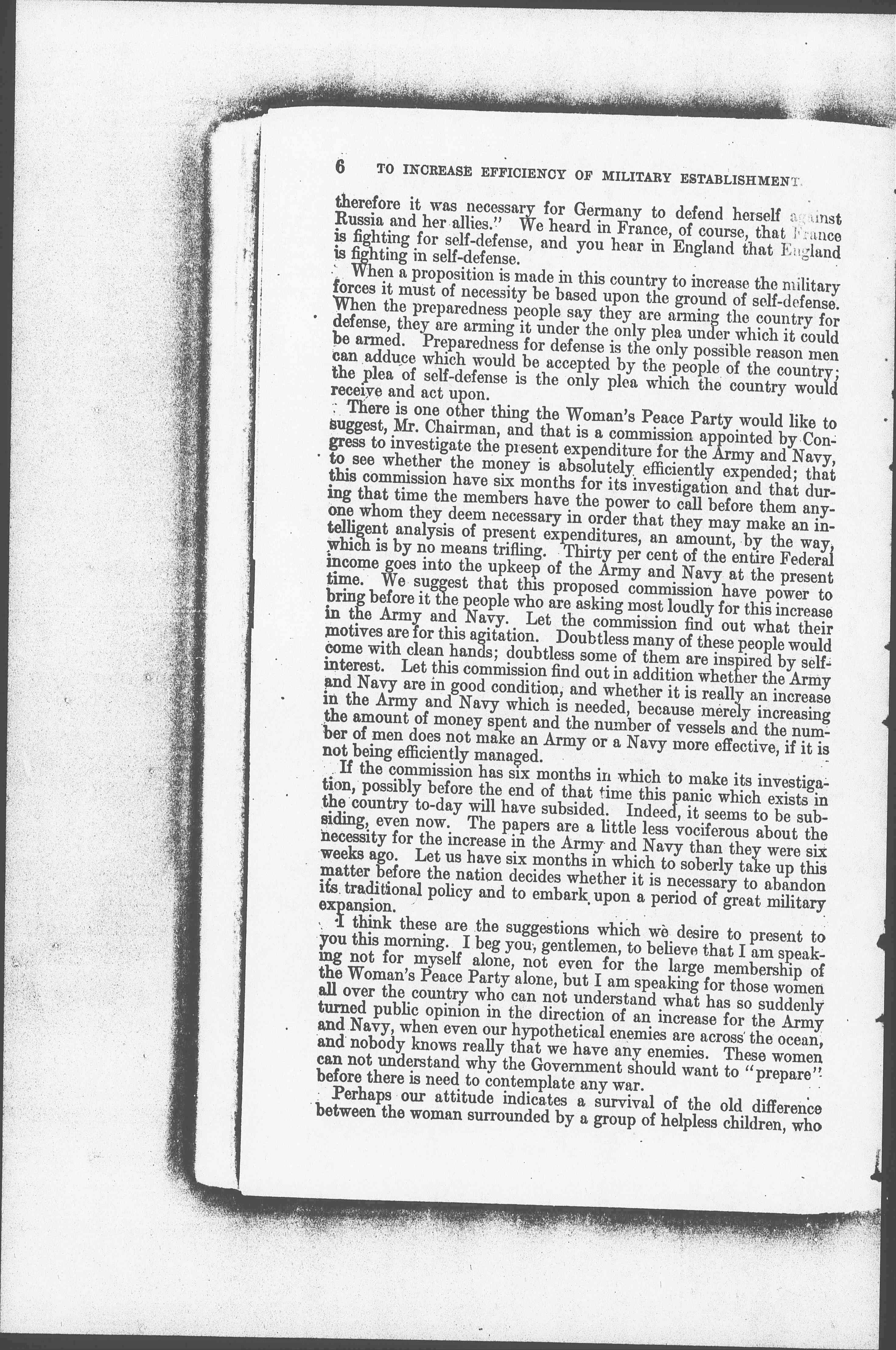 There is one other thing the Woman's Peace Party would like to suggest, Mr. Chairman, and that is a commission appointed by Congress to investigate the present expenditure for the Army and Navy, to see whether the money is absolutely efficiently expended; that this commission have six months for its investigation and that during that time the members have the power to call before them anyone whom they deem necessary in order that they may make an intelligent analysis of present expenditures, an amount, by the way, which is by no means trifling. Thirty [percent] of the entire Federal income goes into the upkeep of the Army and Navy at the present time. We suggest that this proposed commission have power to bring before it the people who are asking most loudly for this increase in the Army and Navy. Let the commission find out what their motives are for this agitation. Doubtless many of these people would come with clean hands; doubtless some of them are inspired by self-interest. Let this commission find out in addition whether the Army and Navy are in good condition, and whether it is really an increase in the Army and Navy which is needed, because merely increasing the amount of money spent and the number of vessels and the number of men does not make an Army or a Navy more effective, if it is not being efficiently managed.